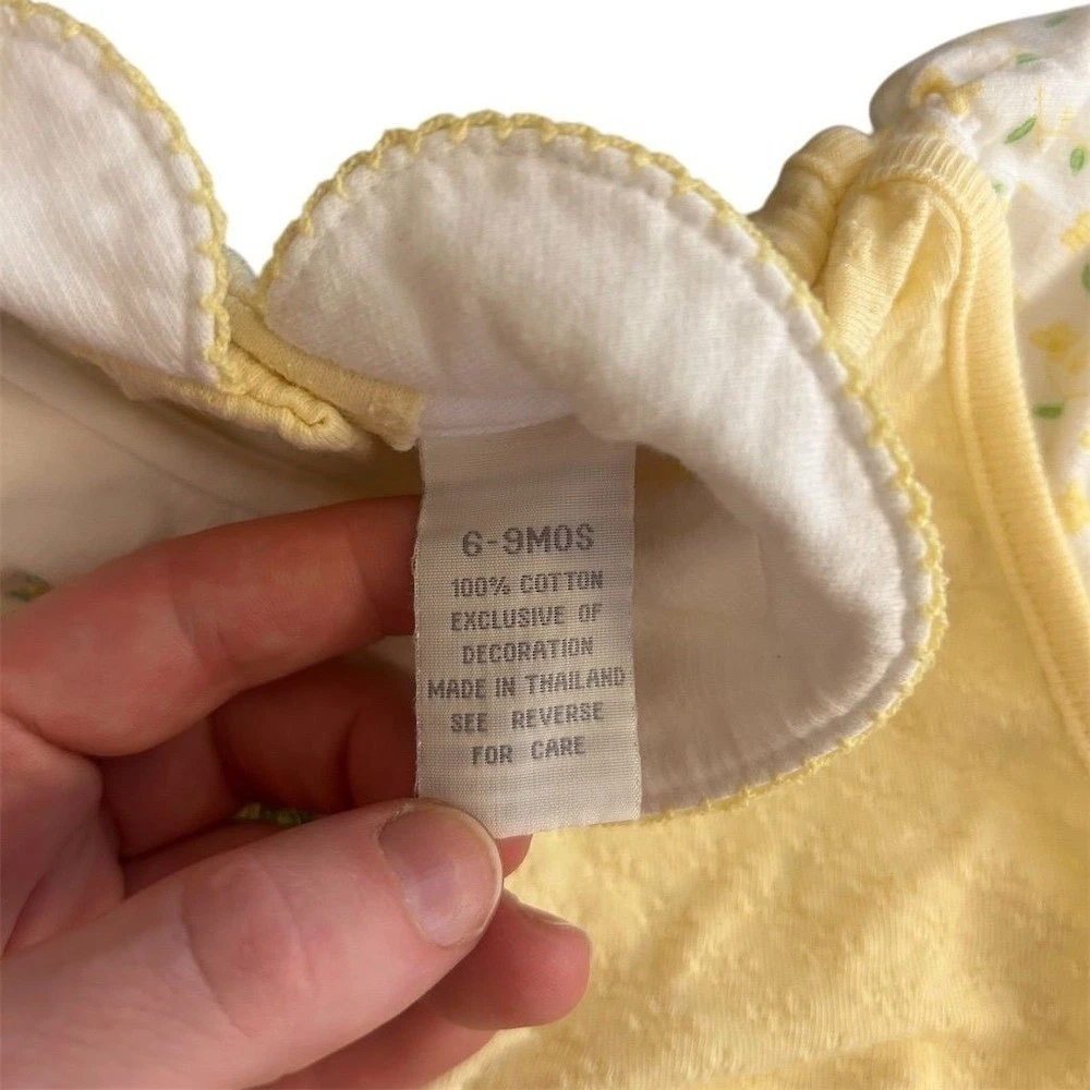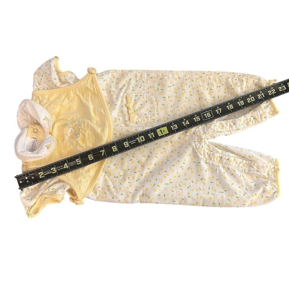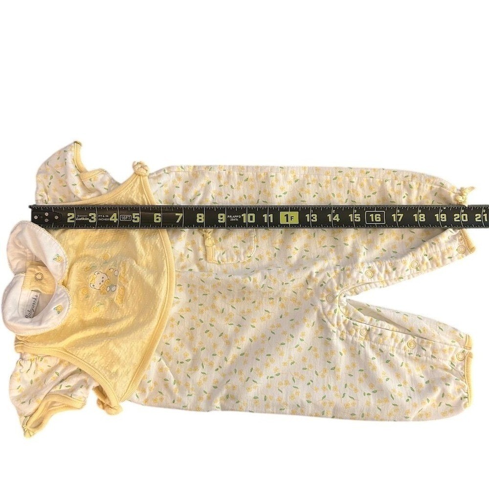 Babyworks baby girls yellow floral bear smocked romper jumpsuit. This adorable one-piece features a sweet teddy bear embroidery with the words "little flower" on the front bib. The romper has a delicate yellow floral print on a white background and is finished with ruffled cap sleeves and a Peter Pan collar. Perfect for playtime or a special occasion. Measurements: • Waist: 11 in • Inseam: 9 in • Length (shoulder to crotch): 17 in • Length (shoulder to ankle): 23 in Department: Unisex Baby & Toddler Style: Romper Character: Bear All items come from a smoke free, pet friendly home. All of items unless NWT or Dry Clean Only are washed with Tide. We try our best to disclose any flaws with items, if we miss something please reach out and let us know. We offer combined shipping on all our items.