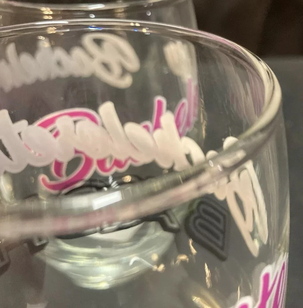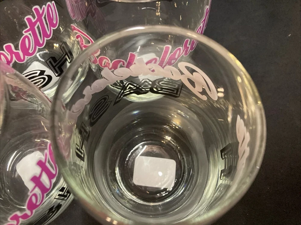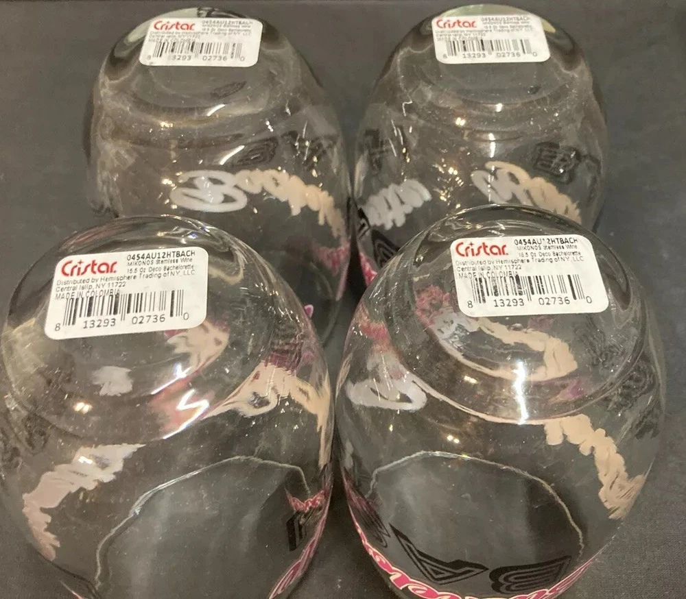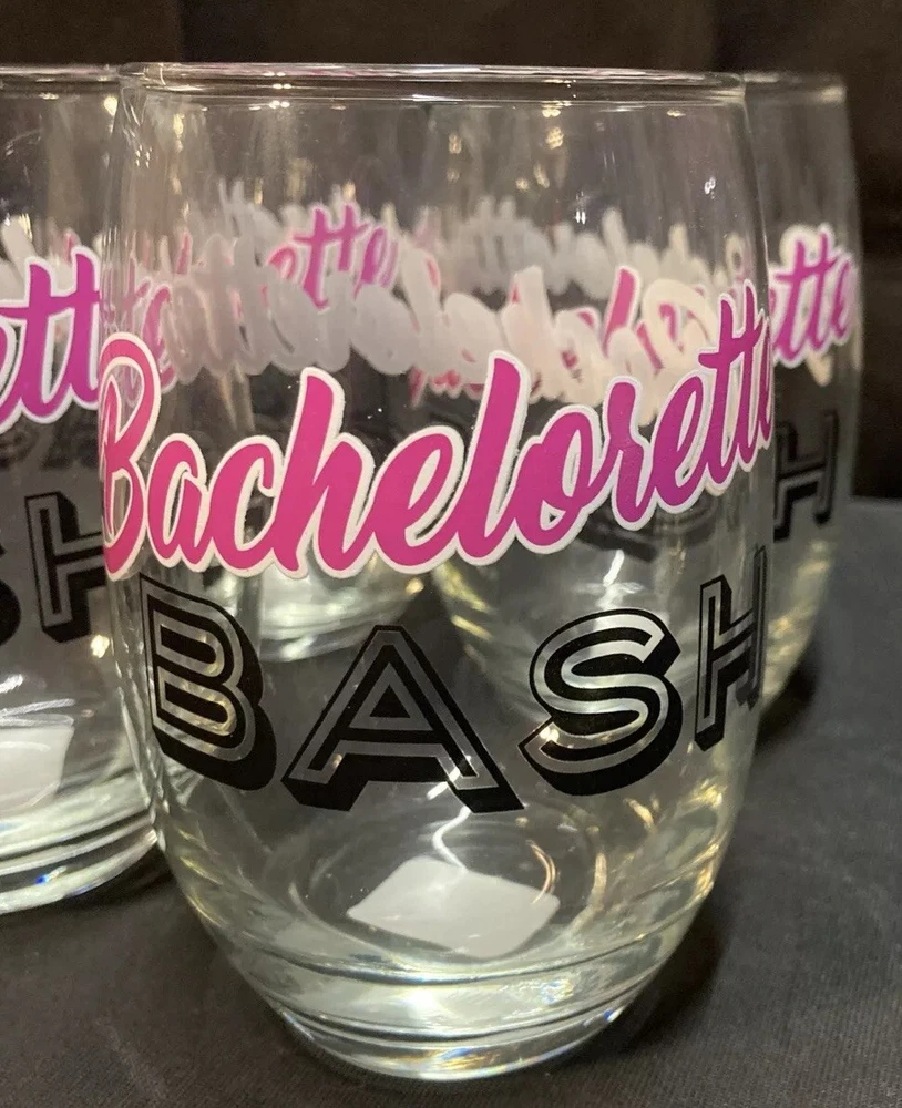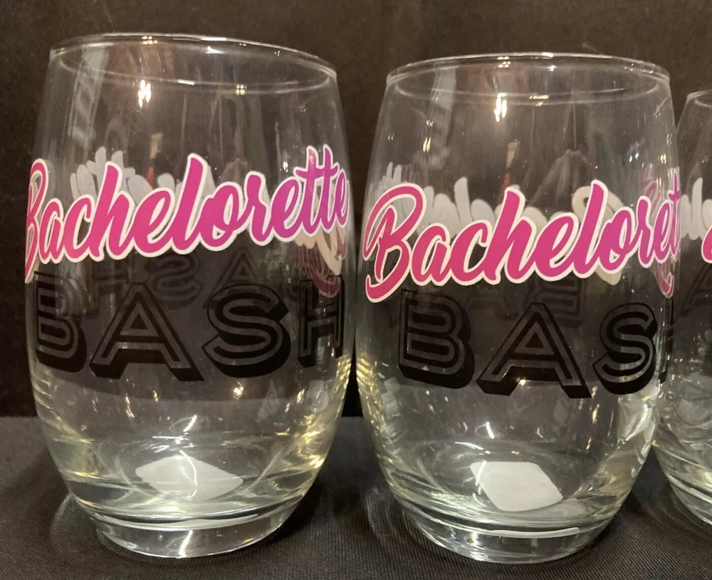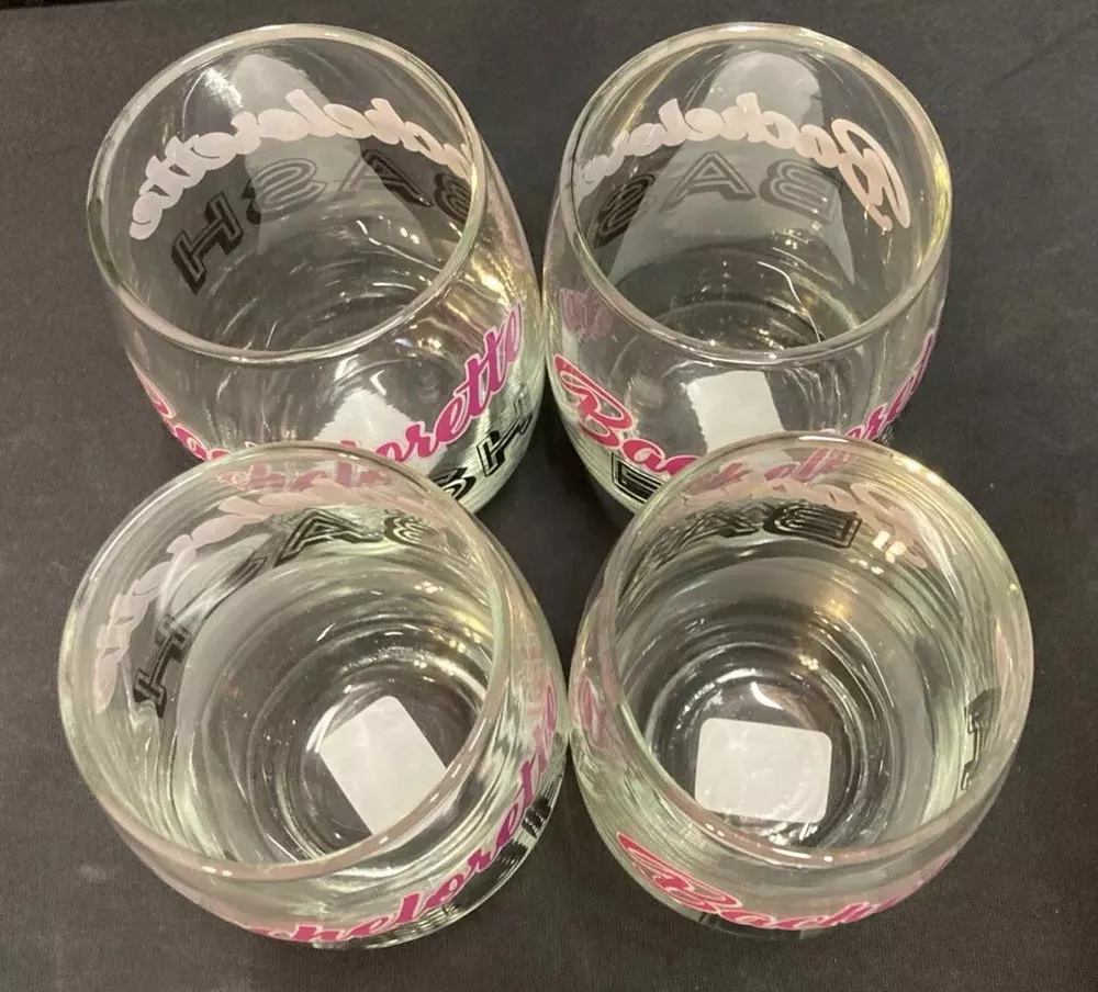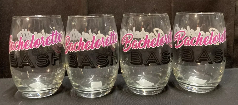 This set of 4 stemless wine glasses measure 5” tall and feature the phrase Bachelorette Bash. Each glass holds 16 fluid ounces. The set is pre-owned but has never been used. The glasses come in good, clean condition with no chips, cracks, or breaks. Please see pictures for details. If you have any questions or concerns, please do not hesitate to contact us. Check out our other items and message us if interested in more than one listing as combining items could save you money on shipping.