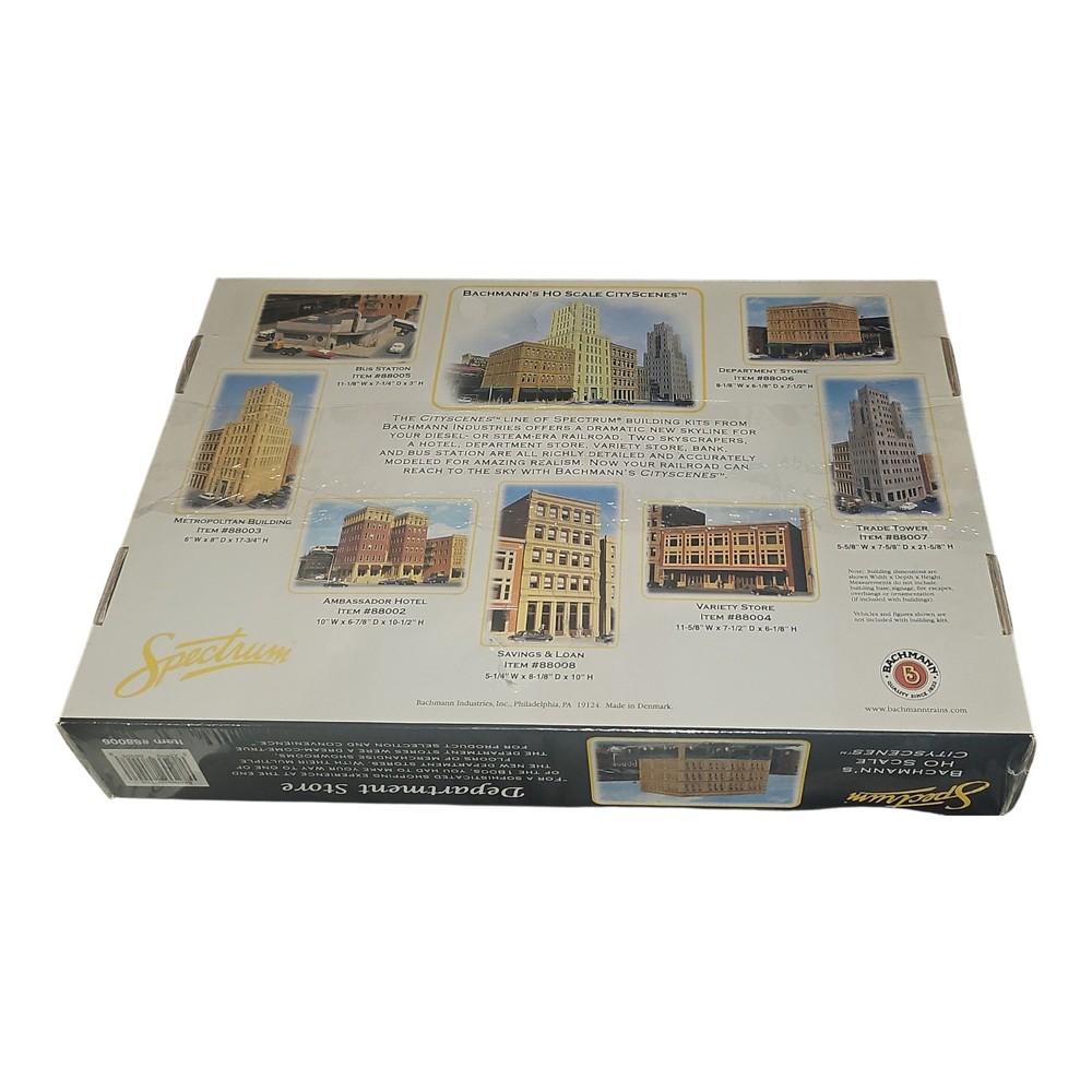 The Bachmann 88006 Spectrum Department Store CityScenes Building Kit in HO Scale is a beautifully detailed and painted commercial building made of wood and plastic. This multicolored structure stands at 2 inches tall and is perfect for adding to your train layout or for creating a realistic backdrop for your transportation-themed display. Manufactured in 2001 by the renowned brand Bachmann, this kit is suitable for enthusiasts aged 17 years and up who enjoy creating intricate city scenes.