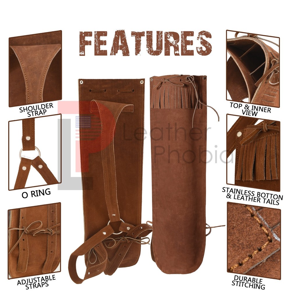 GENUINE LEATHER: Leather is specially designed and manufactured to provide the highest quality raw materials. This Archery Quiver is made with genuine leather that will give the best quality and durability for the quiver. Quiver straps are also made of leather. DETACHABLE AND ADJUSTABLE STRAP: It features a detachable strap that offers comfortability. The size of this hip quiver has a 20-inch deep arrow compartment. The shoulder strap can be adjustable according to your body. The product is perfect for professional archery equipment. BEST FIT & RESTFUL: The adjustable straps and belts will help you to give the best fit and comfortable positioning of the quiver to the archer. This quiver made it easy to draw and place arrows quickly. The lightweight solution will help to keep the archery more comfortable. It's very comfortable as a compound bow case. TOP-QUALITY: The basic material used is high-quality leather which gives high durability to the product. 100% SATISFACTION GUARANTEE: we care about our customers and give them top-quality archery equipment and accessories. We stand by our products. We believe in the quality of our archery quivers and the satisfaction of our customers is our priority.