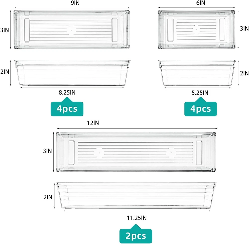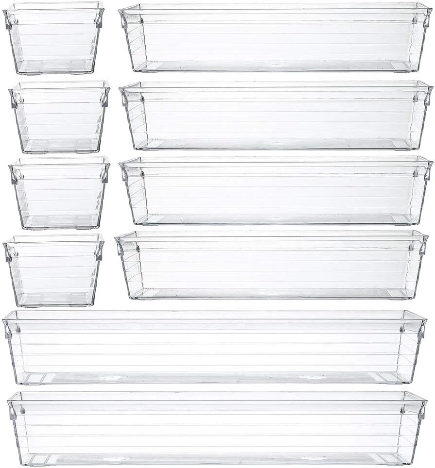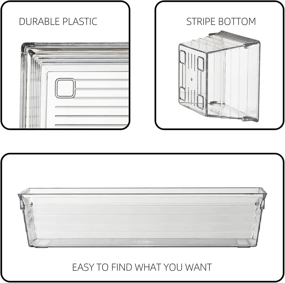 Backerysupply Clear Plastic Drawer Organizer Tray for Vanity Cabinet Product Details Specific Uses For Product: Cosmetics Material: Plastic Special Feature: Durable Color: Clear Brand: Backerysupply Finish Type: Acrylic,Glossy Shape: Rectangular Capacity: 12 Liters Number of Items: 10 Maximum Weight Recommendation: 22 Pounds Manufacturer: Backerysupply Package Dimensions: 12.7 x 5.6 x 3.4 inches Item Weight: 1 pounds Finish types: Acrylic,Glossy Batteries required: No Mounting TypeItem Weight: Insert Mount16 ounces Number of CompartmentsUnit Count: 1010 Count Includes:(2) 12 L x 3 W x 2 H in, (4) 9 L x 3 W x 2 H in, and (4) 3 L X 3 W X 2 H Material: Acrylic(Plastic) Features: Clear ,Easy to Clean,Eco-friendly,Transparent,BPA Free,Unbreakable,Recycled. Mix and match for any drawer size and storage need. Packing: bubble pack + plastic wrap +Outer Catrton