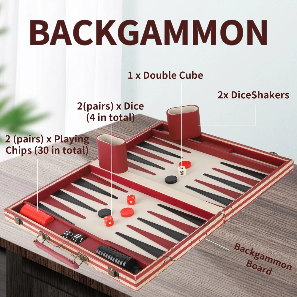 American flag design. Make America Great Again. Qulity leather covered. Classic backgammon game ideal family game night playing. Perfect Size : OPEN 15*19*1INCHI CLOSE 15*9*2INCH Package Includ: Backgammon Board, 2 (pairs) x Playing Chips (32 Backgammon Pieces in total), 3 (pairs) x Dice (4 in total), 1x Double Coub, 2 x Dice Shackers and detailed instructions .