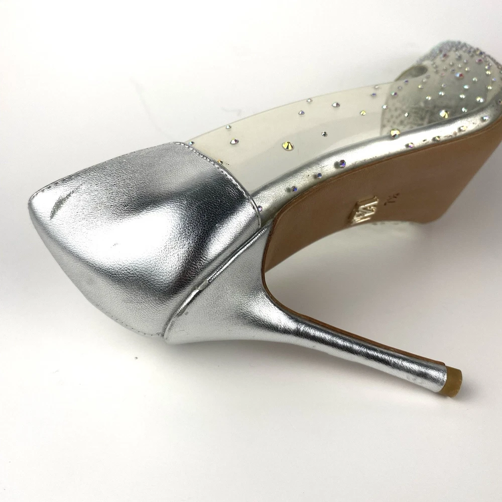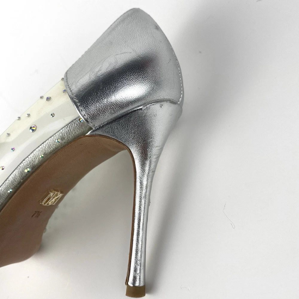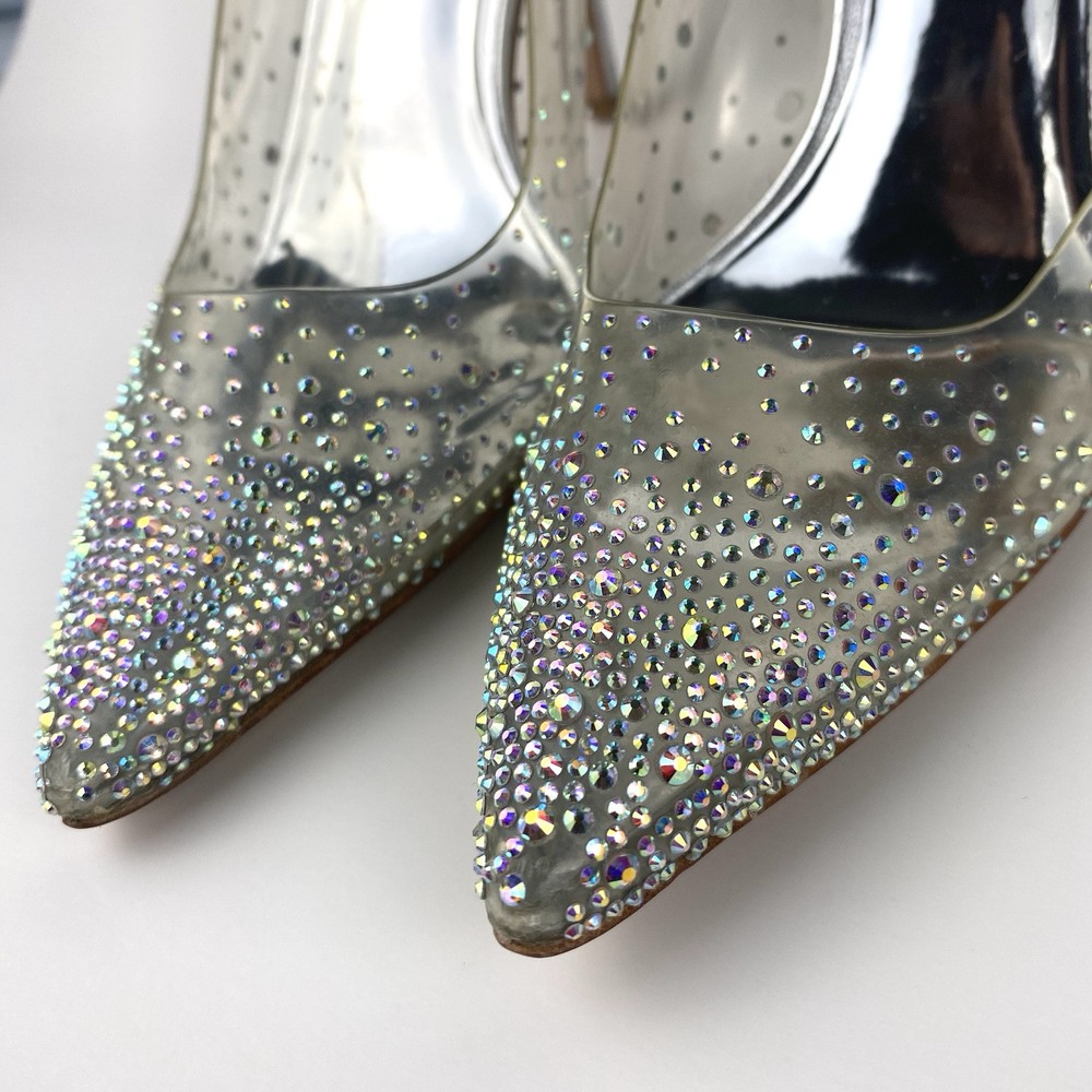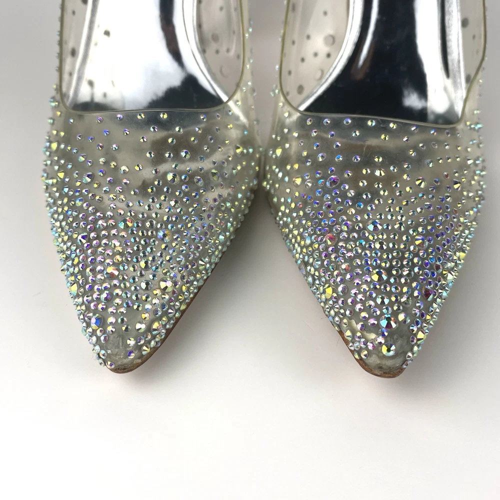 Hollywood glamour.!! Women's size 7 1/2 heels designed by Badgley Mischka, an American fashion label founded in 1988 by Mark Badgley and James Mischka. The brand is known for designs influenced by 1940s Hollywood glamour, with simple and streamlined aesthetics. These heels showcase a pointed-toe silhouette, transparent vamps, and embellishments of rhinestones, evoking a glamorous and elegant style suitable for evening wear or special occasions. Preowned so wear on both back heels and bottoms as shown in pictures.