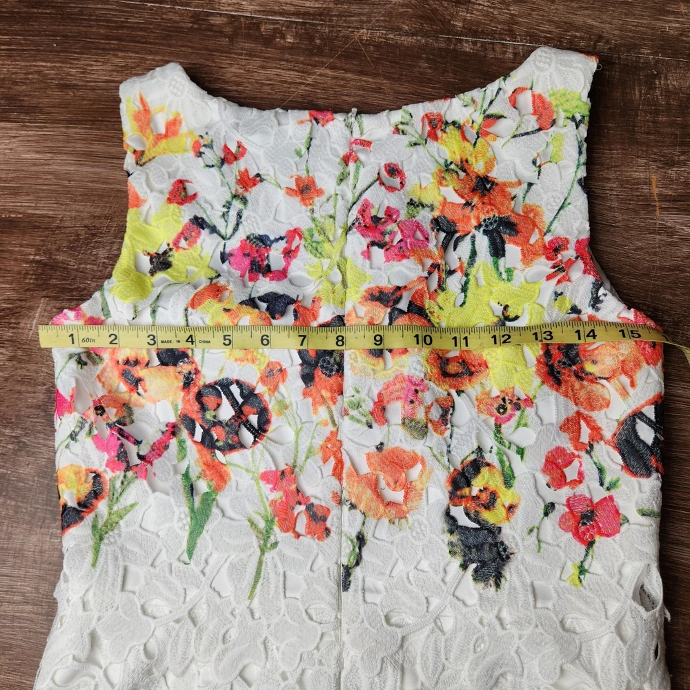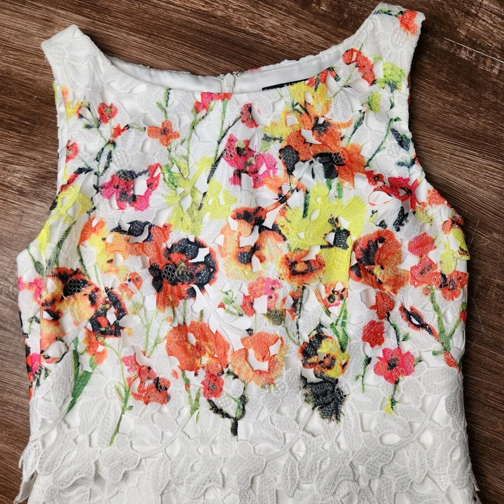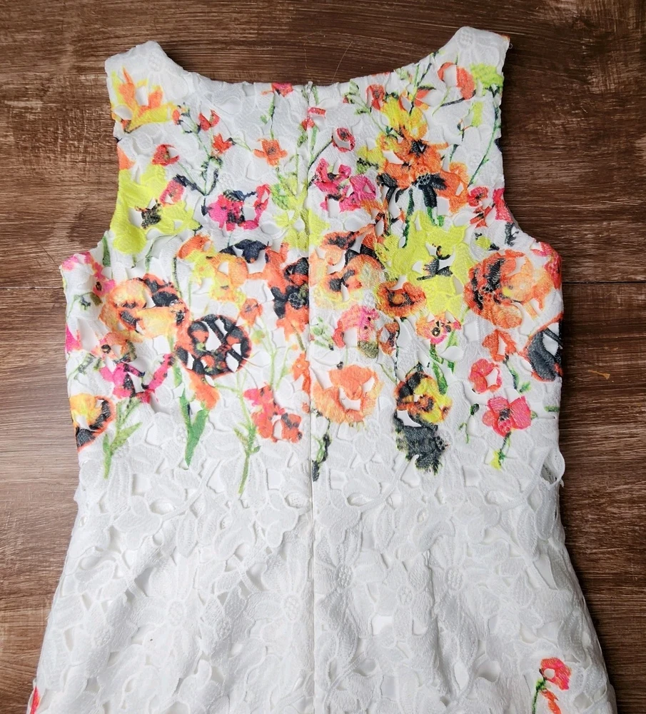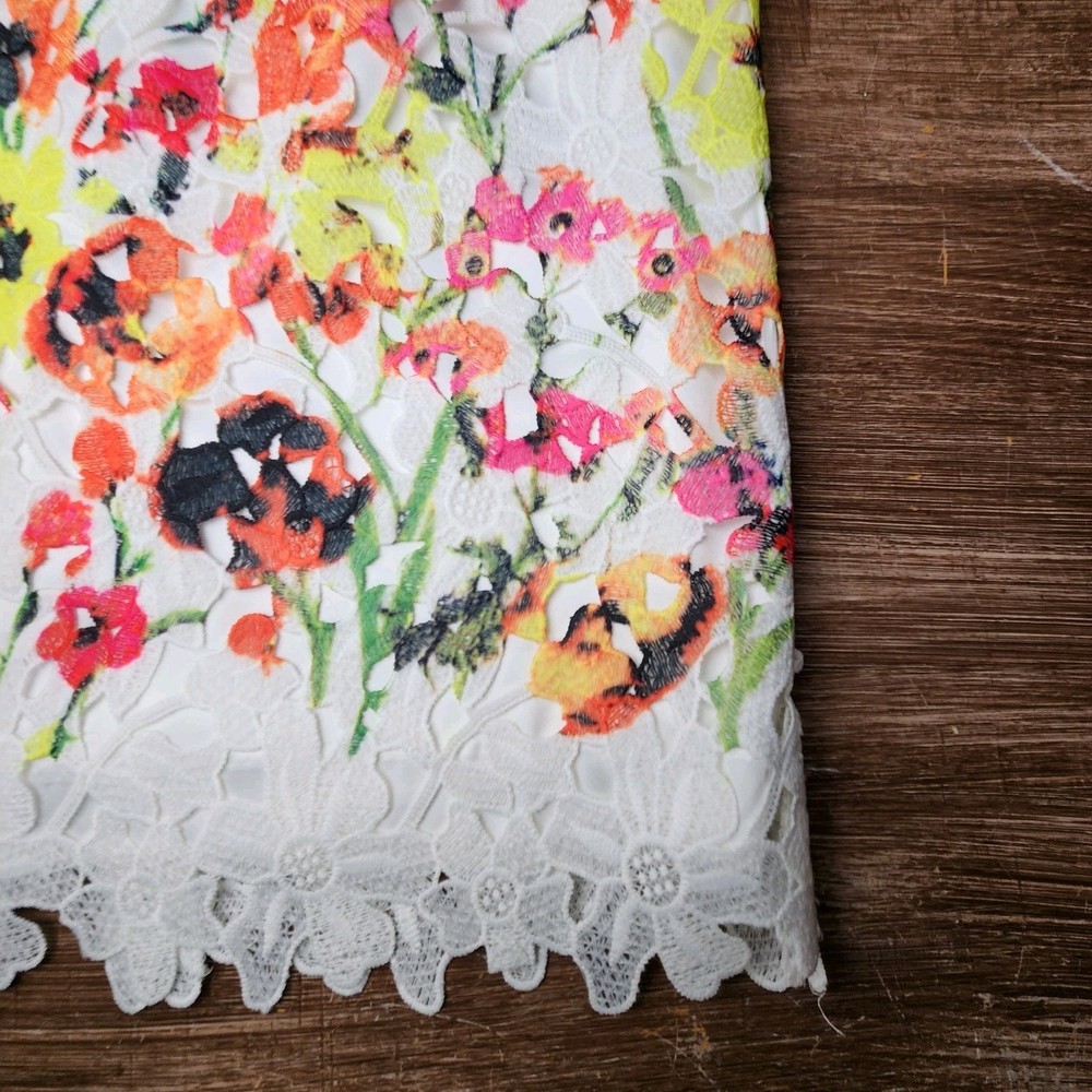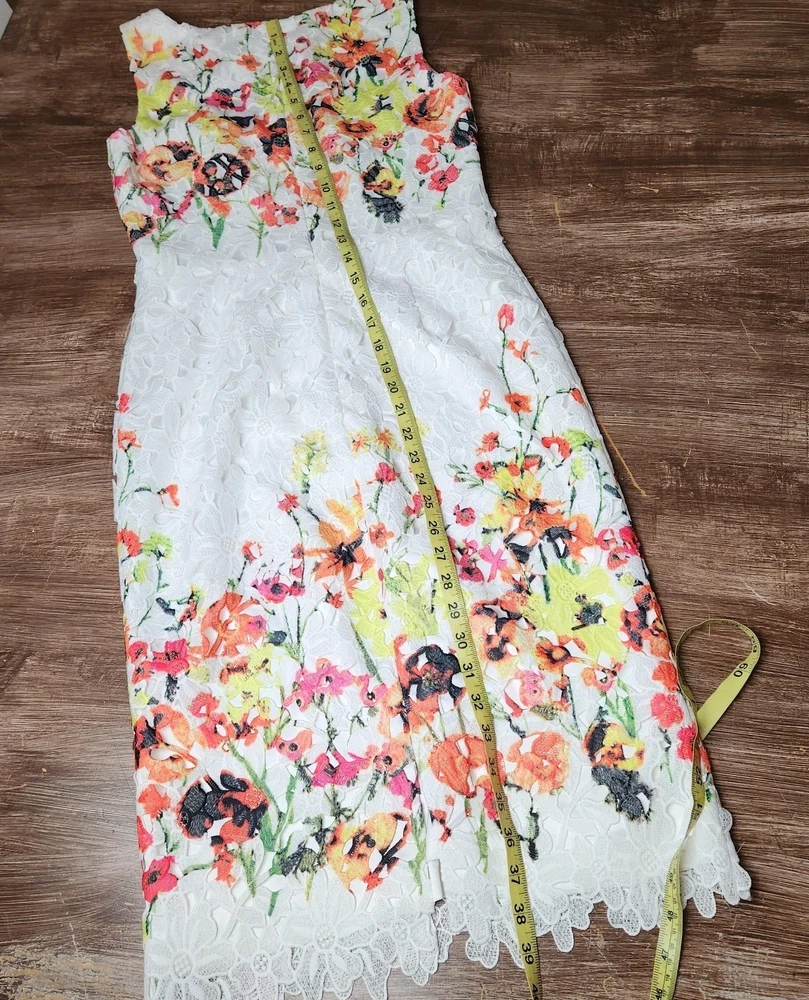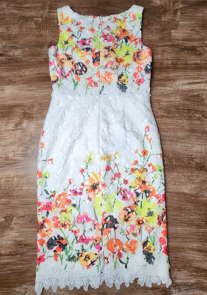 The Badgley Mischka Floral White Lace Overlay Crochet Sheath Dress in size 4 is a feminine and elegant choice for various occasions. The dress features a floral pattern, sleeveless design, and a knee-length silhouette, making it suitable for bridal showers, parties, or even workwear. The crochet accents add a touch of sophistication to the pink dress, which exudes a Belle-like charm. This bodycon sheath dress by the renowned brand Badgley Mischka is perfect for those who appreciate a classic and feminine style with a modern twist. Absolutely beautiful. Bright colorful flowers on white lace overlay. Excellent