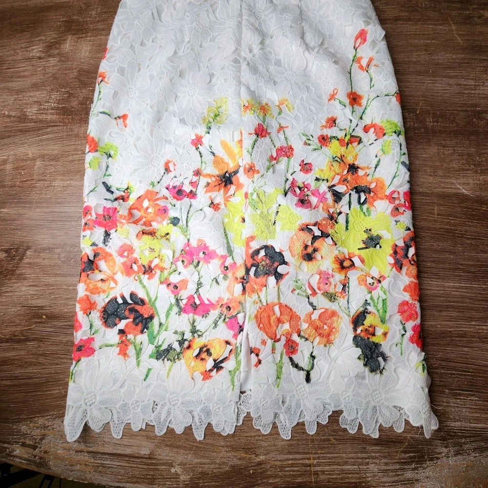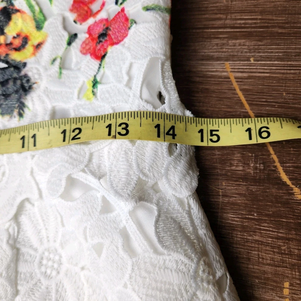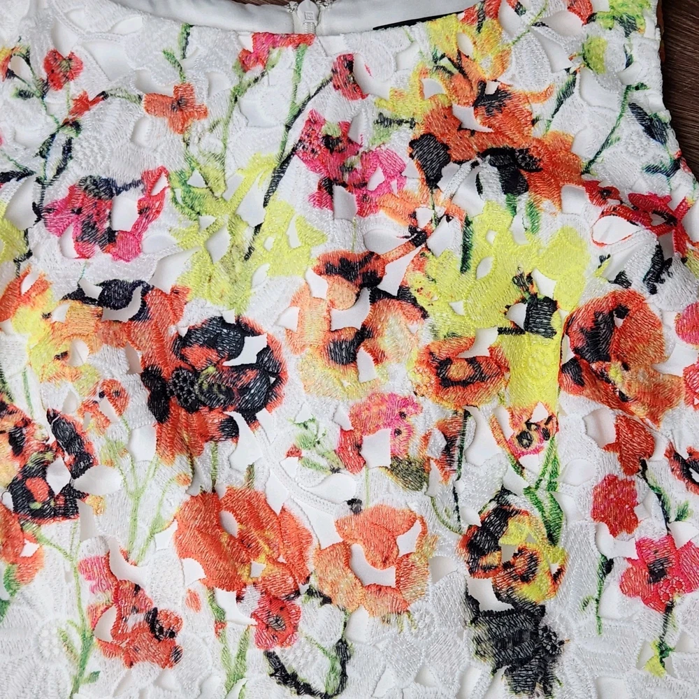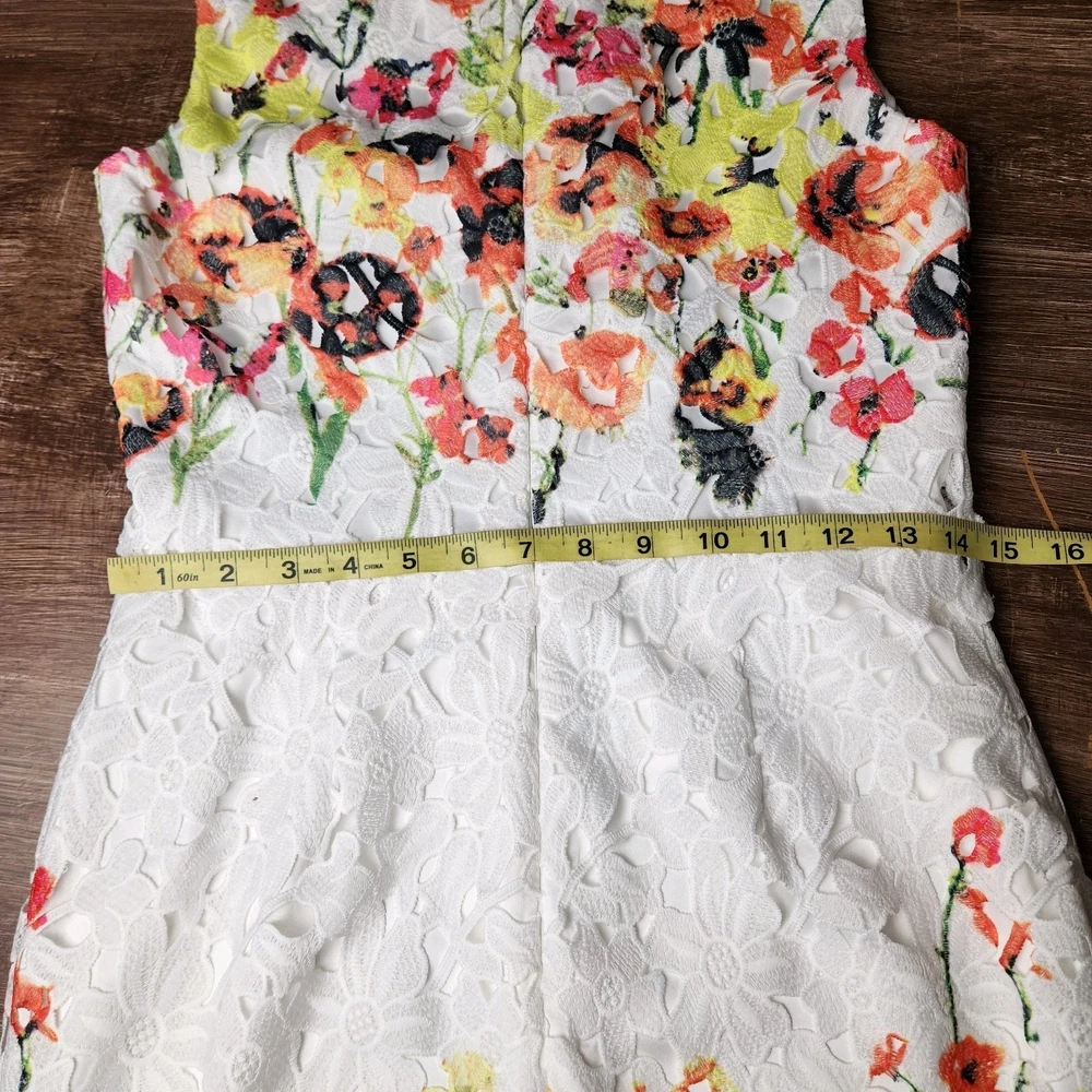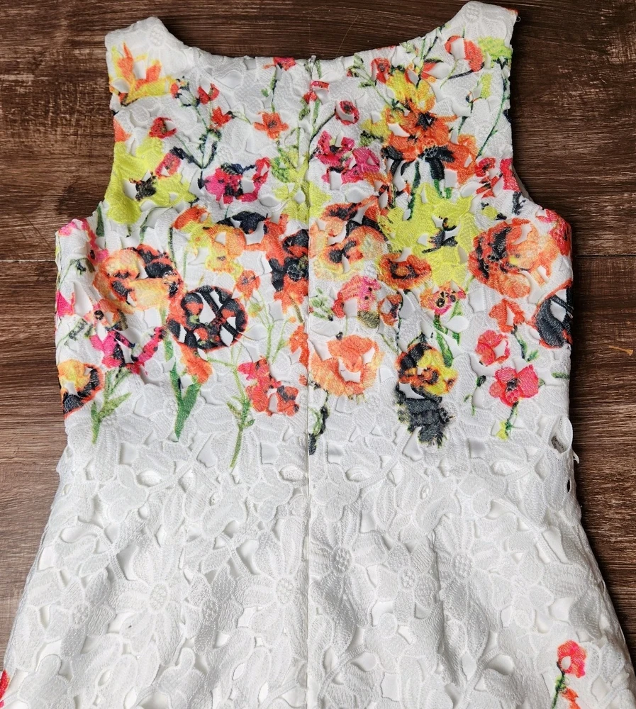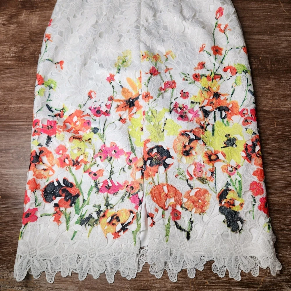 The Badgley Mischka Floral White Lace Overlay Crochet Sheath Dress in size 4 is a feminine and elegant choice for various occasions. The dress features a floral pattern, sleeveless design, and a knee-length silhouette, making it suitable for bridal showers, parties, or even workwear. The crochet accents add a touch of sophistication to the pink dress, which exudes a Belle-like charm. This bodycon sheath dress by the renowned brand Badgley Mischka is perfect for those who appreciate a classic and feminine style with a modern twist. Absolutely beautiful. Bright colorful flowers on white lace overlay. Excellent