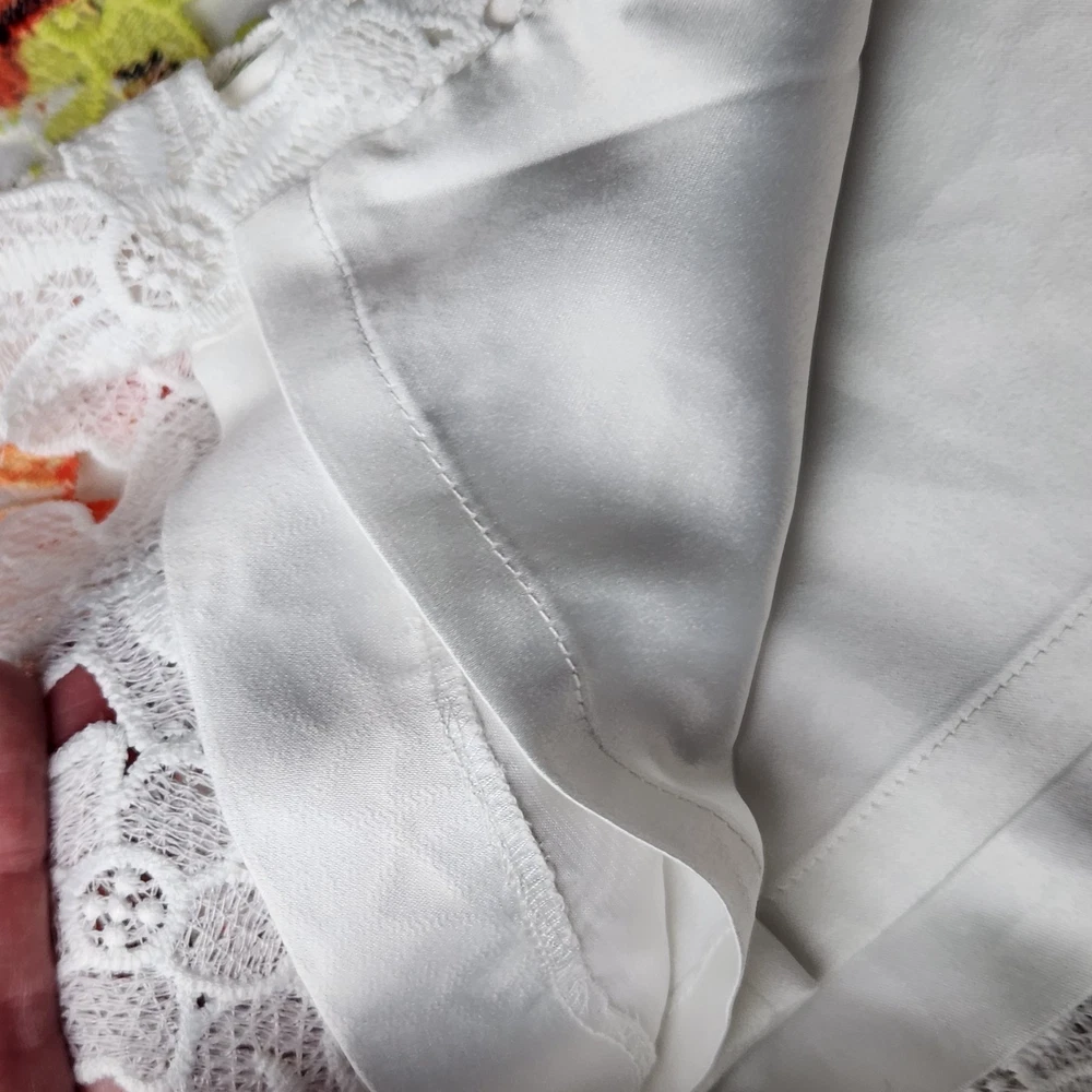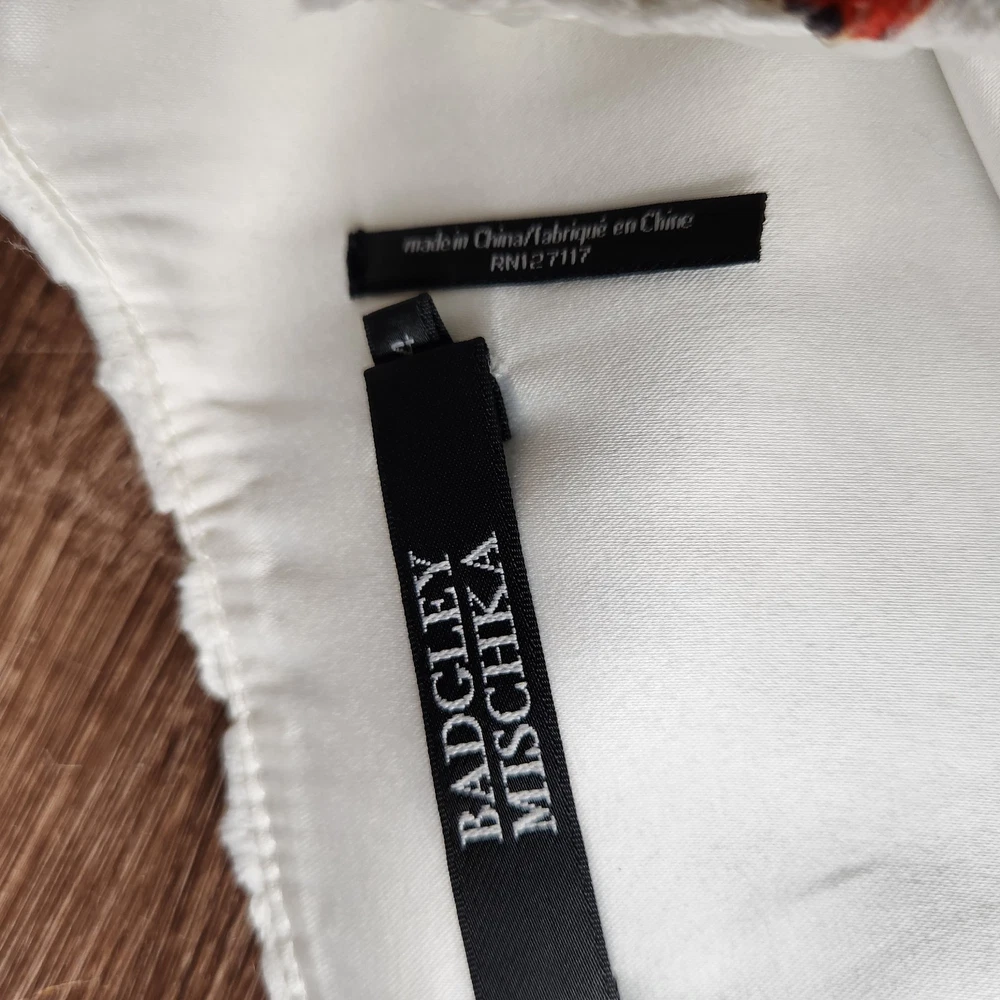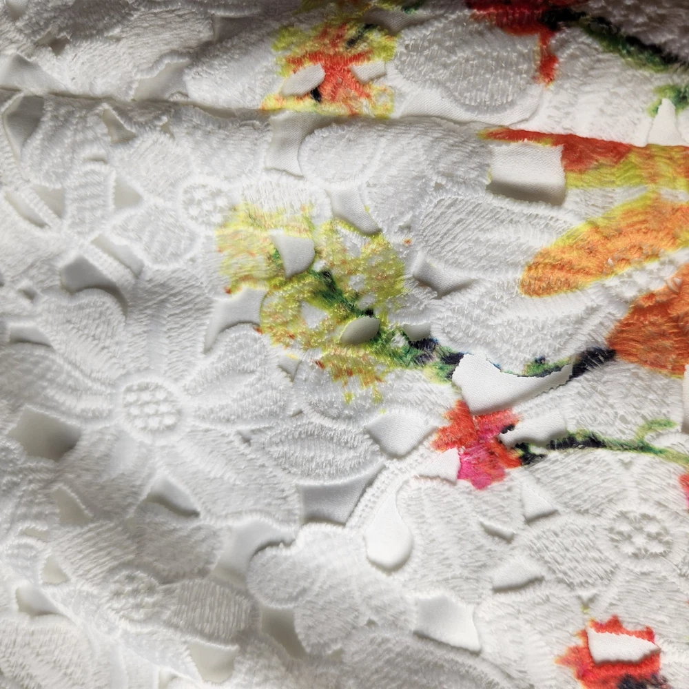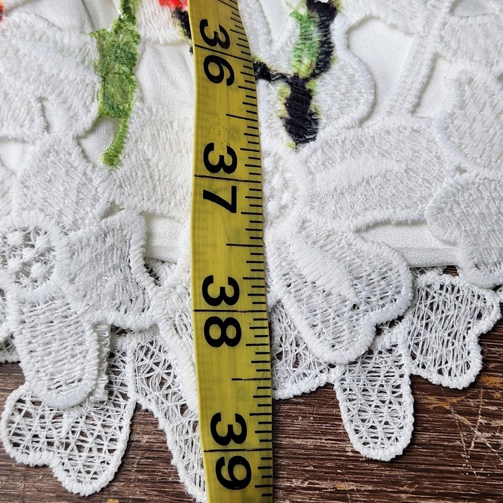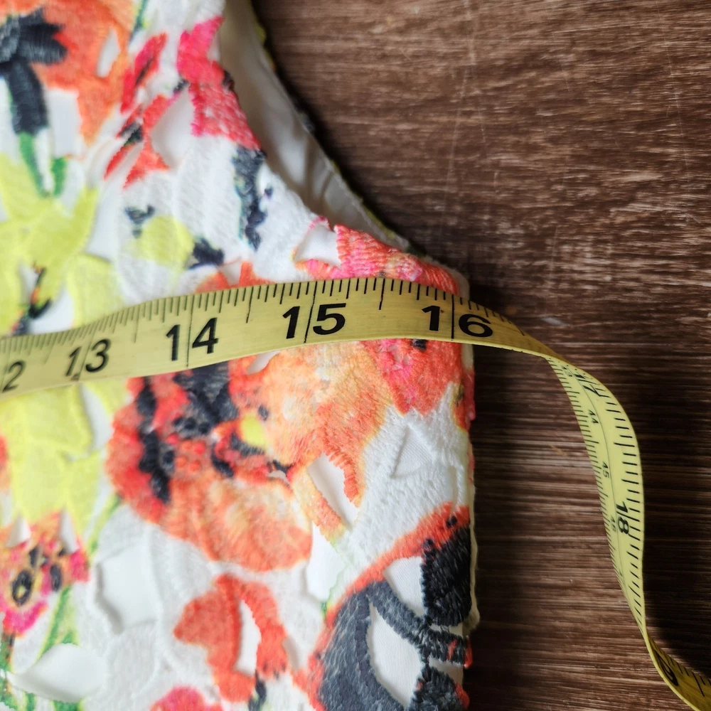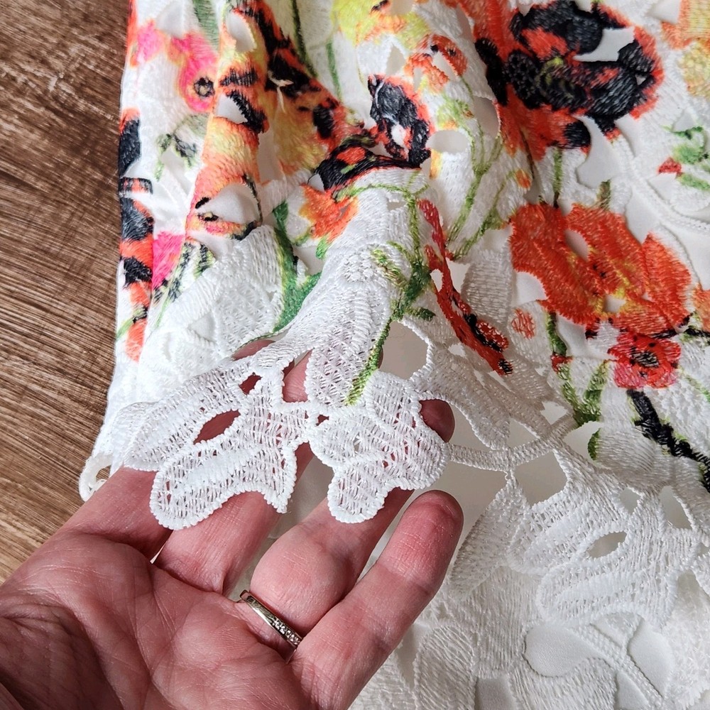 The Badgley Mischka Floral White Lace Overlay Crochet Sheath Dress in size 4 is a feminine and elegant choice for various occasions. The dress features a floral pattern, sleeveless design, and a knee-length silhouette, making it suitable for bridal showers, parties, or even workwear. The crochet accents add a touch of sophistication to the pink dress, which exudes a Belle-like charm. This bodycon sheath dress by the renowned brand Badgley Mischka is perfect for those who appreciate a classic and feminine style with a modern twist. Absolutely beautiful. Bright colorful flowers on white lace overlay. Excellent