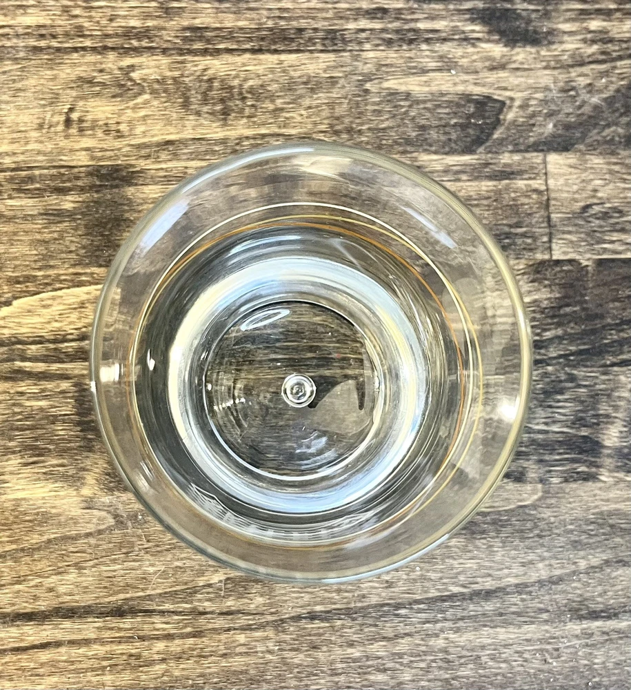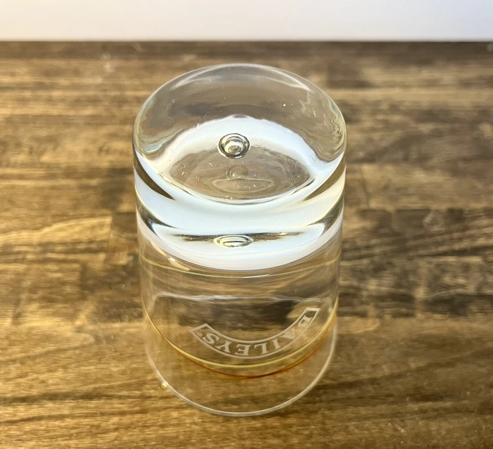 Baileys Irish Cream Highball Glass Bubble Bottom Intertwined Colored Circles 8 oz. Bailey's bubble bottom highball glass with gold and tan elliptical stripes design. These are heavy glasses with a controlled bubble in the center of the bottom. Size:3”w x 4.25” Condition: Great condition. No chips or cracks and the colors are not faded.