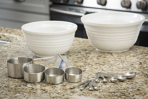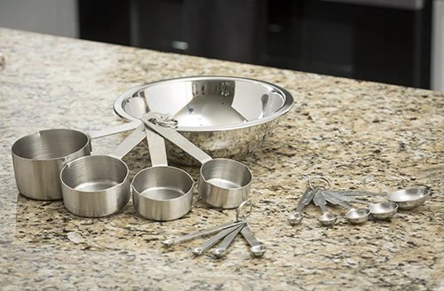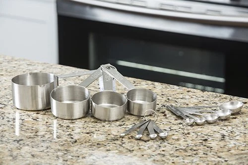 Products H726 Bakers Dozen Measuring Set Includes Measuring Spoons, Measuring Cups And Spice Spoons. 4 spice spoon, 4 measuring cups, and 5 measuring spoons. Measuring set 4-Piece measuring cup set 5-Piece measuring spoon set 4-Piece spice measuring set