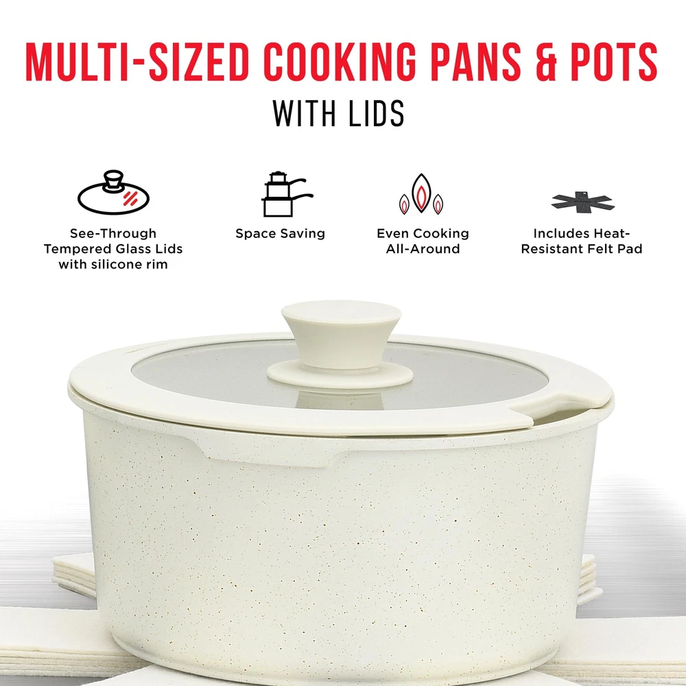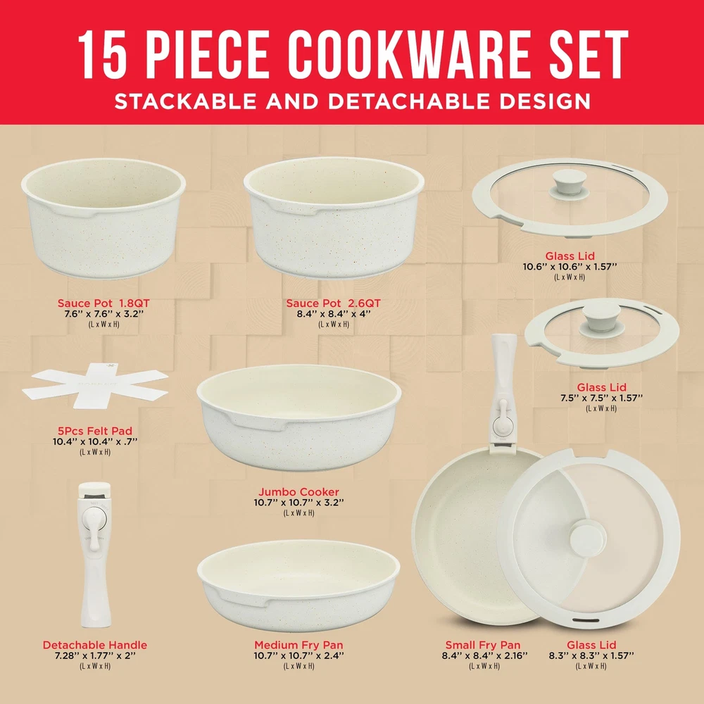Introducing the Bakken-Swiss Detachable 15-Piece Cookware Set, a display of quality and convenience. This collection isn't just about aesthetics; it's made to last. From the sturdy tempered glass lids to the ergonomic cool-touch handles, each component is proof of durability and safety. Suitable for any cook of any level, this set makes the transition from the stovetop to the oven quick and easy. The Bakken-Swiss set allows precise heat distribution across every pot and pan. This means that every meal will be cooked evenly. The see-through, tempered glass lids enable you to keep a close eye on your cooking without releasing essential steam, retaining flavors and vital nutrients. When it's time to clean up, the standout nonstick granite coating makes it the easiest task, minimizing post-cooking chores. At Bakken-Swiss, we believe in offering you a cooking experience that is enjoyable, simple, and safe. Ready to challenge your culinary skills? Try your Bakken-Swiss set–add it to your cart today! MULTIPLE SIZES: The set includes 7-inch and 8-inch Sauce Pots and their fitting lid. Explore diverse culinary techniques with the 10-inch Jumbo Cooker and refine your skills on the 8-inch and 10-inch Fry Pans. The 2 detachable handles and protective felt pads ensure seamless transitions and easy storage. You have the perfect tools to cook any dish for any occasion. VERSATILE AND ADAPTABLE: Engineered for every home, this set is suitable for all stoves–gas flame, induction plate, or classic coil. It adjusts and allows maximum heat efficiency and even cooking. This set can be used on the stove, but it is also oven-safe. SAFE FOR YOUR : Enjoy nonstick performance that is clear of PFOS/PFOA. With a maximum temperature resistance of 400° Fahrenheit (200° Celsius), our pans ensure that every meal is cooked to perfection without any harmful chemicals. EASY AND CONVENIENT: Cooking is made easier with the cool-touch detachable handles. Carefully engineered, they a burn-free grip. There is more! The crystal-clear tempered glass lids allow you to keep an eye on the food at all times. We also cared about making the pots easy to wash, to avoid any cleaning nightmare. QUALITY AND DURABILITY: We prioritized quality with a reinforced die-cast aluminum metal hardness rating of 1-2 HB. Paired with silicone and tempered glass, this set is durable and stands out from the crowd. With a coating thickness of 25-30 um and a multi-layered build of 4.0mm, it promises a long-lasting life span.