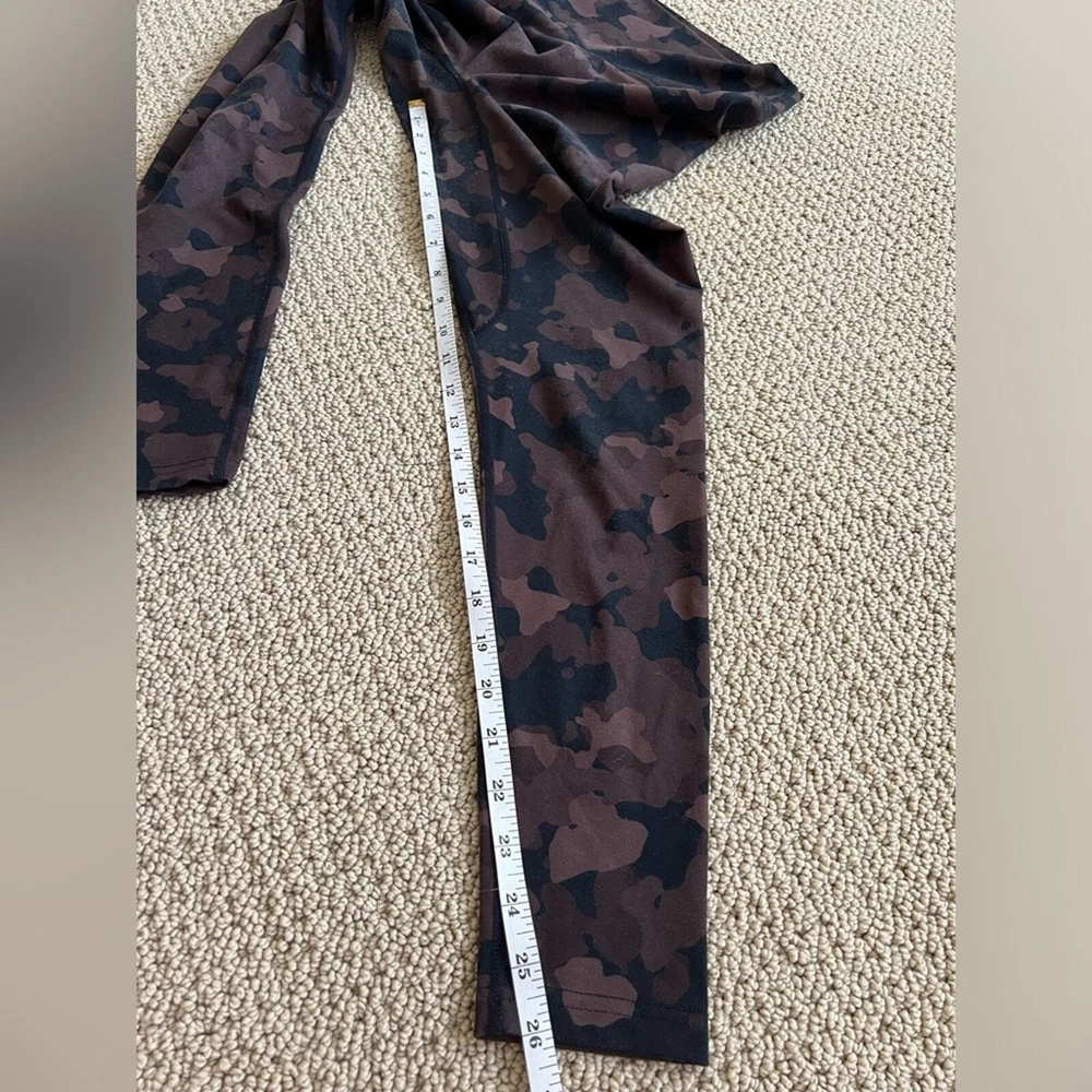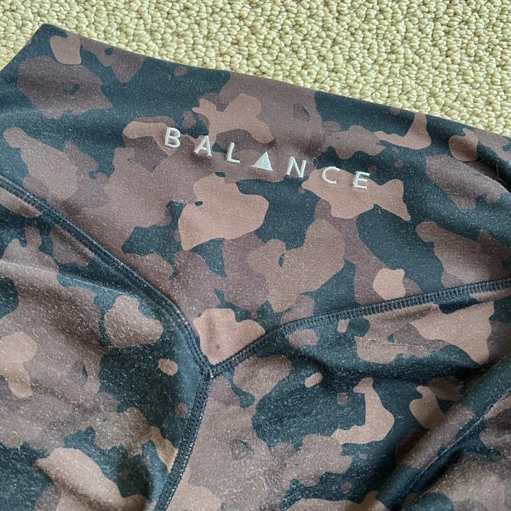 Balance Athletics leggings! Size small- the hang tag is cut out, but see approx measurements in pics Brown/black camp print In good pre owned condition- no tears or stains. Just some general wear, and 2 small snags, see close up in last pic Please reach out with questions!