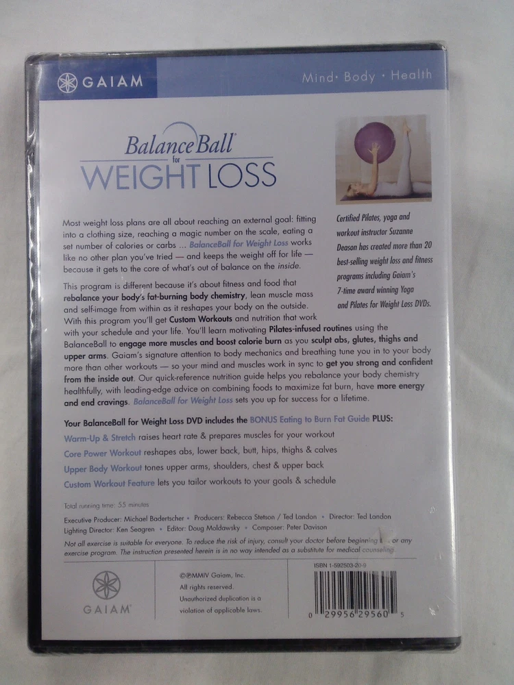Season: Workout Producer: Rebecca Stetson, Ted Landon Run Time: 55 Minutes Type: Movie Rating: NR Release Year: 2004 Format: DVD Franchise: Gaiam, Balance Ball for Weight Loss Features: Additional Scenes gtin13: 0029956295605 Cinematic Movement: Art/Indie Film, Arthouse/Independent, Cult, Expressionism Country/Region of Manufacture: United States Region Code: DVD: 1 (US, Canada...) Case Type: Tall/DVD Case MPN: 121-2178 UPC: 0029956295605 Genre: Adaptation, Classical, Documentary, Educational, Exercise & Fitness, Sports, Variety Show, Health & Fitness-Weight Liftng Sub-Genre: Bodybuilding, Cardio, Diet/Nutrition, Filming, Fitness, Health, Meditation, Photography/Film, Pilates, Weightlifting, Weight Training, Yoga, Weight Loss, Exercise, Routines, Instructional, Anatomy, Physiology Language: English Actor: Suzanne Deason Movie/TV Title: Balance Ball for Weight Loss Subtitle Language: English Director: Ted Landon Studio: Gaiam Mod Video Format: NTSC Music Artist: Various, Peter Davison Edition: Special Edition