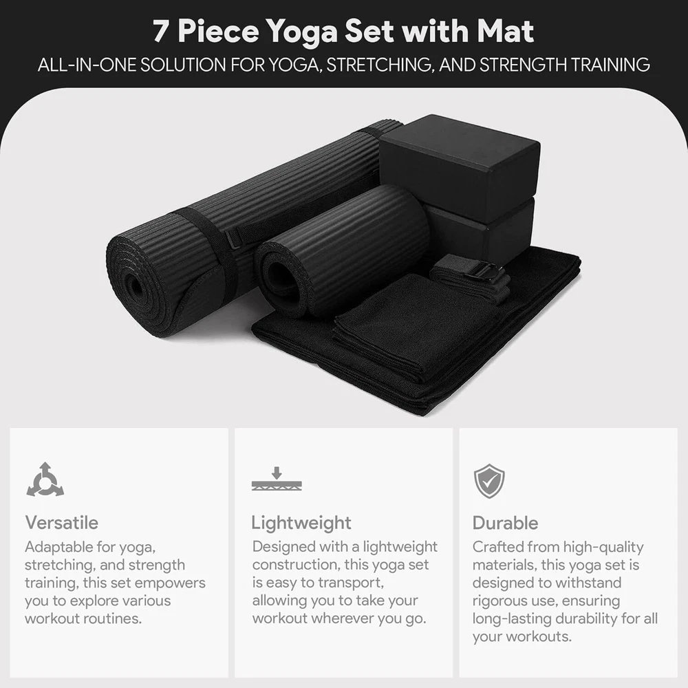 Elevate your practice and embrace tranquility with this 7-piece yoga set that brings comfort, support, and style to every session; Includes mat with carrying strap, 2 blocks, stretch strap, mat towel, hand towel, and knee pad Extra-thick, 1/2-inch yoga mat measuring 71 by 24 inches with anti-tear durability; Carrying strap for easy transportation; Double-sided non-slip surfaces keep the mat in place Yoga blocks carefully crafted to offer stable support, promoting proper alignment and empowering you to take your poses to new heights Stretch strap aids in improving your poses and enhancing your flexibility; Knee pad offers gentle support to your knees, allowing you to focus on alignment and breathing without worrying about strain Color Black Brand BalanceFrom Material Foam Product Care Instructions Hand Wash Only Product Dimensions 25"L x 15"W x 8"Th Item Weight 2.27 Kilograms Manufacturer BalanceFrom UPC 810963031092 Global Trade Identification Number 00810963031092 Item Package Dimensions L x W x H 24.5 x 15 x 8 inches