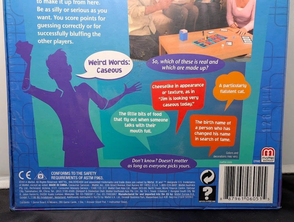 Min. Number of Players:2 playersModified Item:Nogtin13:0020315002506Recommended Age Range:12 and olderTheme:ArtAge Level:12-16 Years, 17 Years & UpType:Game BoardBrand:MattelUPC:0020315002506Game Title:BalderdashCountry/Region of Manufacture:ChinaCharacter Family:FriendsCustom Bundle:NoMPN:CFX43Title:BalderdashGender:Boys & GirlsGame Type:Board GameYear:2014