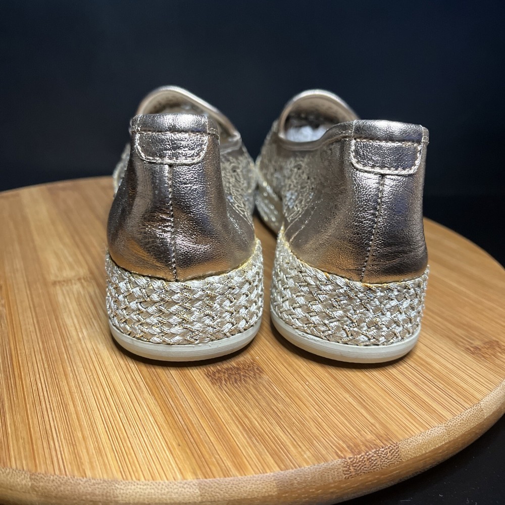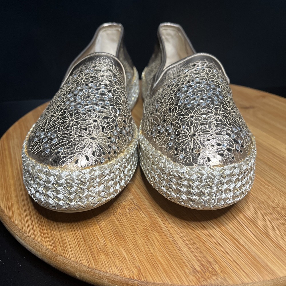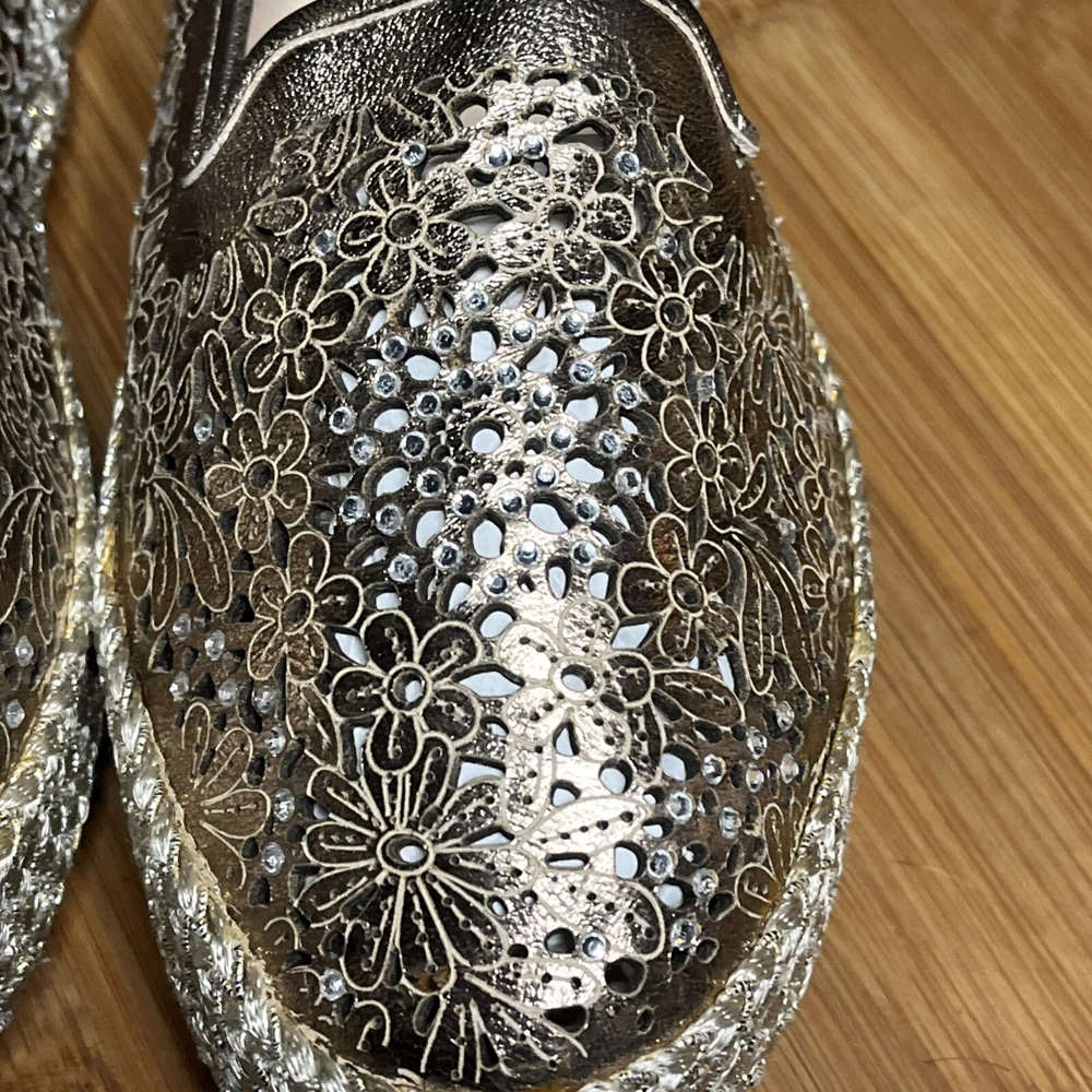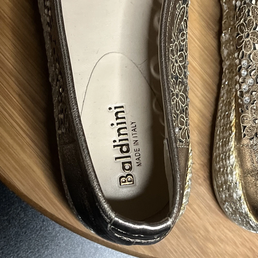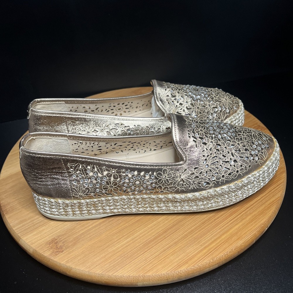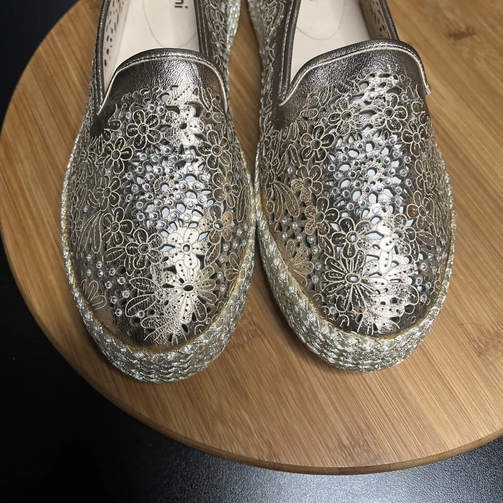 These Baldinini Espadrilles in a stunning gold color feature an almond toe shape with laser-cut floral accents adorned with crystals, giving off a bohemian and metal-themed vibe. The slip-on style and flat heel make them perfect for casual and activewear occasions, while the slip-resistant rubber outsole and lightweight design ensure comfort for walking and daily wear. Crafted in Italy with leather upper and faux leather insole, these stylish shoes in size US 8 (UK 6, EU 38.5) are a chic and versatile addition to any wardrobe.