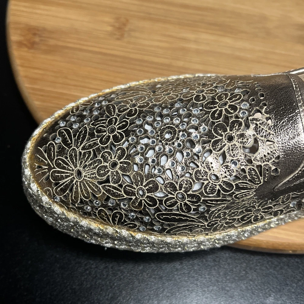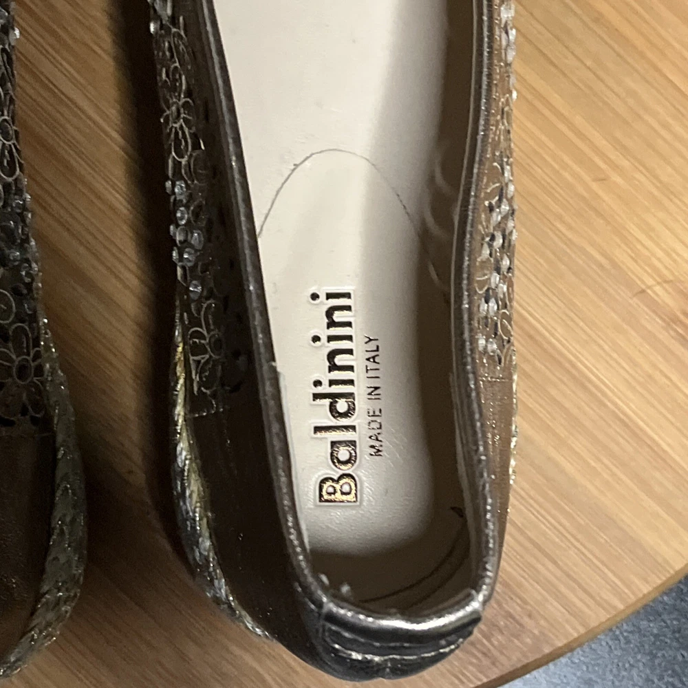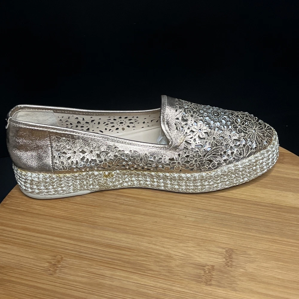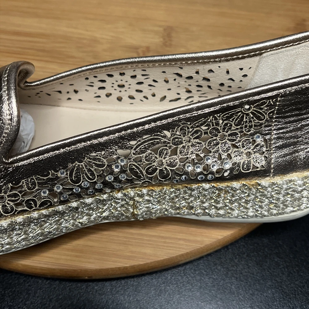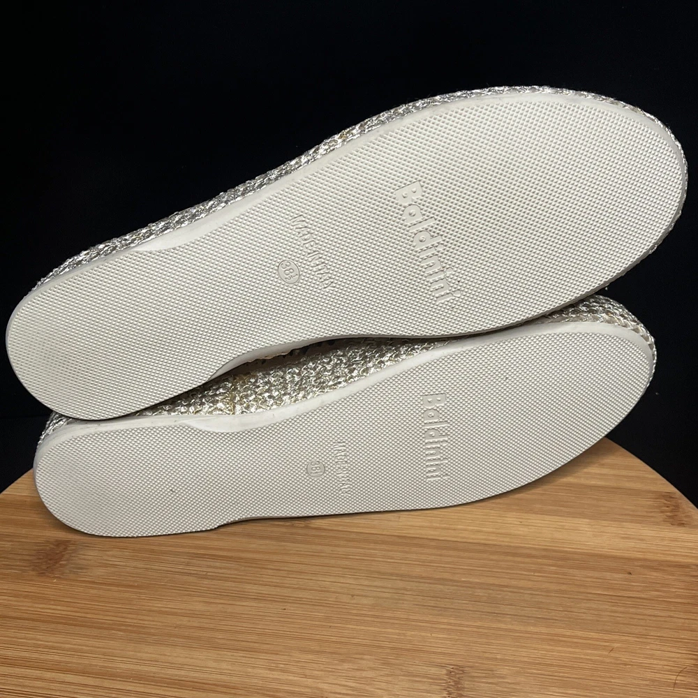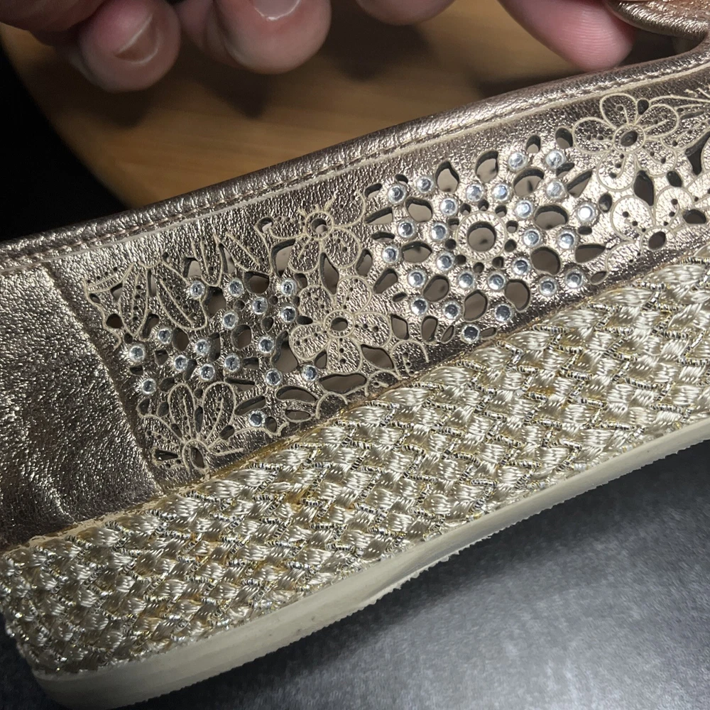 These Baldinini Espadrilles in a stunning gold color feature an almond toe shape with laser-cut floral accents adorned with crystals, giving off a bohemian and metal-themed vibe. The slip-on style and flat heel make them perfect for casual and activewear occasions, while the slip-resistant rubber outsole and lightweight design ensure comfort for walking and daily wear. Crafted in Italy with leather upper and faux leather insole, these stylish shoes in size US 8 (UK 6, EU 38.5) are a chic and versatile addition to any wardrobe.