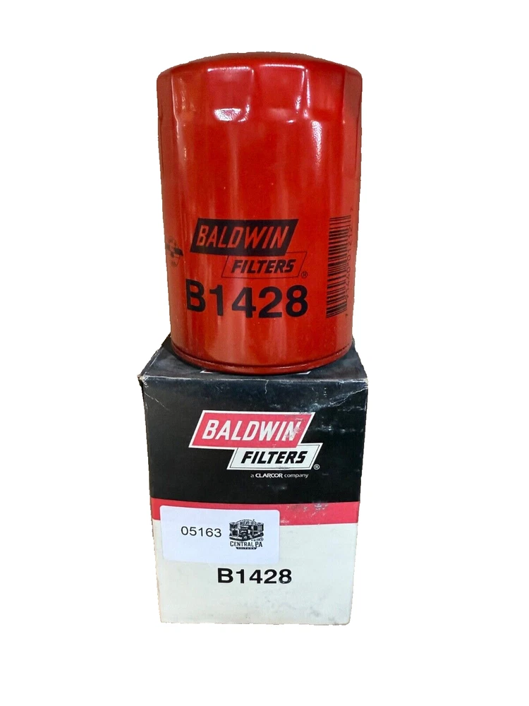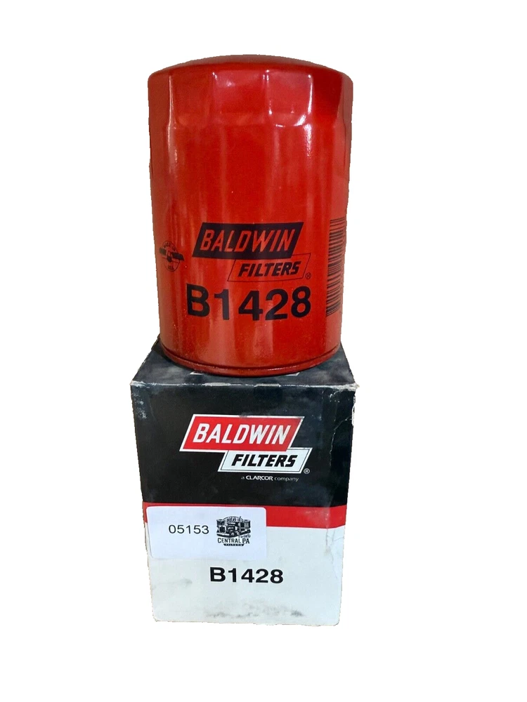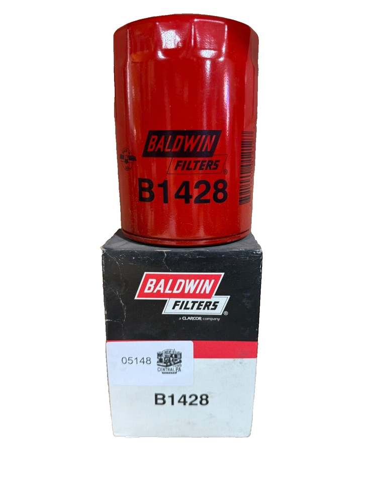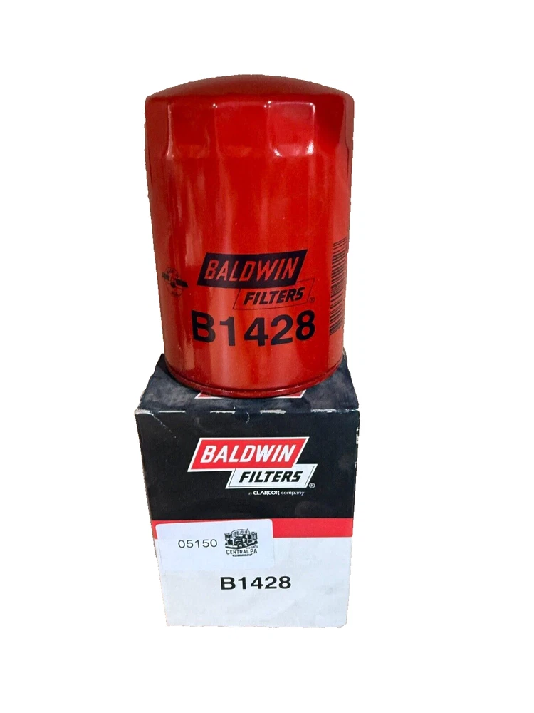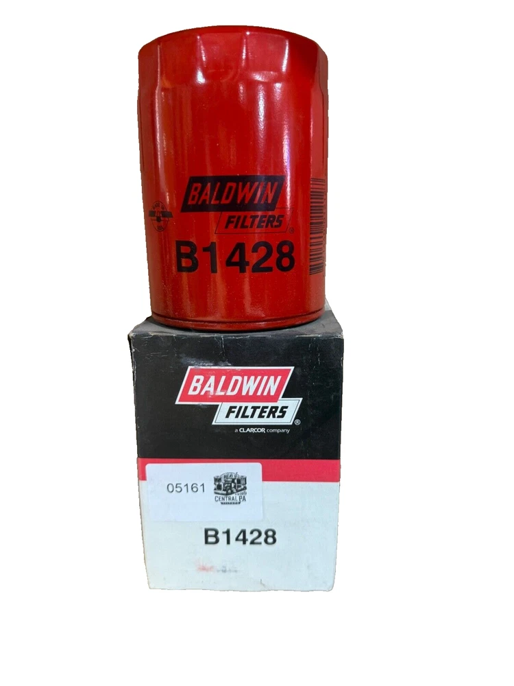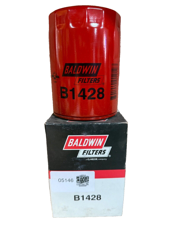This is a Baldwin Oil Filter B1428, featuring a Spin-On mounting style with a thread diameter of 13/16"-16. It comes with a gasket and is made of metal with a painted finish. The filter has a diameter of 3 11/16 inches and a length of 5 11/32 inches. It is designed for easy installation on the front of a vehicle. The gasket material is rubber, and the filter is manufactured in the United States. No warranty is provided for this new old stock (NOS) item.