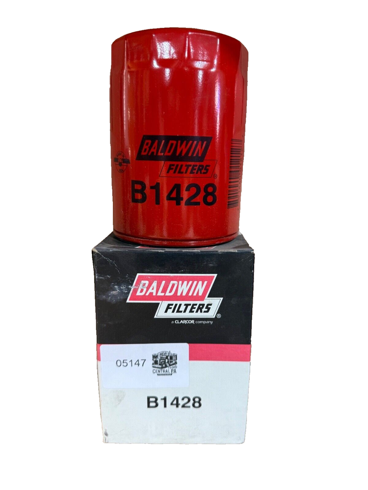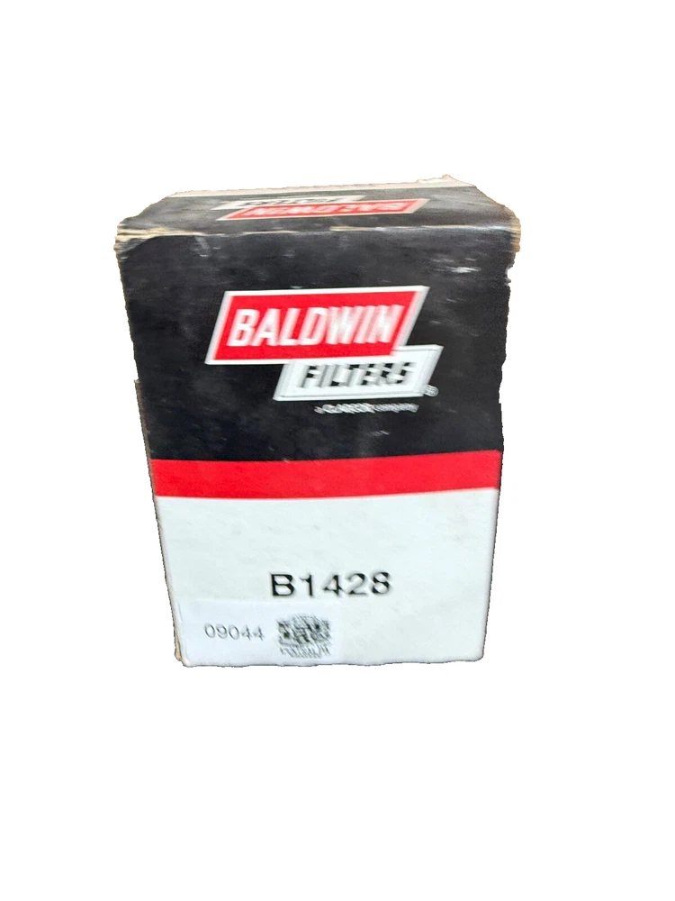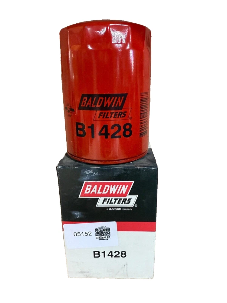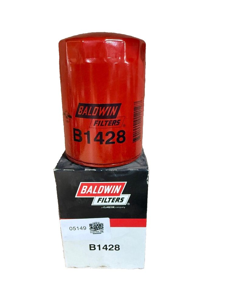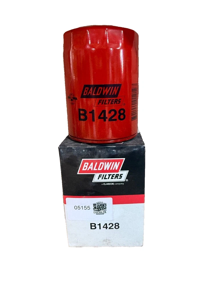 This is a Baldwin Oil Filter B1428, featuring a Spin-On mounting style with a thread diameter of 13/16"-16. It comes with a gasket and is made of metal with a painted finish. The filter has a diameter of 3 11/16 inches and a length of 5 11/32 inches. It is designed for easy installation on the front of a vehicle. The gasket material is rubber, and the filter is manufactured in the United States. No warranty is provided for this new old stock (NOS) item.