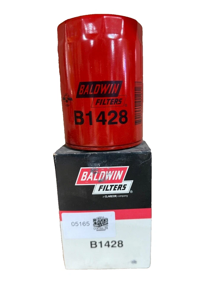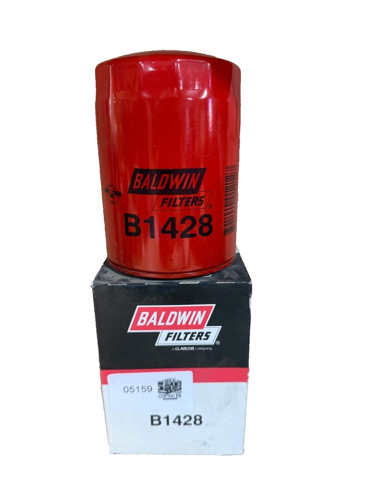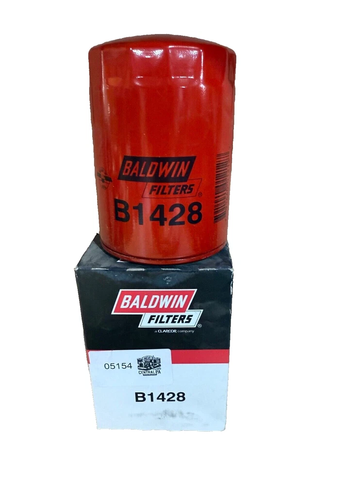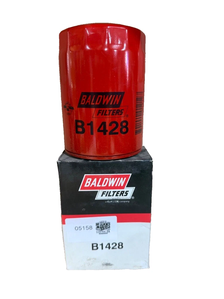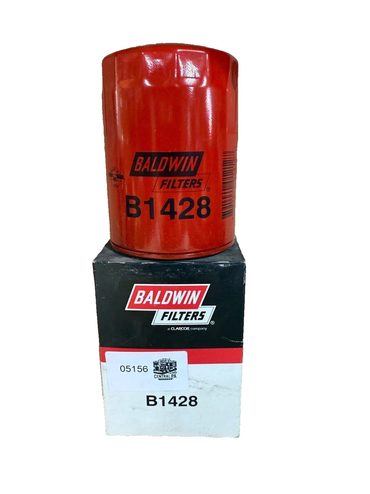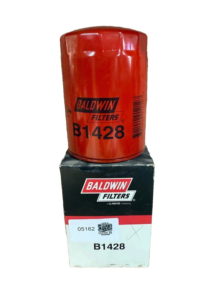 This is a Baldwin Oil Filter B1428, featuring a Spin-On mounting style with a thread diameter of 13/16"-16. It comes with a gasket and is made of metal with a painted finish. The filter has a diameter of 3 11/16 inches and a length of 5 11/32 inches. It is designed for easy installation on the front of a vehicle. The gasket material is rubber, and the filter is manufactured in the United States. No warranty is provided for this new old stock (NOS) item.