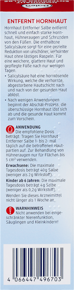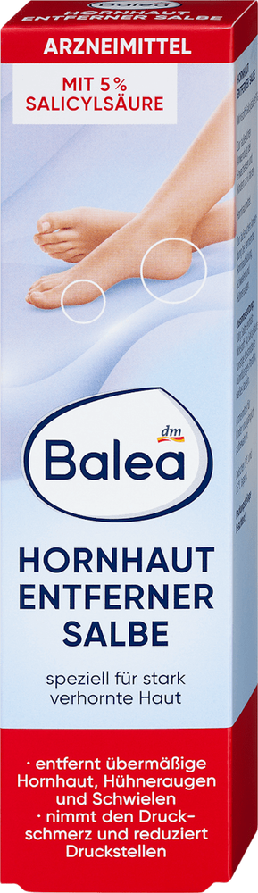 Specially formulated for severely callused skin, this salve removes excessive callous, corn, and callus build-up. Alleviates pressure pain and reduces pressure sores with regular use. Features 5% Salicylic Acid as its active ingredient, making it a powerful exfoliant. Intended for external use on areas with excessive callous build-up, corns, and calluses. The Hornhaut Entferner Salbe is a medicated salve containing 5% Salicylic Acid, designed for external use on severely callused skin, corns, and calluses. Regular application helps remove excess callous build-up, alleviate pressure pain, and reduce pressure sores. Please do not use this product if you have impaired kidney function, are a baby or toddler. For more information, you can download the product's leaflet in PDF form.