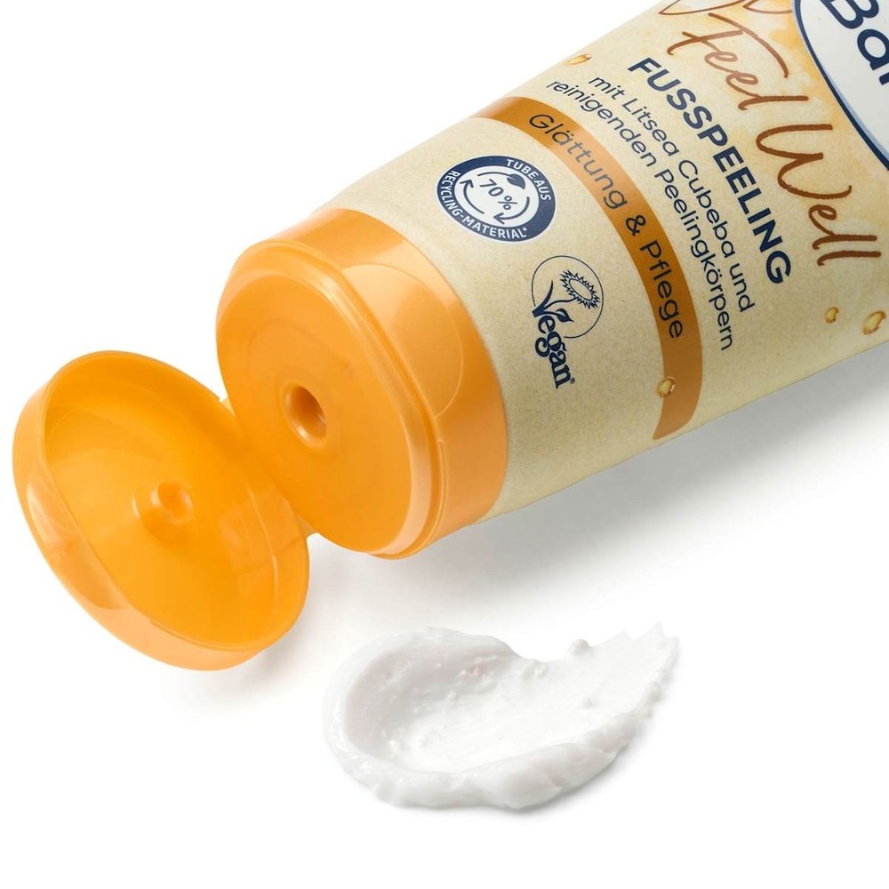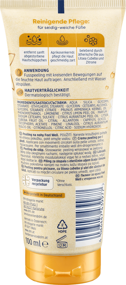 Erfrischende Pflege für die Füße mit ätherischen Ölen aus Litsea Cubeba und Zitrone. Geschmeidig zarte Haut dank Aprikosenkernöl und Allantoin. Sanftes Peeling zur Entfernung abgestorbener Hautschüppchen. Das Fußpeeling Feel Well Litsea Cubeba von Balea bietet eine reinigende Pflege für seidig-weiche Füße. Es enthält Aprikosenkernöl, um die Haut geschmeidig zart zu machen, sowie ätherische Öle aus Litsea Cubeba und Zitrone für eine belebende Wirkung. Das Peeling entfernt sanft abgestorbene Hautschüppchen und hinterlässt ein angenehmes Hautgefühl. Es ist umweltfreundlich verpackt, mit mindestens 70% Recyclinganteil in der Verpackung. Inhaltsstoffe: AQUA, SILICA, GLYCERYL STEARATE, ETHYLHEXYL STEARATE, GLYCERIN, CETEARYL ALCOHOL, GLYCERYL STEARATE CITRATE, PRUNUS ARMENIACA KERNEL OIL, PHENOXYETHANOL, ALLANTOIN, CITRUS LIMON PEEL OIL, LITSEA CUBEBA FRUIT OIL, CITRUS SINENSIS PEEL OIL EXPRESSED, LIMONENE, PARFUM, SODIUM CETARYL SULFATE, CITRAL, CAPRYLYL GLYCOL, TOCOPHERYL ACETATE, CITRIC ACID, LINALOOL, CITRONELLOL, SODIUM HYDROXIDE, CITRUS AURANTIUM PEEL OIL, PINENE, CITRUS AURANTIUM DULCIS OIL. Hergestellt in 76227 Karlsruhe, Deutschland.
