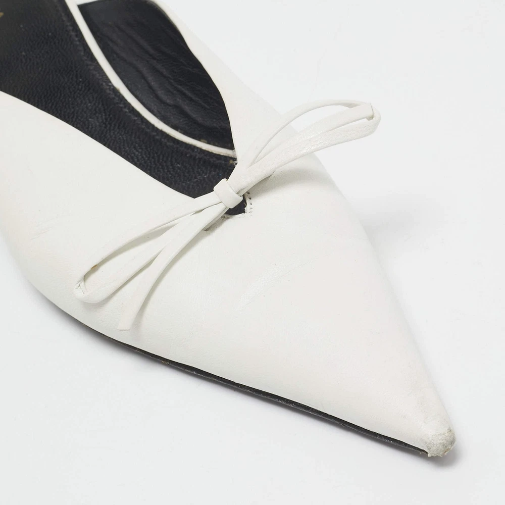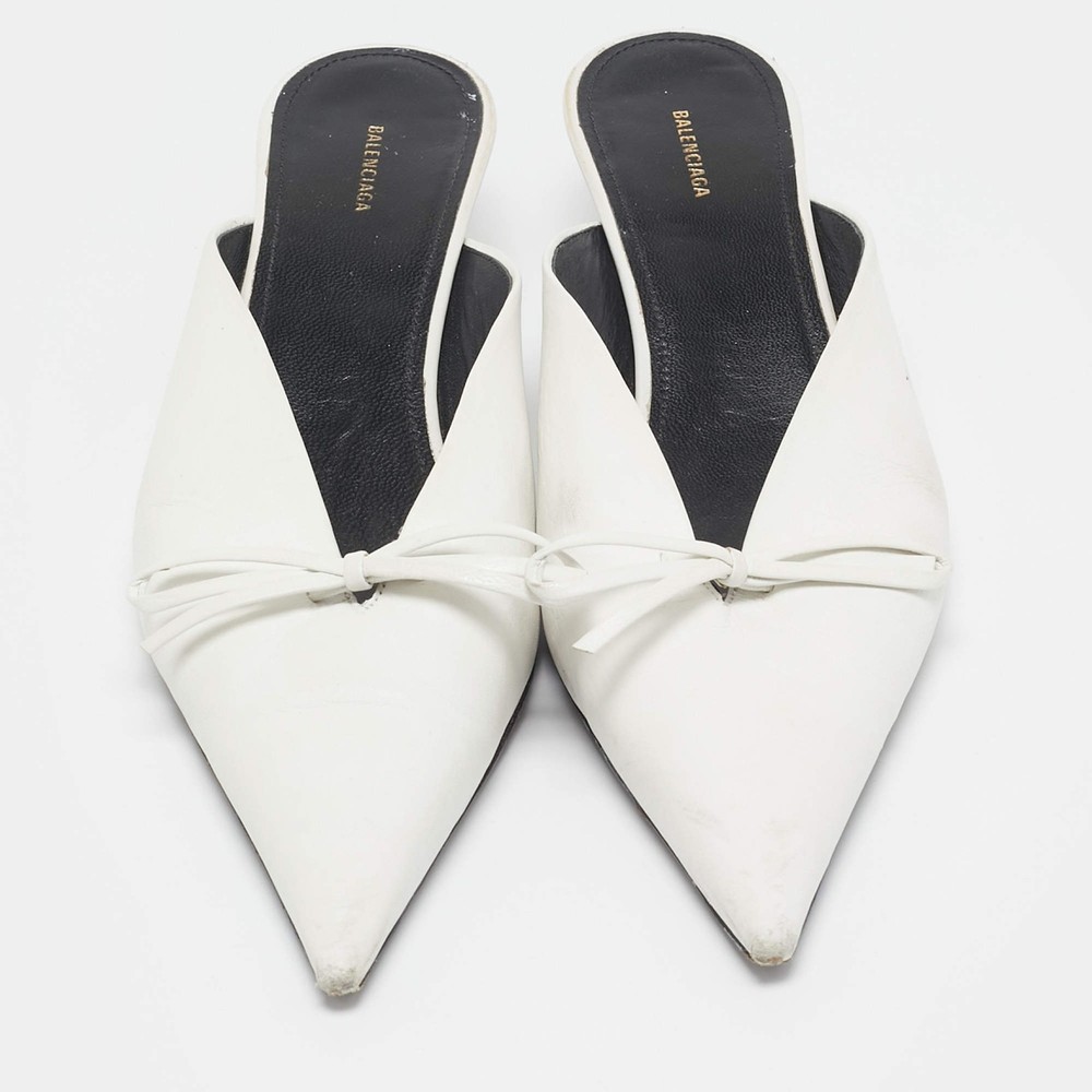 Our eBay Store About Us Contact Us Add to Favorite Sellers Balenciaga White Leather Knife Bow Mules Size 38.5 Balenciaga’s Knife Bow mules in crisp white leather are the epitome of modern minimalism with a sculptural edge. The sharply pointed toe and elegant bow detailing create a striking silhouette that’s perfect for elevating evening or daytime looks. Product Details Brand Balenciaga Color White Includes The Luxury Closet Packaging Outsole Length 27 cm Outsole Width 8 cm Size 38.5 Certified by The Luxury Closet This item has gone through a detailed authentication process overseen by our experts. We offer a lifetime guarantee of authenticity on all our items. How We Check The in-house team of experts at The Luxury Closet is highly trained to verify the authenticity and the condition of the luxury products. They ensure that only 100% authentic items are put on sale.The evaluation process is unique with its own mix of assessment criteria and differs according to the category. Each item is evaluated based on the following combination of hallmarks, hardware, stitching, symmetry, material, craftsmanship, stamping, codes, hologram stickers, and packaging. Our authenticators also check if the items have been modified or amended (e.g., aftermarket diamonds, replaced batteries, repaired bags, etc.) International Buyers Import duties, taxes and charges are not included in the item price. These charges are the buyers responsibility. Please check with your country’s customs office to determine what these additional cost will be prior to buying.
