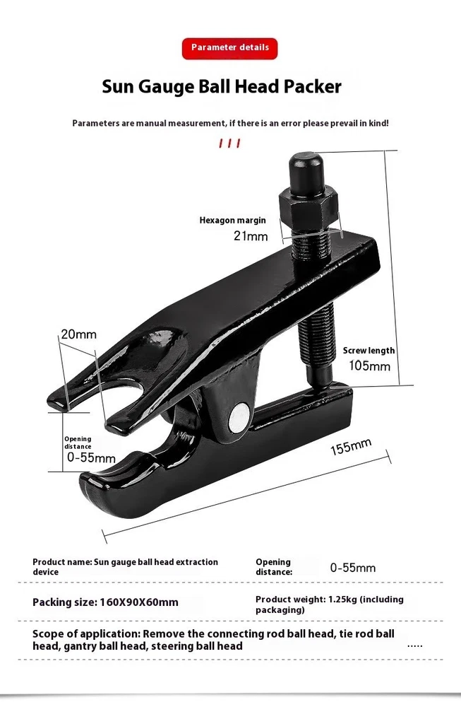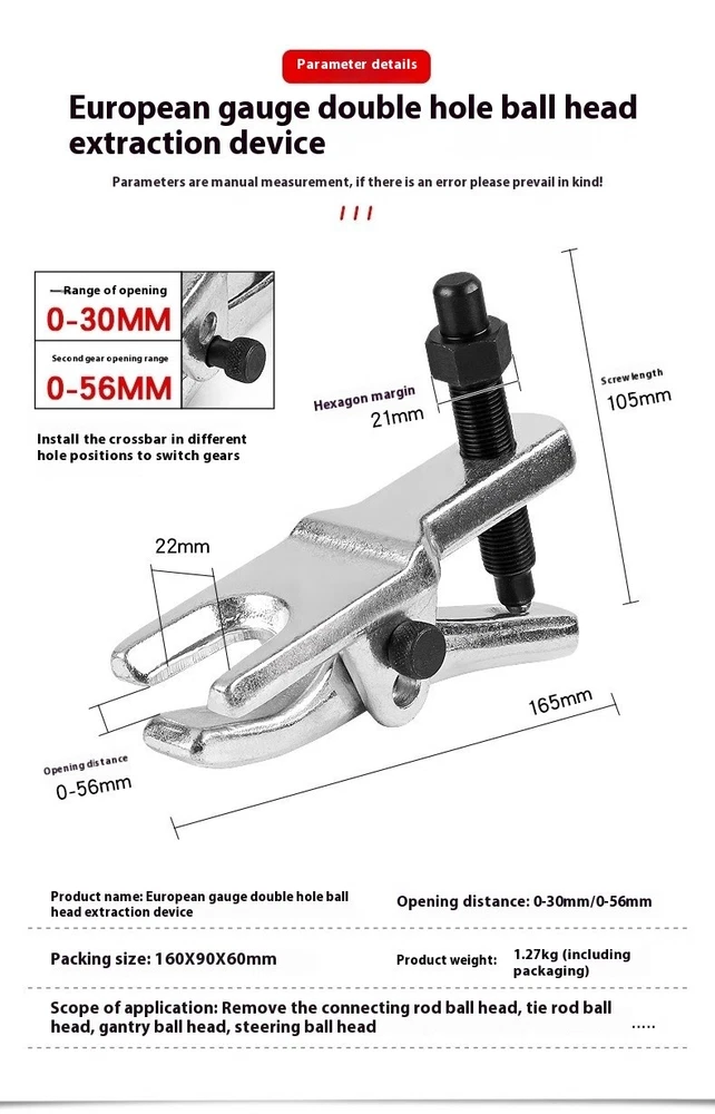 Feature: For separating the ball joint from the spindle support arm front wheel drive vehicles. Universal, it works on most cars and light trucks. Heat treated drop forged, steel body and bolt for long rough usage. Spread ball joints easily from the spindle support arm. No need for excessive hammering, easy to use. Powerful lever action breaks loose even the most stubborn joints. Specifications: Product Name: Ball Joint Separator Usage:For Car Ball Head Puller Removal Tools Type: Separator Puller Extractor Tool Style: European-style /Japanese-style Model: Ball Head Puller Removal Tools Size:As shown in figure Package included: 1 * Ball Joint Separator On Dec 30, 2025 at 01:42:33 PST, seller added the following information: