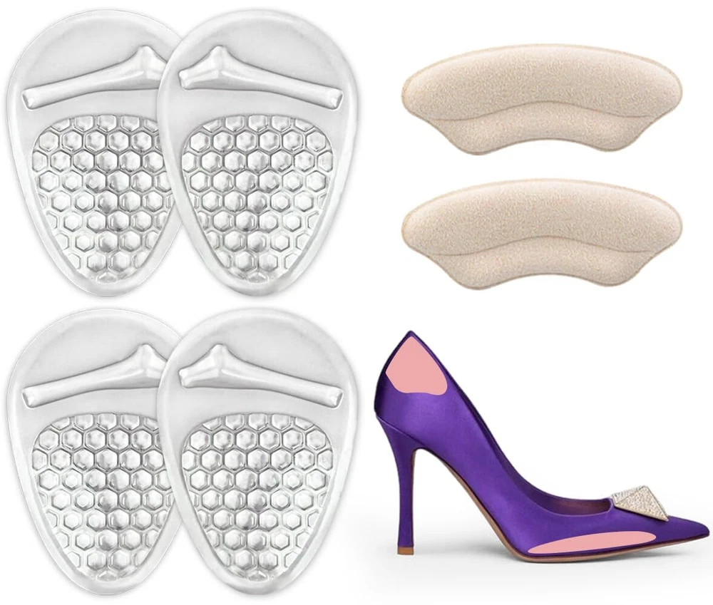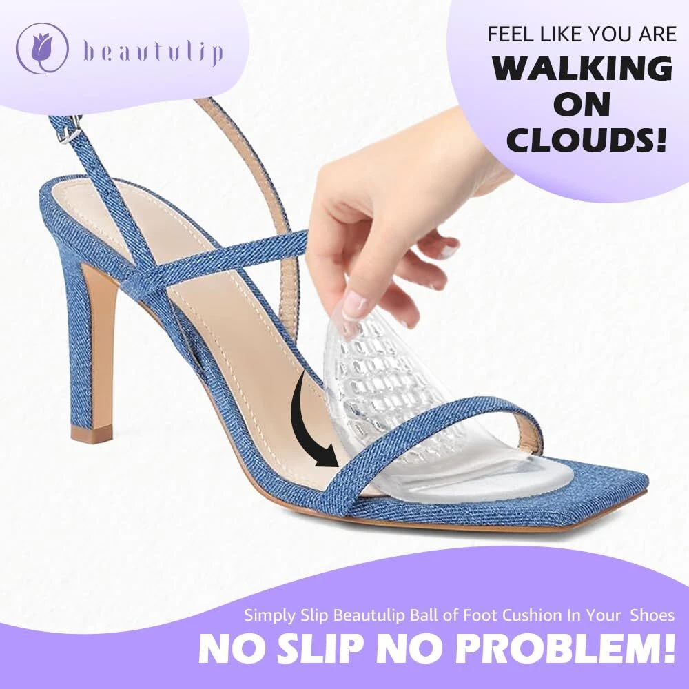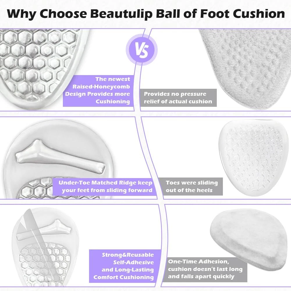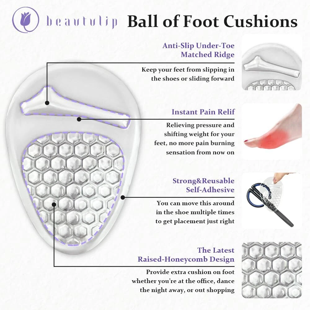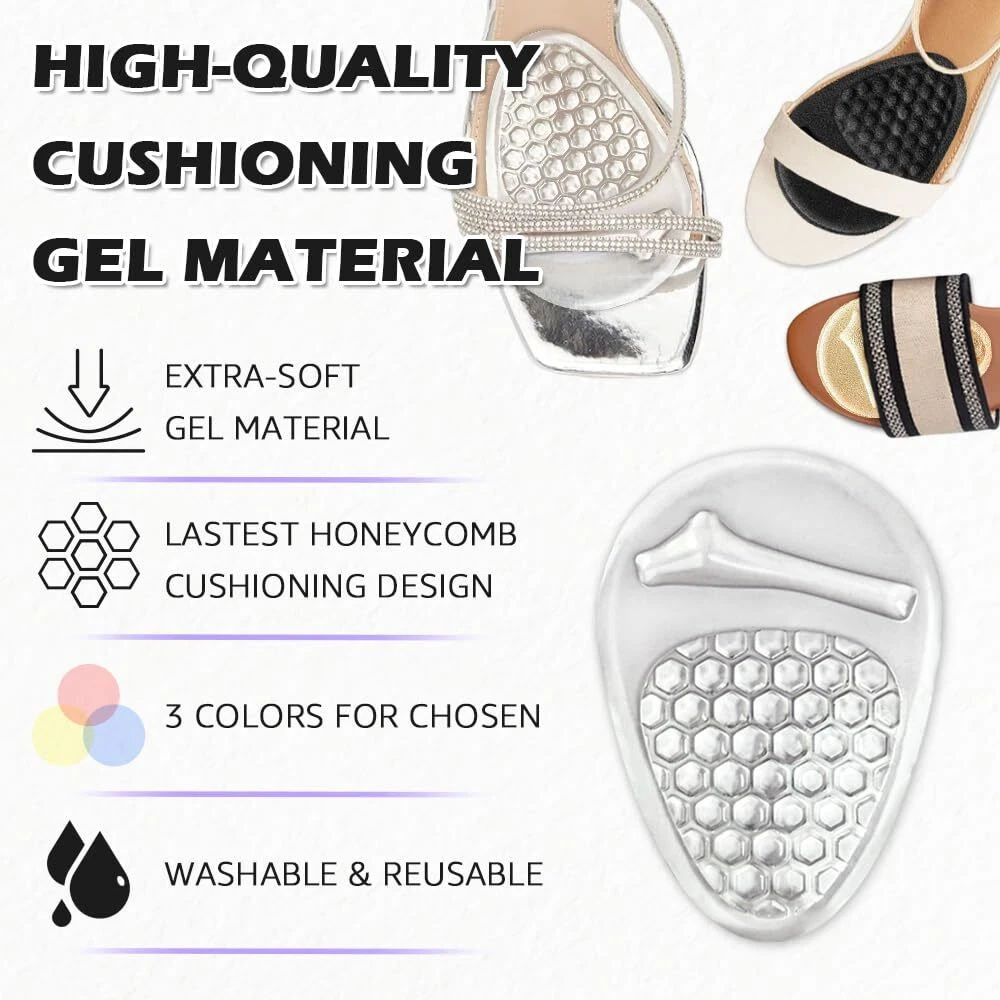 UPGRADED CUSHION - More Cushiong, more pain relief. These foot pads not only provide the function in absorbing pressure and weight shifting for balls of feet, but also stop feet from sliding forward in heels NON-SLIP DESIGN - The gel pads are designed to match the shape of metatarsal bone part by having a ridge and a soft-supportive bump that keep your feet in position and reduce ball of foot pain for all day comfort WALK WITH SUPPORT - Enjoy every step you take with comfort and support. Our foot cushions bring immediate foot pain relief, make sure your feet are fully protected all day or all night LOVE YOUR HEELS - Soft gel material provides targeted relief, fits comfortably in high heels, pumps, wedges or other shoes with or without heel height WASHABLE & REUSABLE - Hand wash by water and air dry will simply restore the product's stickness