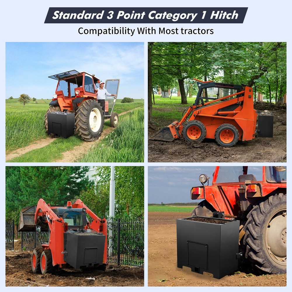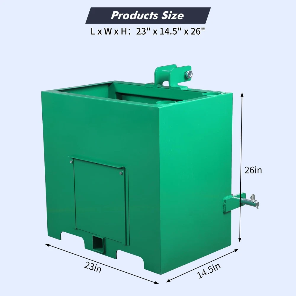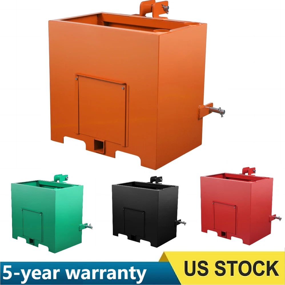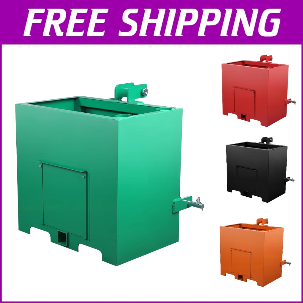 This 3 Point Ballast Box an support up to 800 lbs.making it a great asset to your tractor.You can also use the ballast box to store 5 cubic feet of tools. It can even accommodate your pair of integrated pipe rack. Our attachments are designed to protect the integrity of your tractor's front axle. It improves traction by balancing and shifting weight from the machine's weaker front end to the stronger rear end so it doesn't tip over. This attachment is made of heavy duty steel. Its all-steel construction ensures its durability and long-lasting. Plus, it's powder-coated for extra protection and reinforcement. It is designed for use with 3-point Class 1 tractors, so it is compatible with a wide variety of different makes and models. It comes in a bright red color that complements most tractor Ballast Box 3-Pt Category 1 Tractor Attachment 800lbs 5cu.ft Tractor Ballast Box This ballast box has a capacity of 5 cubic feet and can be used to store tools as well as gear and accessories. Designed to fit 3 point Class 1 tractors, compatible with most makes and models, make sure your machine fits it. It has a sliding front door that makes it easy to empty boxes and reduce weight when needed. It can hold tools or be filled with concrete, gravel or rock, adding weight and improving stability to machine. Constructed of sturdy steel for durability;its glossy powder coat finish prevents corrosion and rust. This ballast box can hold up to 800 lbs,you can fill it up with concrete,sand,steel,or gravel. Package Content 1 x Ballast Box Specification Lifting Capacity: 800 lbs Fits Standard Category 1, 3 Point Hitch Use with Sand, Steel, Concrete, Gravel, Rocks, etc. Integrated tool holder Quick Hitch Compatible Weight: 106 lbs Overall Size: 23x14.5x26 in. About the item: 【 Universal Cat 1 Compatibility】 Engineered to fit most 3 point category 1 tractors, this ballast box is a must-have tractor attachment. It seamlessly integrates with your loader hitch system, providing a secure and precise fit for diverse farming and landscaping tasks. 【Massive 800lbs Weight Capacity 】 With a 5 cu. ft volume, you can fill this weight box with sand, steel, or gravel to reach a maximum 800lbs ballast. This sturdy weight significantly lowers the center of gravity, preventing tipping and ensuring ultimate stability. 【 robust Cold Rolled Steel Construction】 Built from professional-grade cold rolled steel, the box features a rust-resistant powder-coat finish in gloss green. This robust construction defends against the harshest outdoor conditions, ensuring long-lasting durability without corrosion . 【Multi-functional 2" Hitch Receiver】 More than just a ballast box for tractor, it features a standard 2'' hitch receiver for additional towing. The integrated tube holders and sliding front door allow for efficient storage of long-handled tools and easy weight adjustment. 【Smart Storage & Tool Organization】 Equipped with integrated tube holders, this ballast box for tractor keeps your shovels, rakes, and other long-handled tools secure. The sliding front door allows for fluidity in weight adjustment, making it easy to add or empty gravel, sand, or concrete. Payment Delivery details Terms of sales About us Contact us Payment We accept payment either via PayPal or any of the following credit cards; Visa, MasterCard, Discover, and American Express. Delivery details 1. We will delivery out at the handing time when we receive the payment. 2. The delivery time is 3-5 business days to US by usually time.The parcel maybe delay 1-2day of the weekend.Due to the bad weather,Holidays,Hot Season ect.the parcel maybe delay,If you have any problems,mssage us,we will try our best to solve it. 3. We ship to your eBay address. Please make sure your eBay address is correct before you pay. 4. If you want to change the shipping address,message us before our send out. Terms of sales If you are not satisfied with the item for any reason, please do not quick to leave negative/neutral feedback even open request and case without any communication with us. We devote ourselves making EVERY CUSTOMER in 100% Satisfactory and resolve any problem. Thank you for your understanding and recognition,we are always leave positive feedback to all our customers. About Reply: All replies will be sent to your email box, if you do not get response within 24 hours (Sat. & Sun. excluded) please check your eBay My Messages in case that our emails will be filtered automatically by your settings. About us skybridge99 is a brand new store but we are one of North America’s top online suppliers of specialized, high-quality aftermarket online retailers and suppliers, committed to developing new markets. We primarily offers tool sets, auto parts, home goods, etc..With over 20 years of product selection and manufacturing experience, we delivers unparalleled quality, value, service and satisfaction. Our highly-trained, professional staff offer in-depth knowledge and personalized assistance for customers worldwide. Providing our customers with a simple, hassle-free experience with best-in-class customer service is more than a goal. Contact us Any problem please rest assure to contact us by eBay message first. We will reply you as soon as we can. We will deal with it within 24hs on working days.