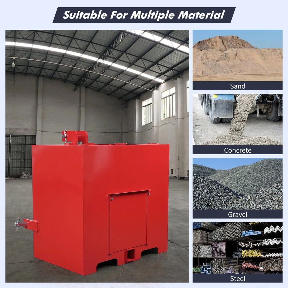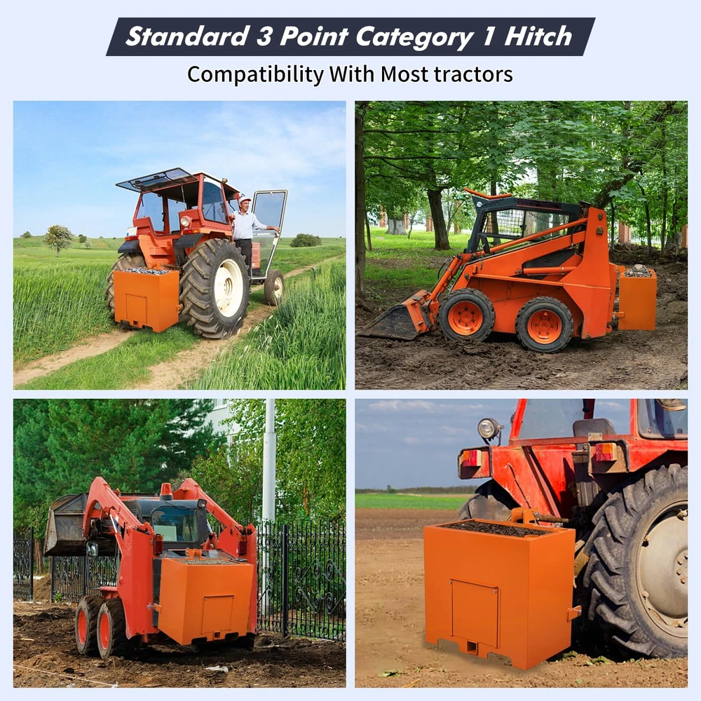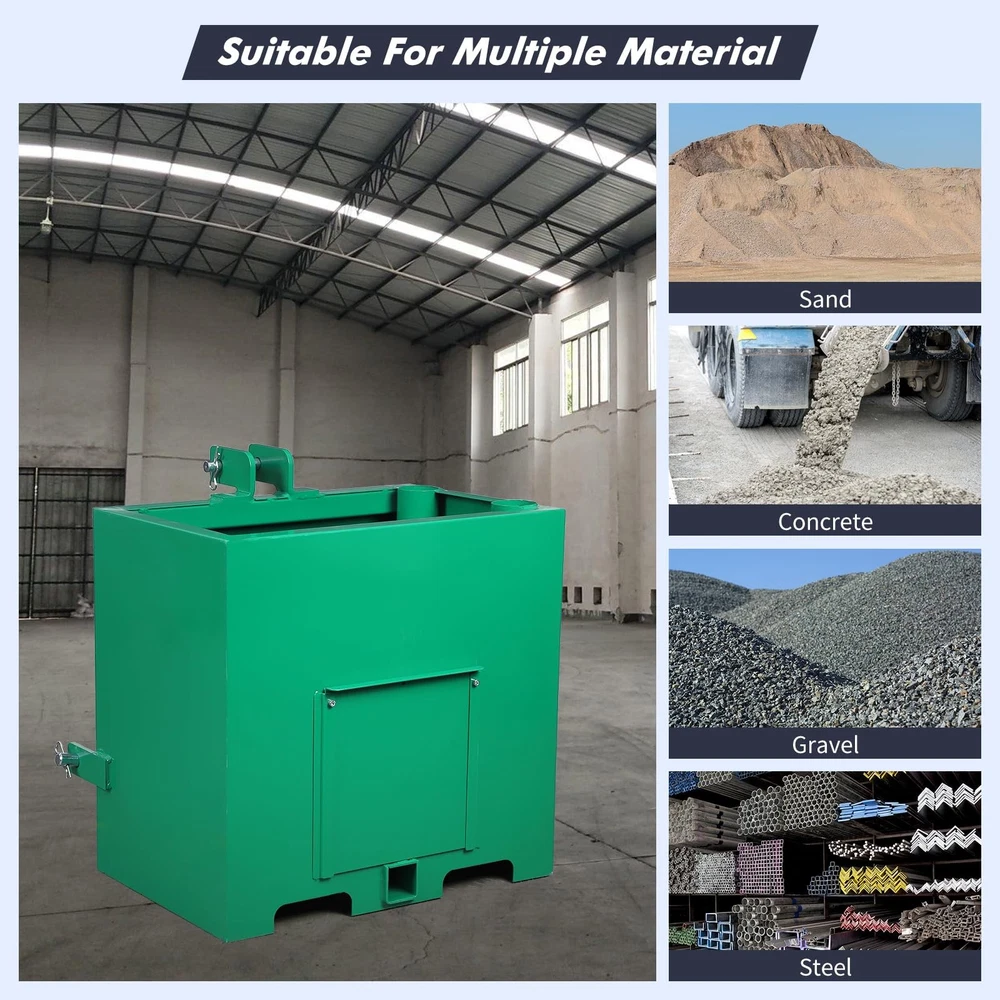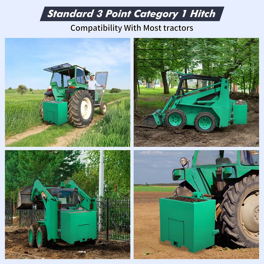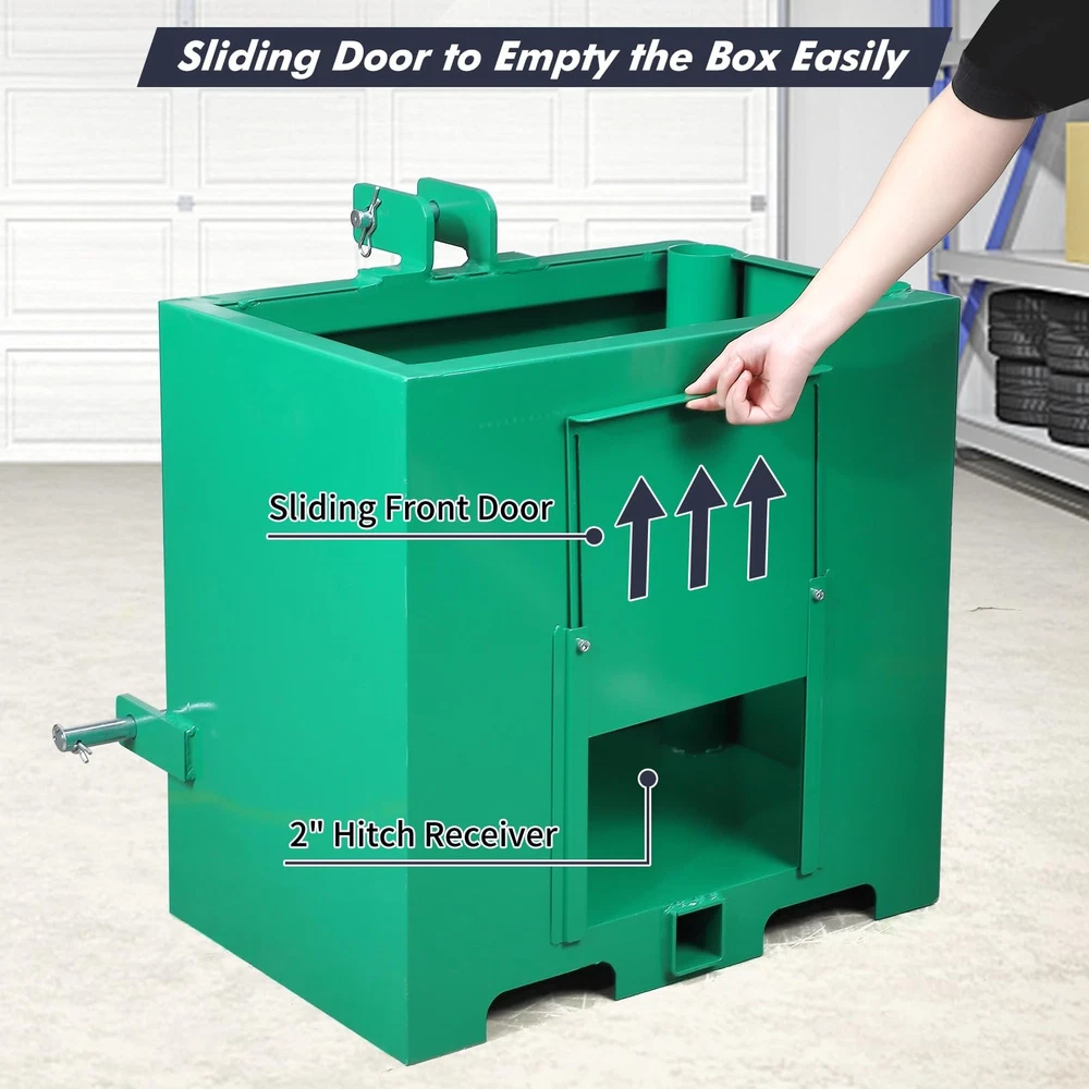 This 3 Point Ballast Box an support up to 800 lbs.making it a great asset to your tractor.You can also use the ballast box to store 5 cubic feet of tools. It can even accommodate your pair of integrated pipe rack. Our attachments are designed to protect the integrity of your tractor's front axle. It improves traction by balancing and shifting weight from the machine's weaker front end to the stronger rear end so it doesn't tip over. This attachment is made of heavy duty steel. Its all-steel construction ensures its durability and long-lasting. Plus, it's powder-coated for extra protection and reinforcement. It is designed for use with 3-point Class 1 tractors, so it is compatible with a wide variety of different makes and models. It comes in a bright red color that complements most tractor Ballast Box 3-Pt Category 1 Tractor Attachment 800lbs 5cu.ft Tractor Ballast Box This ballast box has a capacity of 5 cubic feet and can be used to store tools as well as gear and accessories. Designed to fit 3 point Class 1 tractors, compatible with most makes and models, make sure your machine fits it. It has a sliding front door that makes it easy to empty boxes and reduce weight when needed. It can hold tools or be filled with concrete, gravel or rock, adding weight and improving stability to machine. Constructed of sturdy steel for durability;its glossy powder coat finish prevents corrosion and rust. This ballast box can hold up to 800 lbs,you can fill it up with concrete,sand,steel,or gravel. Package Content 1 x Ballast Box Specification Lifting Capacity: 800 lbs Fits Standard Category 1, 3 Point Hitch Use with Sand, Steel, Concrete, Gravel, Rocks, etc. Integrated tool holder Quick Hitch Compatible Weight: 106 lbs Overall Size: 23x14.5x26 in. About the item: 【 Universal Cat 1 Compatibility】 Engineered to fit most 3 point category 1 tractors, this ballast box is a must-have tractor attachment. It seamlessly integrates with your loader hitch system, providing a secure and precise fit for diverse farming and landscaping tasks. 【Massive 800lbs Weight Capacity 】 With a 5 cu. ft volume, you can fill this weight box with sand, steel, or gravel to reach a maximum 800lbs ballast. This sturdy weight significantly lowers the center of gravity, preventing tipping and ensuring ultimate stability. 【 robust Cold Rolled Steel Construction】 Built from professional-grade cold rolled steel, the box features a rust-resistant powder-coat finish in gloss green. This robust construction defends against the harshest outdoor conditions, ensuring long-lasting durability without corrosion . 【Multi-functional 2" Hitch Receiver】 More than just a ballast box for tractor, it features a standard 2'' hitch receiver for additional towing. The integrated tube holders and sliding front door allow for efficient storage of long-handled tools and easy weight adjustment. 【Smart Storage & Tool Organization】 Equipped with integrated tube holders, this ballast box for tractor keeps your shovels, rakes, and other long-handled tools secure. The sliding front door allows for fluidity in weight adjustment, making it easy to add or empty gravel, sand, or concrete. Payment Delivery details Terms of sales About us Contact us Payment We accept payment either via PayPal or any of the following credit cards; Visa, MasterCard, Discover, and American Express. Delivery details 1. We will delivery out at the handing time when we receive the payment. 2. The delivery time is 3-5 business days to US by usually time.The parcel maybe delay 1-2day of the weekend.Due to the bad weather,Holidays,Hot Season ect.the parcel maybe delay,If you have any problems,mssage us,we will try our best to solve it. 3. We ship to your eBay address. Please make sure your eBay address is correct before you pay. 4. If you want to change the shipping address,message us before our send out. Terms of sales If you are not satisfied with the item for any reason, please do not quick to leave negative/neutral feedback even open request and case without any communication with us. We devote ourselves making EVERY CUSTOMER in 100% Satisfactory and resolve any problem. Thank you for your understanding and recognition,we are always leave positive feedback to all our customers. About Reply: All replies will be sent to your email box, if you do not get response within 24 hours (Sat. & Sun. excluded) please check your eBay My Messages in case that our emails will be filtered automatically by your settings. About us skybridge99 is a brand new store but we are one of North America’s top online suppliers of specialized, high-quality aftermarket online retailers and suppliers, committed to developing new markets. We primarily offers tool sets, auto parts, home goods, etc..With over 20 years of product selection and manufacturing experience, we delivers unparalleled quality, value, service and satisfaction. Our highly-trained, professional staff offer in-depth knowledge and personalized assistance for customers worldwide. Providing our customers with a simple, hassle-free experience with best-in-class customer service is more than a goal. Contact us Any problem please rest assure to contact us by eBay message first. We will reply you as soon as we can. We will deal with it within 24hs on working days.