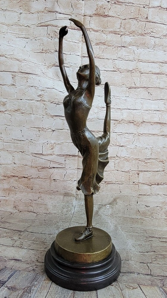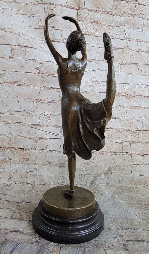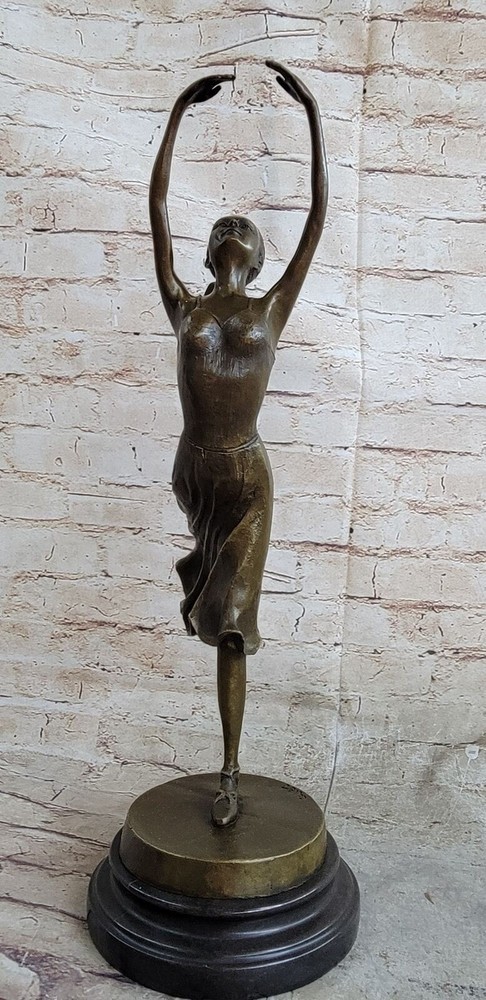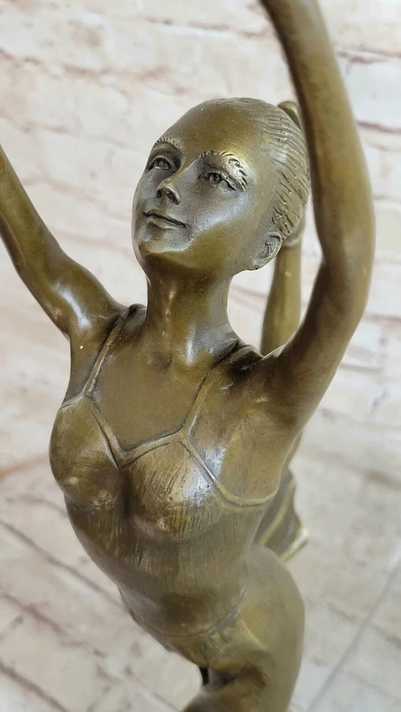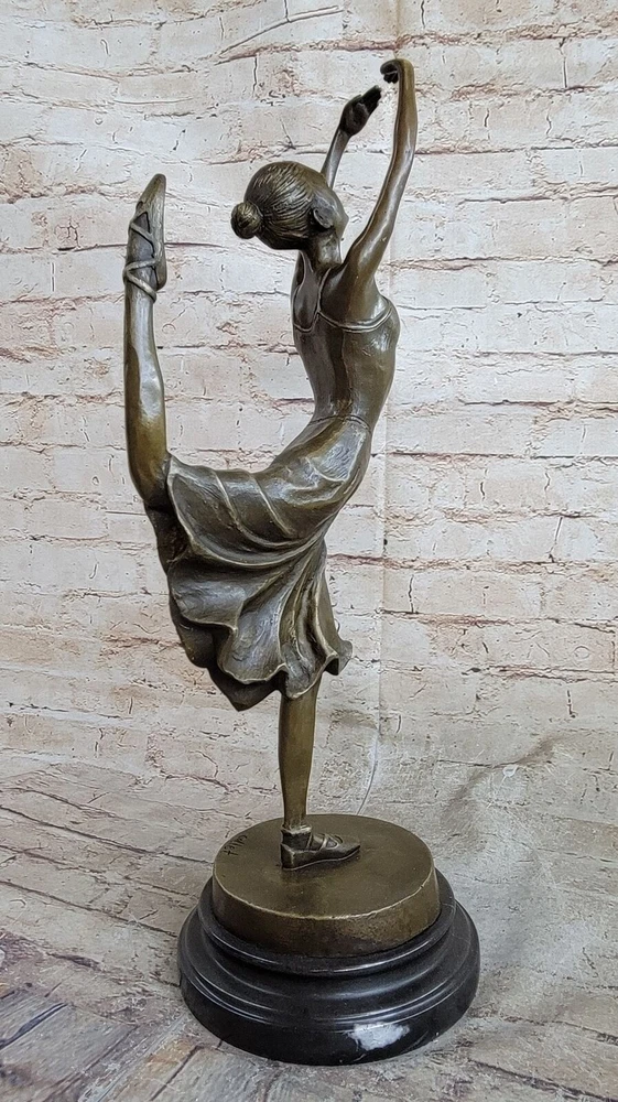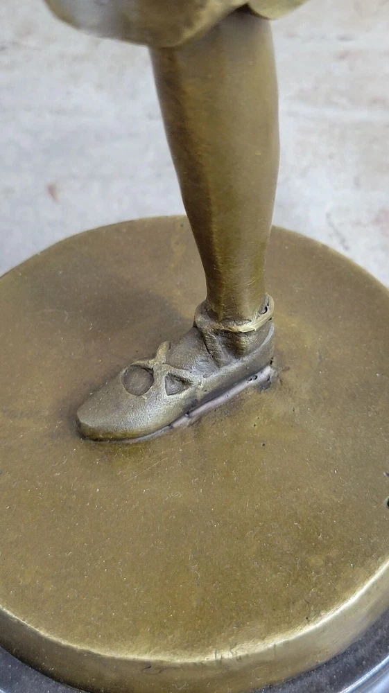 Condition : This sculpture is in perfect condition.nbsp; Bronze Dimensions with Marble Base: Height 19" x Width 10" Marble size: Diameter 6.5" Height without base: 17.5" Weight : 12 LBS Inventory:31YCN1398331 This captivating bronze sculpture portrays the beautiful ballet dancer Natacha Nattova, capturing the grace and elegance of her performance that so enamored a Prussian Prince. As you gaze upon the sculpture, the depth and warmth of the patina evoke a sense of calmness and tranquility, as if it were a snapshot of a lullaby frozen in time. With meticulous attention to detail, the sculpture depicts Natacha delicately pointing her toe, turning her body with grace, and even positioning her fingers in a polite manner. Her ballet dress, adorned with roses on the bodice and flowing at the hips, adds to the dimension and fluidity of her movement. From her ballet slippers criss-crossing around her ankles to her finely tied hair and delicate facial features, every aspect of Natacha's portrayal exudes beauty and charm. It's no wonder the prince was captivated by her presence. Signed by the artist Collet and mounted on a round marble base, this bronze sculpture is a timeless masterpiece that captures the essence of grace and romance in ballet. COLLET BALLERINA DANCER SIGNED BRONZE STATUE FIGURE HOT CAST SCULPTURE SALE Video will open in a new window Using the eBay App? Paste link into a browser window: [isdntekvideo]