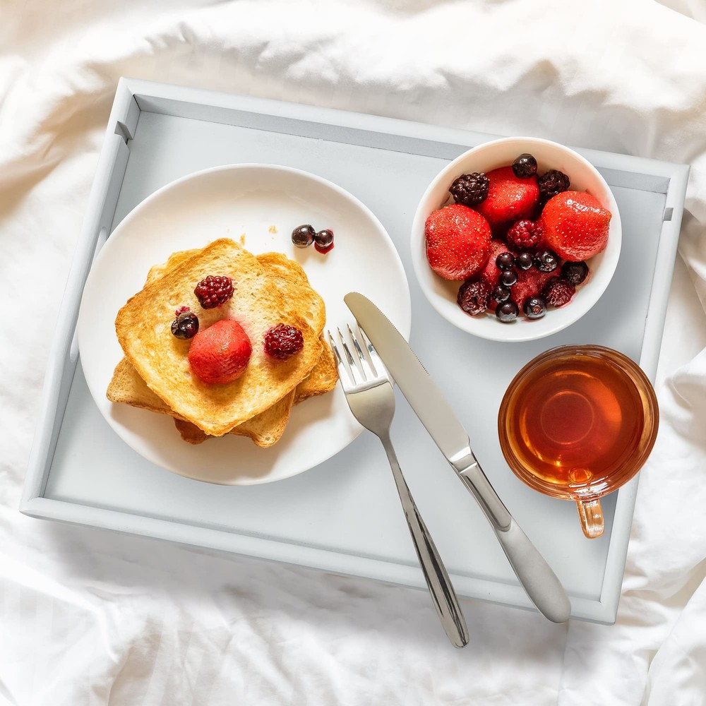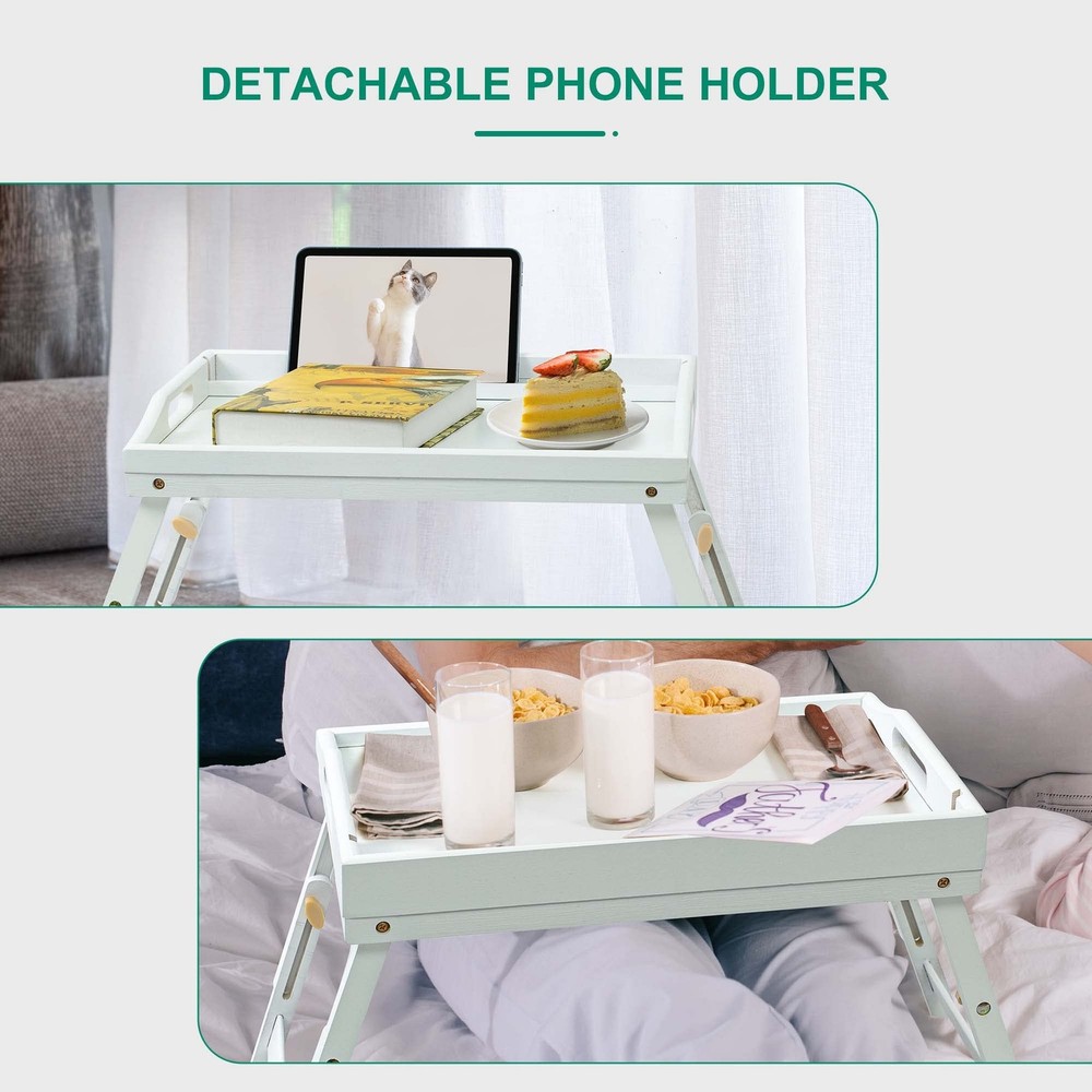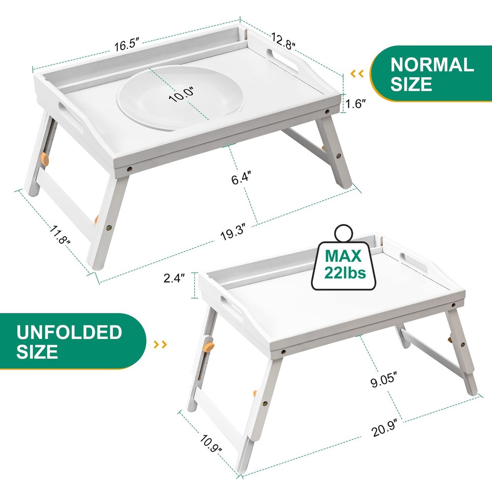 Bamboo Breakfast Bed Tray Height Adjustable with Foldable Legs and Widened Handles *When open, high to 11.4" and width is up to 21.7". Everyone enjoys food on bed, sofa. *High-quality bamboo tray is more environmentally friendly and serves you for many years. *Snack tray equips with widened handles and folding legs, carry easily to bedroom hospital, even picnic. bamboo breakfast bed tray allows you to enjoy food as you want, without worrying about liquids or food residue falling on clothes, sheets or carpets. Service tray with folding legs is easier to carry on a picnic. Suitable for gifts or personal use. Specification: Color: White Material: Bamboo Dimensions: 16.5L x 11.4H x 12.8W Inches Product Include: 1 x Breakfast tray Warm Tip: -Apply bamboo oil occasionally to make life of tray longer. -After using many times, the folded legs will become loose. When this happens, please use a screwdriver to tighten the screws. Customer Service: Please read the product instructions carefully, in the event of difficulties, do not hesitate to contact us. Our Goal is to Serve You until Get Your Satisfaction Upgrade Detachable Media Slot: Upgrade bed tray with a detachable holder can accommodate phone and tablet of different size and angle, It is convenient to browse phone and tablet while enjoying food Adjustable Folding Leg Height: Adjust from 8.7" to 11.4", Different from the fixed height of others, There are tick marks on legs of breakfast tray, easier for you to find a comfortable height when sitting on the bed or sofan legs of breakfast tray, easier for you to find a comfortable height when sitting on the bed or sofa Expanded Tray Area: Area is 16.5"L X12.8"W, placing 10-inch plates, Beyond its peers storing 9-inch plates, When the folding legs are laid flat without tools in seconds, easy for anyone to carry lap tray to picnic, hospital, kitchen, bedroom Natural & Sustainable Bamboo: Breakfast tray is made of natural and sustainable bamboo, clean quickly with a damp cloth, more eco-friendly and reusable, Suitable for adults and kids, accompany you for a longer time 【】: If you have any questions about this product, please do not hesitate to contact us, our service team is always here to provide you with satisfactory service