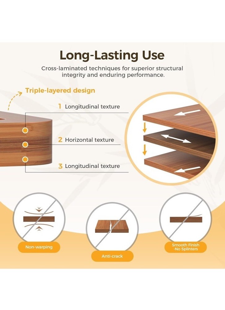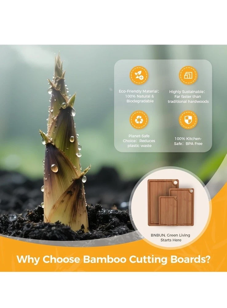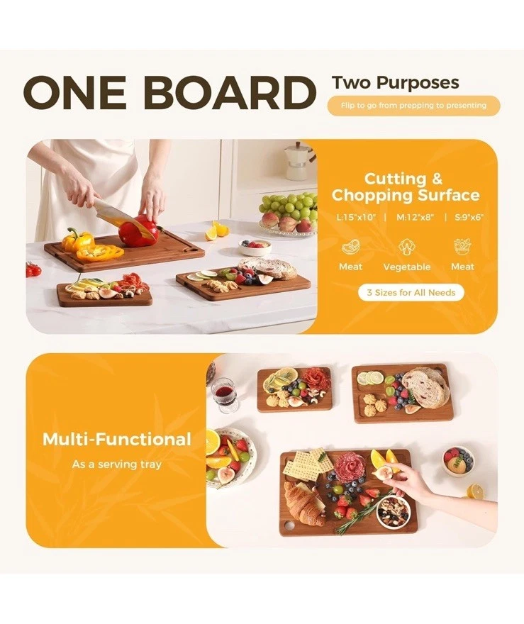 New item! 【Various Sizes to Meet Every Kitchen Need】 This three-piece bamboo cutting board set (15" x 10", 12" x 8", and 9" x 6") easily handles a variety of kitchen tasks, from chopping meat to slicing fruits and vegetables. The large cutting board makes it easy to chop larger ingredients, while the medium and small cutting boards are perfect for quick prep or serving cheese or charcuterie. 【Extra Durable and Eco-Friendly Construction】 These cutting boards are charred at 500°F (260°C) to absorb only 5% moisture. Made from sustainably sourced organic bamboo, which grows 30 times faster than hardwood, they are both environmentally friendly and durable. Cross-laminated for added toughness, these kitchen bamboo cutting boards resist warping and cracking with everyday use, enhancing their stability. 【Smart Features for Easy Use】 All bamboo cutting boards for kitchen feature built-in handles for easy lifting and dual-sided functionality—one side with a deep groove to contain liquids, the other with a wide groove for versatile prep. Non-slip pads and hanging holes ensure stability and space-saving storage, combining the practicality of wood cutting boards with modern convenience. 【Low Maintenance & Hygienic】 After use, simply rinse these cutting boards for kitchen with water—no complex cleaning needed. For maintenance, apply food-grade oil to form a protective layer, enhancing water resistance and preventing cracks. The natural bamboo surface stays smoother than typical wooden cutting boards, ensuring long-term hygiene.