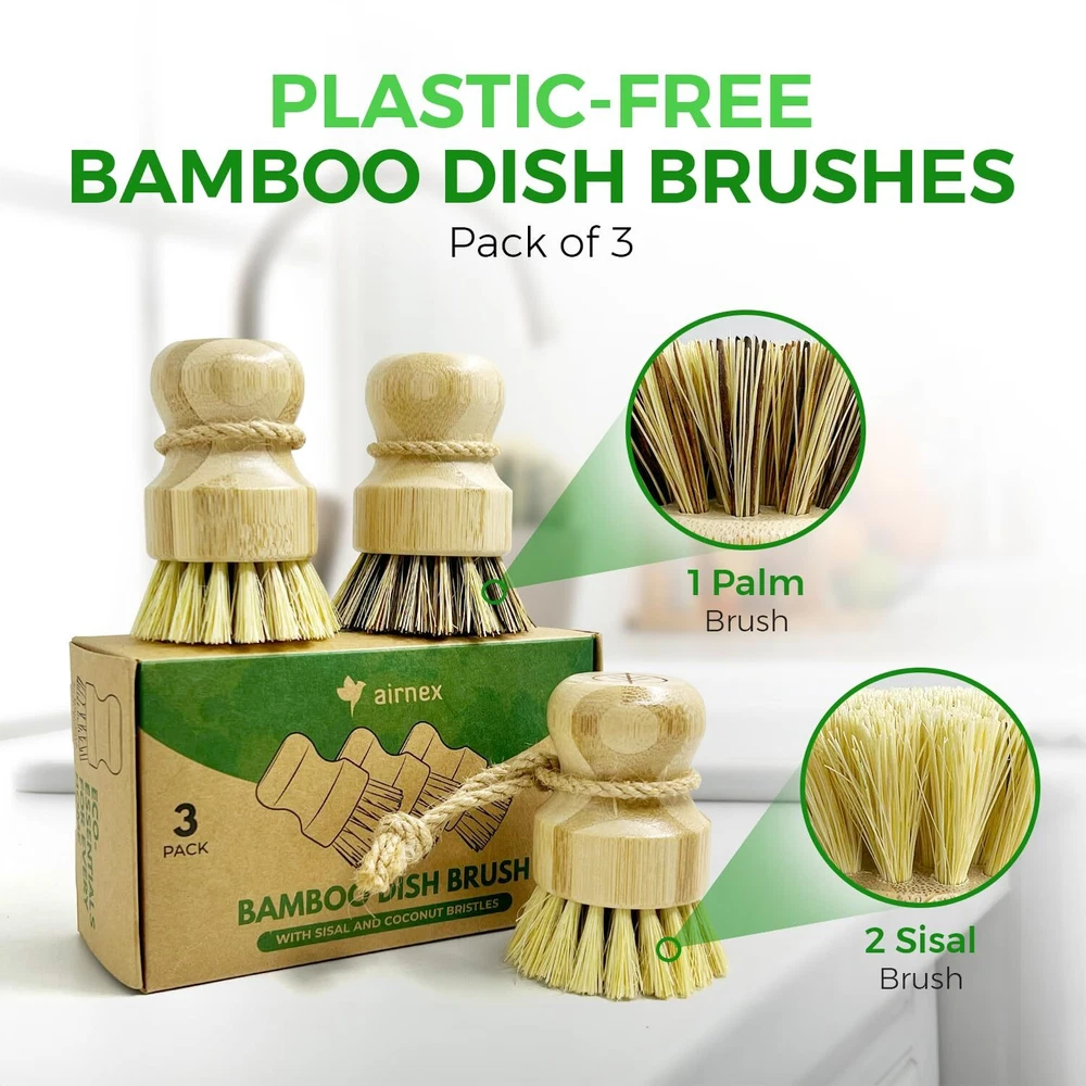 Bamboo Dish Brush Set of 3, 100% Plant-Based Kitchen Dish Brush Bamboo with Sisal and Coconut Bristles, 2 Brush Types, No Scratch Wood Sish Scrub Brush for Dishes, Quick-Drying, Odor Free NATURAL WOOD SCRUB BRUSH FOR DISHES - Make an eco-conscious choice with an AIRNEX wooden brush for dishes. Its sturdy bamboo head & high-density sisal and coconut bristles can outlast regular kitchen brushes for cleaning, without getting stinky. VERSATILE CLEANING - The set offers two dish scrubber brush types: 2 pcs light brush (medium stiff sisal bristles) ideal for everyday washing; and 1 pc dark brush (strong blend of sisal and coconut bristles) engineered for heavy scouring. 100% PLASTIC FREE - These bamboo kitchen brushes for dishes are plant-based, unlike usual scrubbers that pollute nature with microplastics. No glue or synthetics, just high-quality craftsmanship to prevent unpleasant odors & frequent replacement. NON-SCRATCH COMFORT - The non scratch kitchen scrub brushes are ideal for hard to reach spots, removing tough grime without leaving scratches. Designed to prevent hand fatigue, its ergonomic grip also keeps you from touching food wastes directly. PLANET-CONSCIOUS - AIRNEX is committed to defending the climate. All of the dish washing brush's packaging is recyclable and plastic-free. AIRNEX has also teamed up with 'Trees for the Future' to support reforestation, your purchase can result in two new trees. SHIPPING - We offer FREE shipping on all orders! - We ship within 3 business days of payment, usually sooner - We use a selection of shipping services such as UPS, FedEx, USPS etc - We only ship to the lower 48 states, no APO/FPO addresses or PO Boxes allowed International buyers – please note: Import duties, taxes, and charges aren't included in the item price or postage cost. These charges are the buyer's responsibility. - Please check with your country's customs office to determine what these additional costs will be prior to bidding or buying. - We have confidence in our products, but if you are not fully satisfied please contact us within 30 days of purchase and you will get full refund. * Order Cancellation Policy ** You can return a product for up to 30 days from the date you purchased it. 1. The seller reserves the right to cancel the special case only due to eBay cancellation fee. 2. The decision of seller is the final. 3. The seller will respond to the cancellation request within 2 business days. Please wait for the result of cancellation. 4. In case the cancellation is not completed by some reasons, the buyer can follow the options below to get the refund. 4.1 The buyer can reject the item when it arrives. 4.2 The buyer can send the item back to the seller within 30 days If the buyer receives item (USA Shipment ONLY). The seller will provide the FREE return label to the buyer when the buyer opens " Return Item" case on eBay by using the reason as "Change my mind" ONLY. 5. When buyer has placed the order. The order will be processed and completed by automatic warehouse system within 5 minutes. In case that buyer sends the cancellation request after 5 minutes of placing the order, the request will be rejected. **Sending direct message to cancel the order is not allowed for every case.* Return Policy For the return case - If buyer would like to return the items for refund or replacement, please CONTACT SELLER to receive the free return label from seller. The refund or replacement will be processed with the tracking number of return label which is provided by seller only. The other ways of return which are not approved by seller will not be processed for the refund or replacement. CUSTOMER SERVICE - We try our best to make sure every customer is completely satisfied. - If there's a problem, feel free to message us! - We're happy to help.