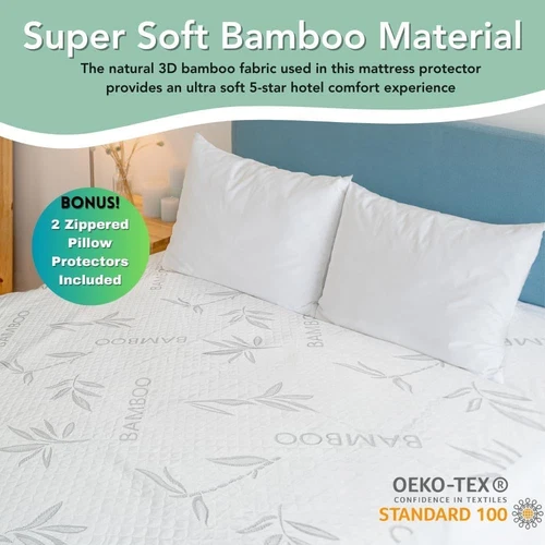 Bamboo Rayon Mattress Protector with Zipper + 2 Pillow Protectors - 100% Waterproof Cooling Queen Size Cover - Ultra Soft Fabric Breathable Noiseless Mattress Pad Covers Zippered Encasement LuxeFusion Product Description As you sleep your body gives off heat that's why our Premium Mattress Protector is specifically designed to prevent these issues. This will keep you healthy, clean and fresh after a long night's sleep. The fabric on this protector will provide you heavenly comfort and its layers will protect your mattress from any liquids. Made of premium polyester microfiber and polyurethane lining, bring you a soft & silky feel of nature. Also it comes with a zipper to keep the mattress 100% protected from all angles and do not worry about the cleaning because you can easily wash it with no trouble or headache. Features Includes 2 Pillow Protectors Size Queen/Standard Queen Size Mattress Protector measures 60 x 80 inch Perfect for any Mattress: Keep your expensive mattress in perfect condition! Our mattress protector is designed for all types of mattresses including latex, memory foam, and innerspring. Our zippered mattress protector comes with a zipper that zips around the entire mattress so that both top and bottom are covered, it's stretchable and secured by a protected zipper. WATERPROOF AND NOISELESS: Our waterproof mattress cover repels water and any type liquids including accidental spills and bodily fluids such as sweat or urine, which makes a clean/healthy sleeping environment. It's the Perfect choice for nursing sick kids, potty training and if you have pets in your home. It is also noiseless and makes zero sound. It is completely silent and makes no crinkling sound when you move on your bed! Ultra Soft Breathable Material: Our mattress toppers are made from the finest quality rayon derived from bamboo with a small combination of polyester to create the most durable and Ultra soft fabric that will always keep you comfortable. The surface is relatively softer, smoother, and breathable. With the new cooling material technology, our mattress protectors provide a cooling effect that distributes heat evenly and regulates body temperature so you can have a cool sleeping environment. Easy Care Instructions - Our Mattress protectors are very easy to maintain. Machine wash cold separately on gentle/delicate cycle. Tumble dry on low. Do not bleach. Do not dry clean. We suggest you buy 2 pieces or more, so you can change one while washing the other. Product Details Brand: Laven Birch Color: White Size: Queen Fabric Type: 60% Polyester, 40% Rayon Derived from Bamboo Special Feature: Cooling, Water Proof, Noiseless, Washable, Breathable Closure Type: Zipper Product Care Instructions: Machine Wash Water Resistance Level: Waterproof Age Range (Description): Adult, Youth Material: Bamboo Viscose Model Name: Mattress Protectors Number of Items: 1 Manufacturer: Laven Birch Product Dimensions: 60 x 80 x 18 inches Item Weight: 3.91 pounds Country of Origin: China Item model number: 0000 🚚 Free Shipping All orders ship free and fast to your doorstep. 🔁 Easy Returns Satisfaction guaranteed. 30-day returns, no questions asked. 💬 24/7 Support Contact us anytime; we’re here to help, day or night. Brought to you by LuxeFusion – Quality you can trust.