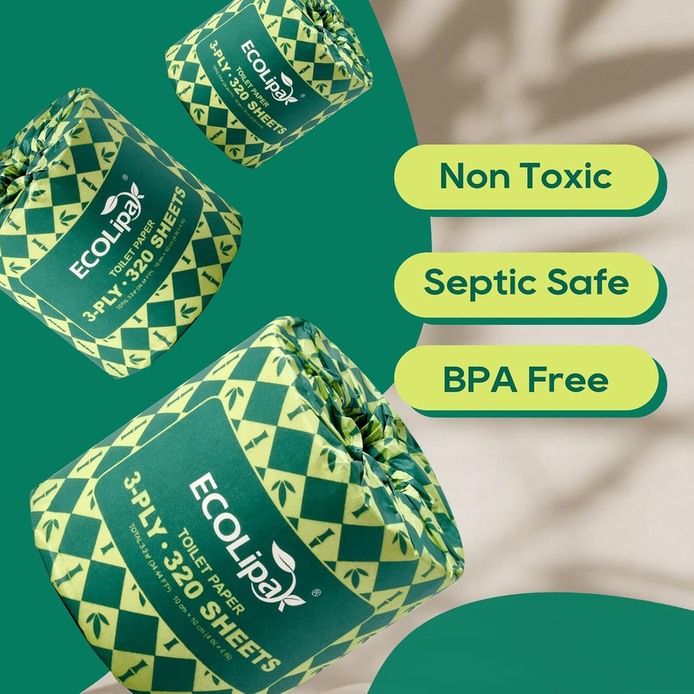 Good For The Environment: Bamboo toilet paper is made entirely from renewable and eco-friendly bamboo, which does not harm any trees. Using these toilet papers protects the forests and our planet! Septic Safe: Toilet paper is dissolvable and can be flushed with confidence. Perfect for a variety of disposal systems, use as home bathroom toilet paper, RV toilet paper, or travel toilet paper. Exquisite Packaging: You will receive 12 rolls of toilet paper with attractive individual packaging. When stored, toilet paper is not exposed to the outside, which prevents it from becoming damp. Additionally, it keeps your bathroom very clean, tidy, and vibrant. Safety: Biodegradable toilet paper uses only bamboo as a raw material and is septic safe, non-toxic, chemical free, does not cause allergies, no scent, unbleached. Go ahead and use it! Soft And Absorbent: Tree-free toilet paper is made with a carefully designed grain and a special process, free of fine lint and fibers on the surface, making these papers very soft and absorbent. Environmental Action: ECOLipak has always insisted on making environmentally friendly products to contribute to the earth we live on. Use these bamboo toilet papers and protect the earth with ECOLipak. Product description Septic Safe These toilet papers dissolve quickly and keep the system running smoothly. Non-septic safe toilet papers can cause clogged pipes and sewage backups. Tree Free Bamboo is a renewable material and by using these tree-free toilet papers you are preserving the forest. Dye-Free Toilet paper is produced without the use of dyes and chlorine, only with the help of our advanced production process, Say goodbye to harsh chemicals. BPA Free BPA is a chemical additive that can cause adverse reactions in people.ECOLipak never uses these.