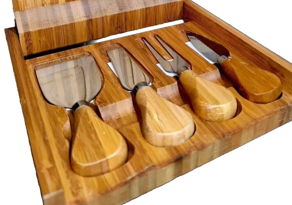 Bamboo Cheese Board with Cheese Knives (3) Cheese Fork (1) Magnetic Storage inside. 7.50" x 7.50" 1.875" high. Used with the original box. Usage wear and scuffing on Wood board and handles. See photos.