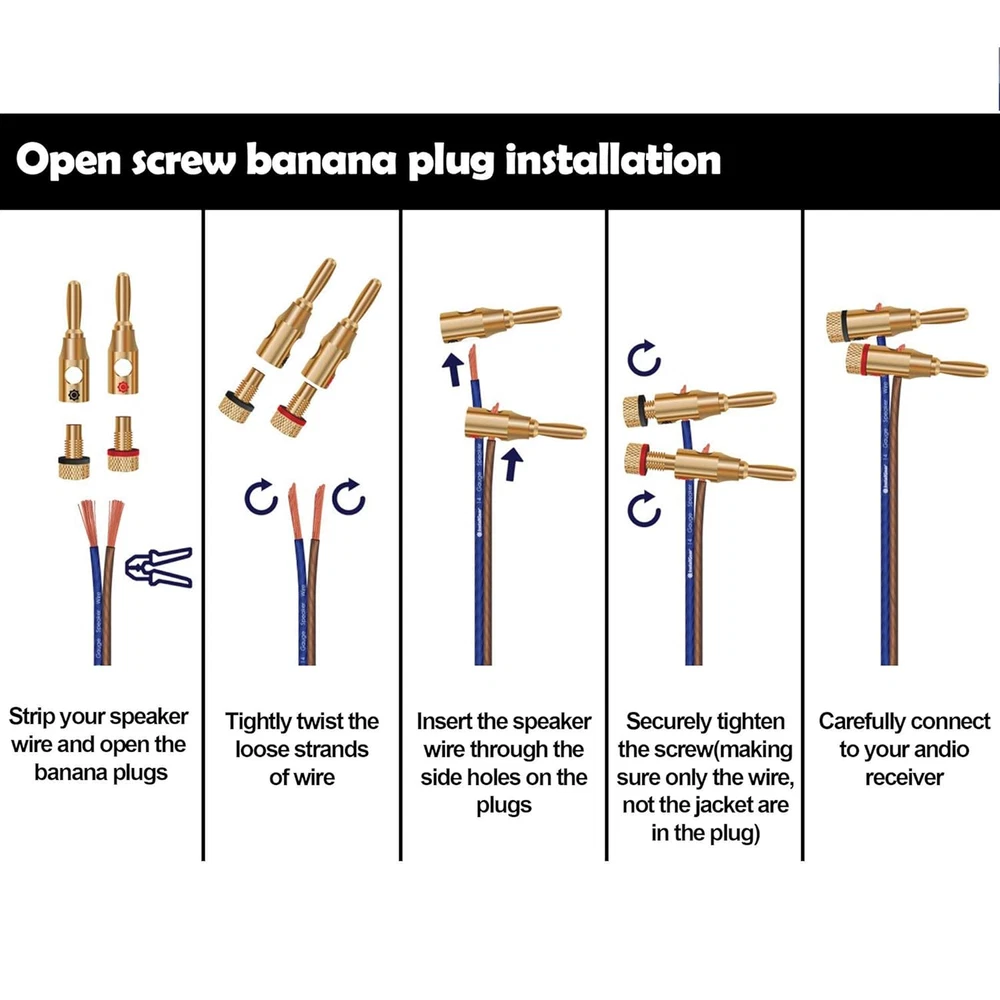 Store New Arrivals Add to Favorite View Feedback Contact Banana Plugs Open Screw 24K Gold Plated Plugs Audio Jack Connector for Speaker Stereo Cable, 24-Pack (12 Red, 12 Black) Description Item model number EP0001 Cable Type XLR Connector Type Screw Compatible Devices Speaker Special Feature Low Voltage Package Dimensions 5.51 x 4.41 x 0.67 inches; 5.93 ounces 12pair/24 Open Set Screw Banana Plugs , no soldering needed Standard size fits most speakers The simple design of the banana plug makes it easier to create your own wires Accepts 12 to 18 Gauge Speaker Wire (connect from 2mm up to 4mm diameter speaker wire) Built with 24k gold plating which allows for more durability and prevention of corrosion. Red/Black Gear Logos for Easy Channel Identification Product Description Features: Banana Plugs 12 Pairs / 24 pcs, Open Screw 24K Gold Plated Plugs Audio Jack Connector for Speaker Wire, Wall Plate, Home Theater, Audio/Video Receiver, Amplifiers and Sound Systems Installation. These quality plugs are the closed screw type and can accept bare wire or spades. They are sized to fit speaker wire from 12 to 18 AWG. Each pair comes with one plug color coded red and the other coded black, for easy polarity identification. The open screw design of these stereo speaker plugs doesn't have the need for soldering, and the standard size fits most speakers, allowing you to simply feed a piece of bare copper conductor into the hole and secure it with the screw. The quality material and thoughtful design of our speaker wire jack plugs can provide you with a crisper, clearer, and more accurate sound experience. Installation: Step 1 Strip your speaker wire and depart the banana plugs Step 2 Insert the speaker wire through the side holes on the plugs Step 3 Tighten the screw securely (make sure there is only the wire core in the plug) Step 4 Connect to your audio receiver carefully Specification: Material: Copper Gold Plated Size: 4mm length: 40mm Surface Package Contents: 24 x Banana Open Screw Plugs (12 Black + 12 Red) ABOUT US We offer the best prices around on high quality products. Our E-store includes media such as books, movies, music and games while offering electronics, toys, sporting apparel, clothing, tools, general home, garden items and more. SHIPPING We are always working hard to ensure your package arrives as soon as possible. Please understand that some factors like weather, high postal traffic, and the performance of shipping companies are outside of our control. We offer free shipping to the lower 48 states and ship within 2 business days of payment, usually sooner. We do not accept P.O. Boxes. Please provide a physical address. For shipping outside of the continental USA, we only use eBay's Global Shipping Program.The item is shipped to KY and then sent to the rest of the world. International customers are responsible for all duties and taxes. Continue to check out in order to calculate costs for shipping the item to your country. Messages regarding eBay's Global Shipping Program MUST be directed at eBay EXCLUSIVELY. RETURNS We offer a 30-Day Return Policy on items which you are not completely satisfied with. You have the option for a full-refund or an exchange of the item. No returns are available on items shipped outside of the USA. PAYMENT We accept PayPal. CONTACT US This page content is yet to come Please ad us to your favorite seller and visit again later Thank You CUSTOMER SATISFACTION We try our very best to make sure every customer is completely satisfied. If there's a problem, message us! We're happy to help. WE ACCEPT Copyright © 2021 AutoDS. | All Rights Reserved