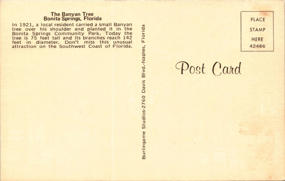 MAKE AN OFFER. THE MORE YOU BUY THE BETTER DEAL I WILL ACCEPT The postcard highlights the Banyan Tree in Bonita Springs, Florida, which was planted in the Bonita Springs Community Park in 1921 by a local resident. The tree has grown significantly over the years, now standing at 75 feet tall with branches that reach a diameter of 142 feet.