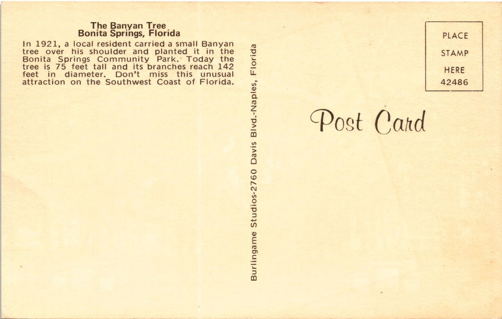 MAKE AN OFFER. THE MORE YOU BUY THE BETTER DEAL I WILL ACCEPT The postcard highlights the Banyan Tree in Bonita Springs, Florida, which was planted in the Bonita Springs Community Park in 1921 by a local resident. The tree has grown significantly over the years, now standing at 75 feet tall with branches that reach a diameter of 142 feet.