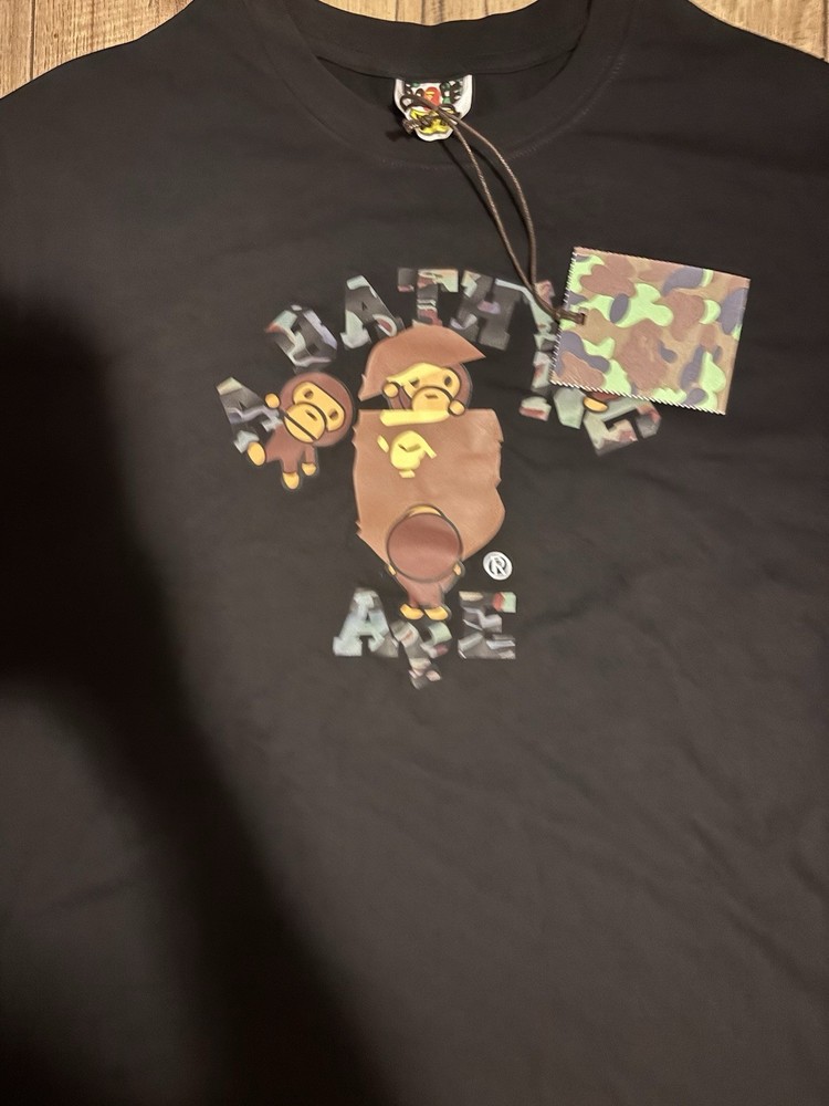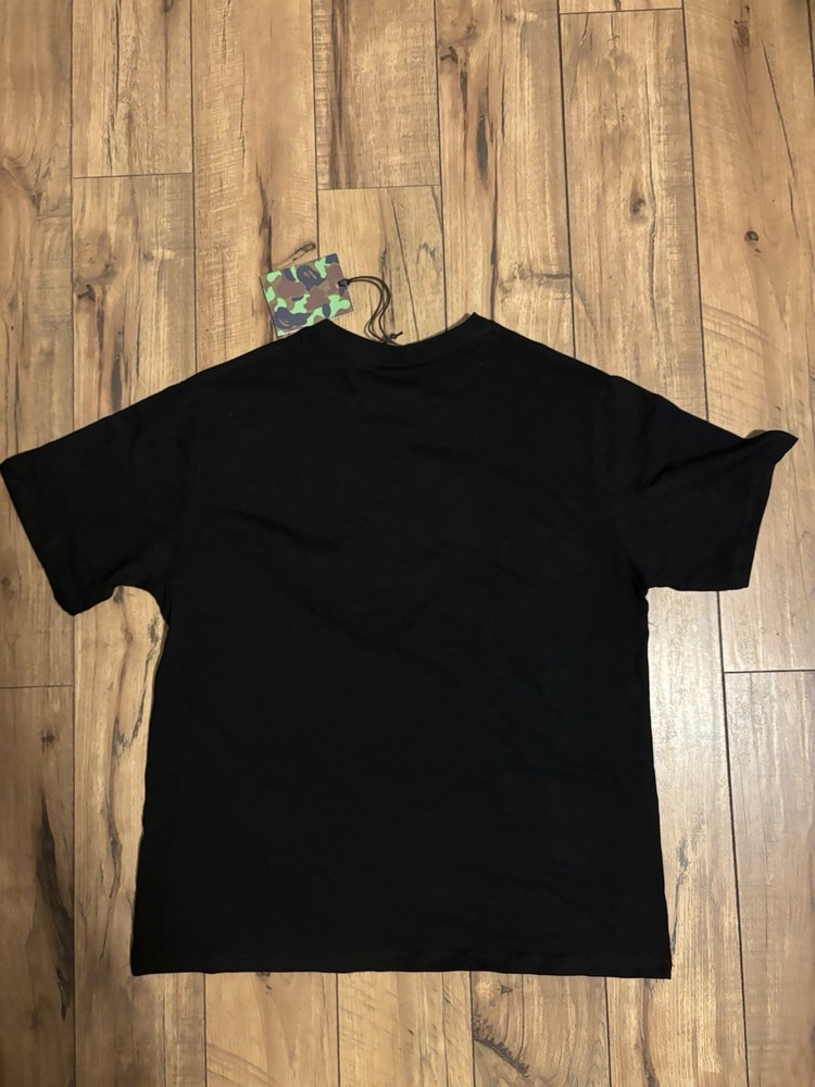The Bape ABC Camo College Milo Tee in size medium is a stylish and trendy black T-shirt for men. Featuring a camouflage pattern with a college theme, this regular fit shirt from Bape is perfect for casual wear. The medium size ensures a comfortable and flattering fit for anyone looking to add a unique and fashionable piece to their wardrobe. the tag says XL but it's M