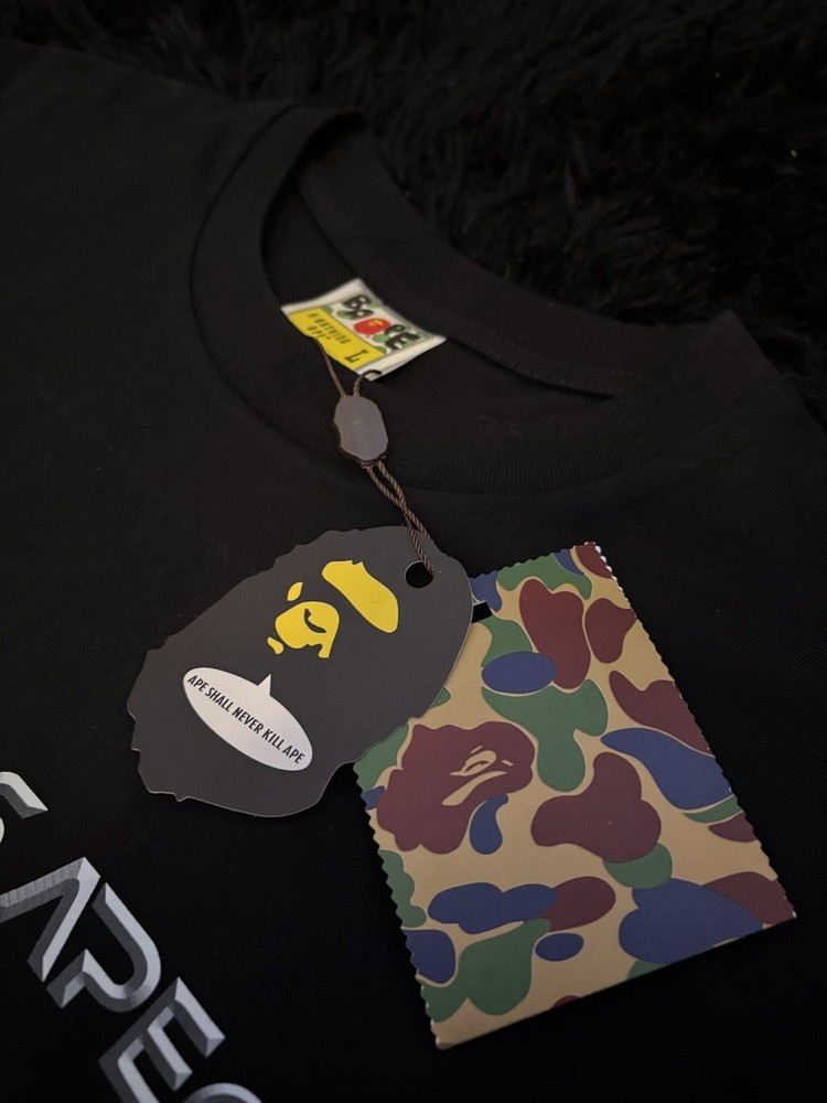 The Bape Men's Short Sleeve T-Shirt in size Large and black color is a stylish and versatile addition to any man's wardrobe. Made from comfortable cotton jersey fabric, this crew neck shirt features a regular fit and is machine washable for easy care. With its classic design and designer brand, this tee is perfect for the summer season and can be worn throughout the year in all seasons. Ideal for casual wear, the Bape T-Shirt is a must-have for those looking for a fashionable and high-quality piece of clothing.