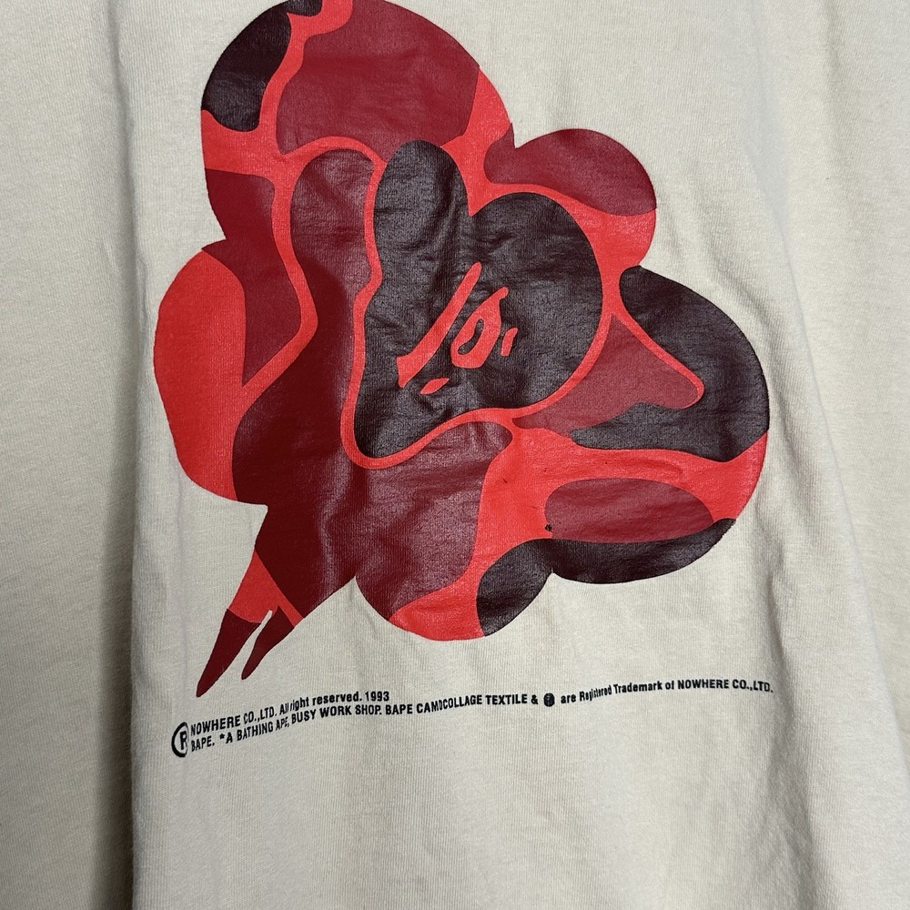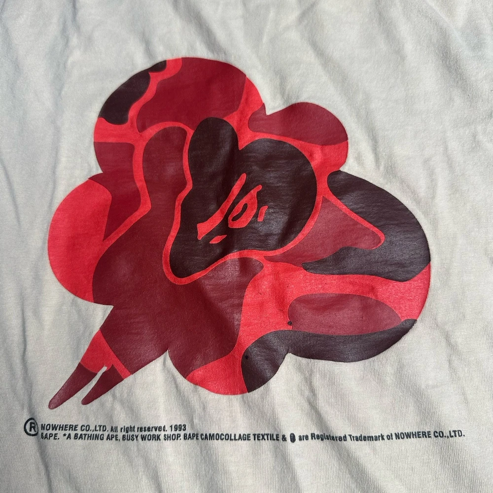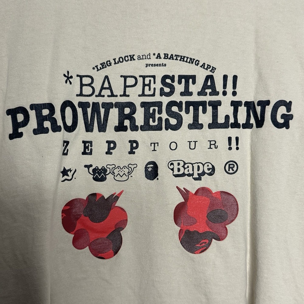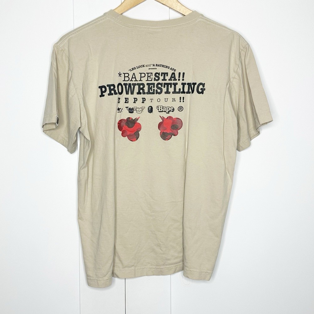 Vintage 1993 Bathing Ape (Bape) pro wrestling tee The graphic features the Bathing Ape (Bape, logo in a red and black camouflage pattern, depicted in a wrestling pose, specifically applying a leg lock. Bape Sta!! Pro-wrestling event (limited release) This is a collector’s piece! Excellent used condition. No holes or stains. Non smoking home. #vintagewrestling #prowrestling #90’swrestling #collectors #vintage