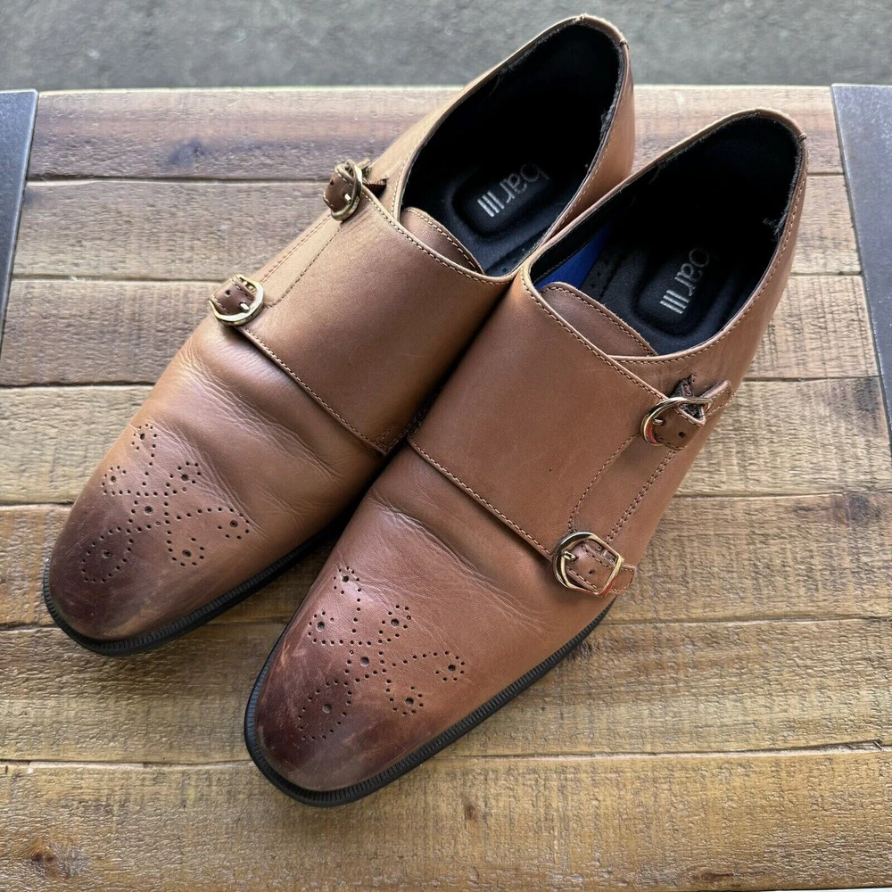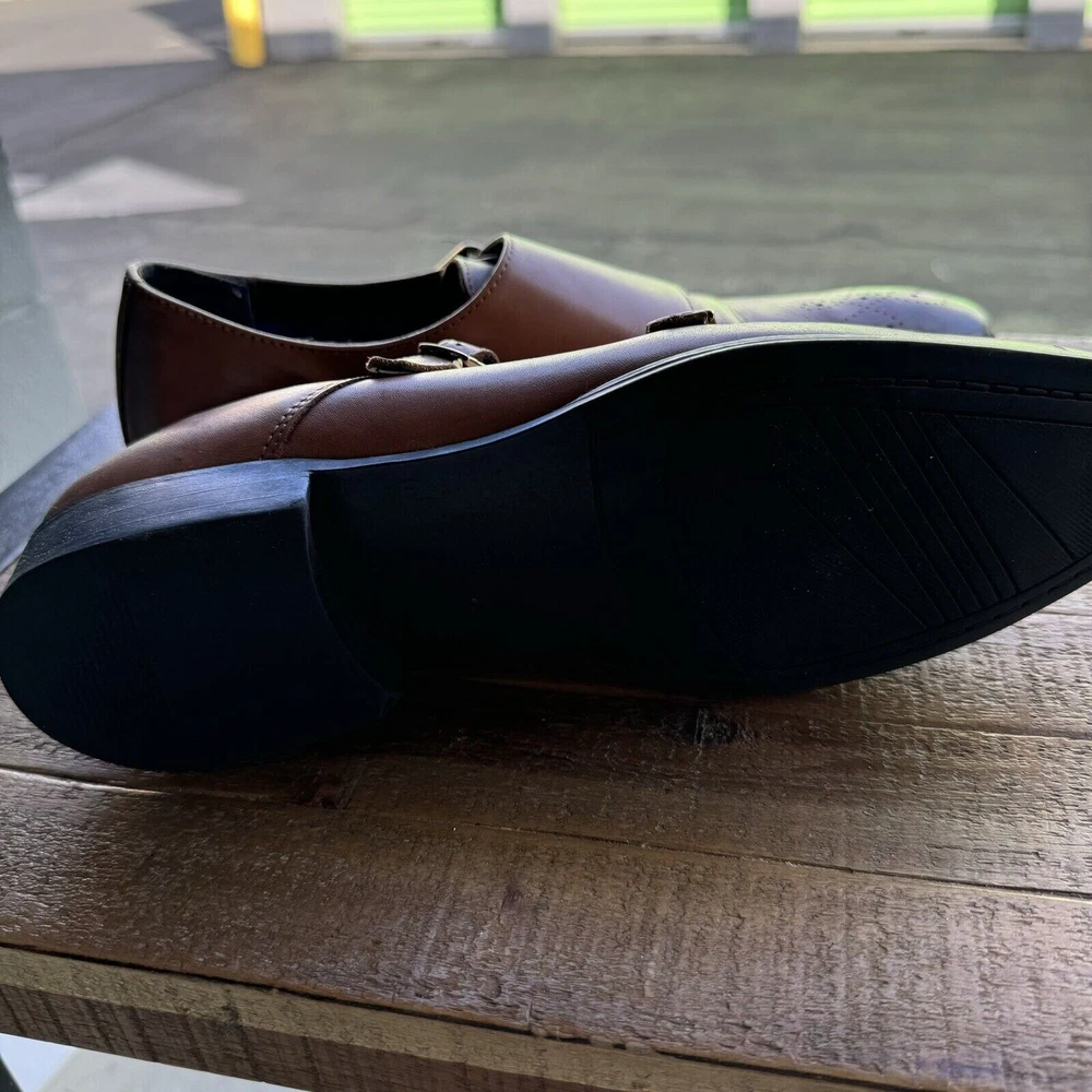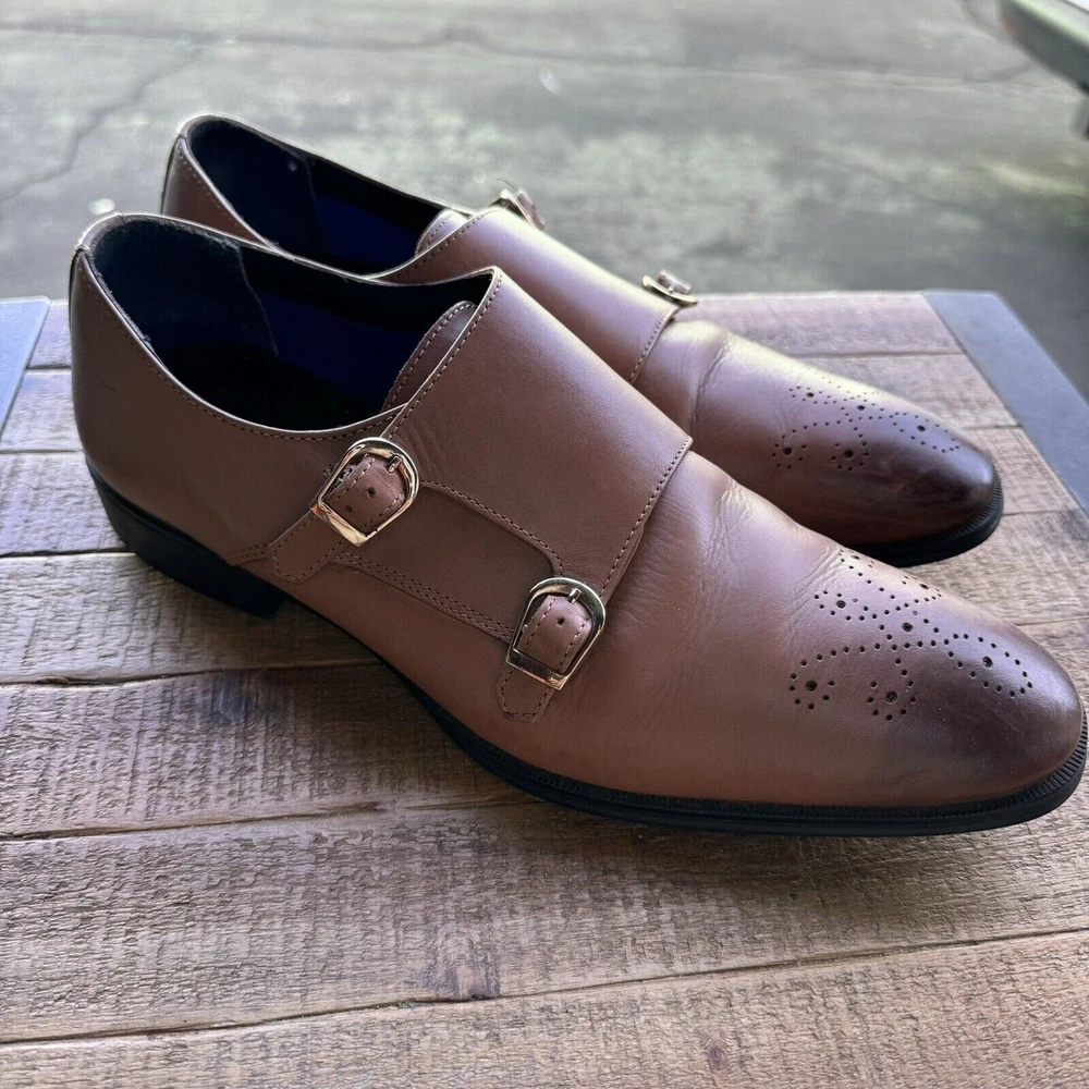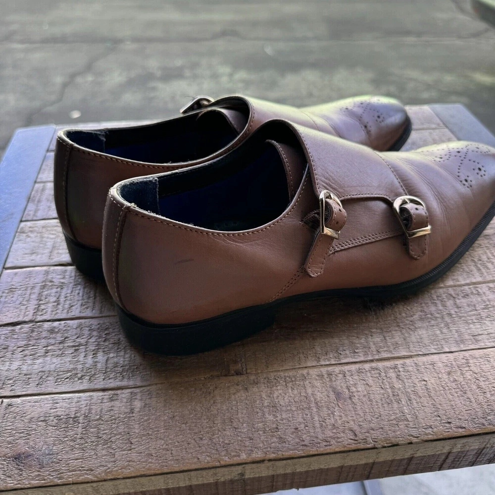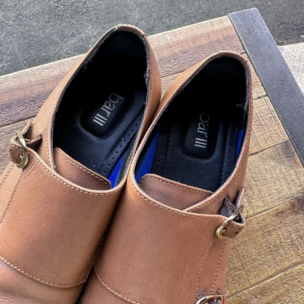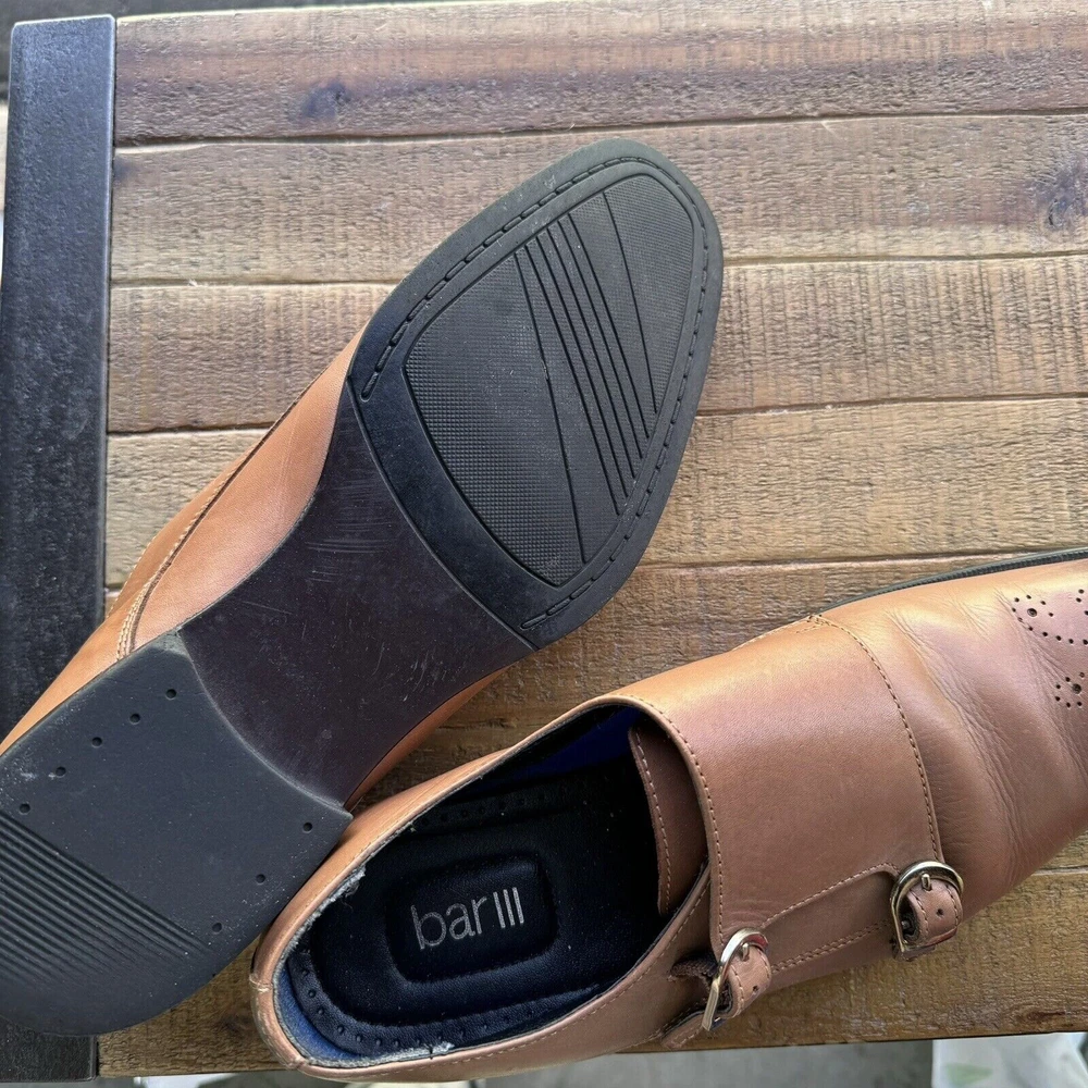 This is a Bar III Carrick Monk Strap Leather Dress Shoe in Tan for Men's size 9. It features a solid color brown design, a monk strap style with straps, and is made of leather. This shoe is suitable for formal occasions and would complement a professional or dressy outfit. Shipped with USPS Ground Advantage.