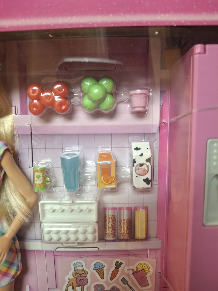 See photos. TEAR at top of box and DENT at bottom of box. Product never used. No items removed from box. This is bright pink Barbie doll refrigerator with double doors . The packaging artwork shows Barbie opening the fridge and holding a carton of milk. Inside the illustrated fridge are miniature food items and shelves for pretend play. The design has a modern look with silver handles and fun kitchen details, making it a colorful accessory for Barbie dollhouse or kitchen play.