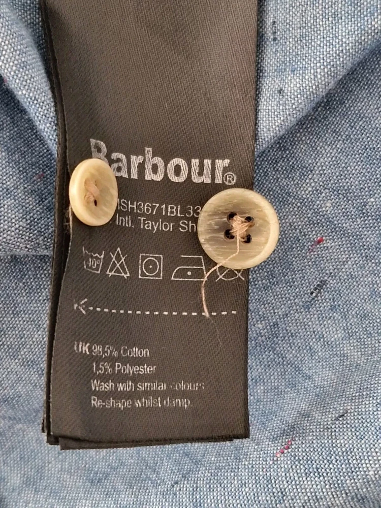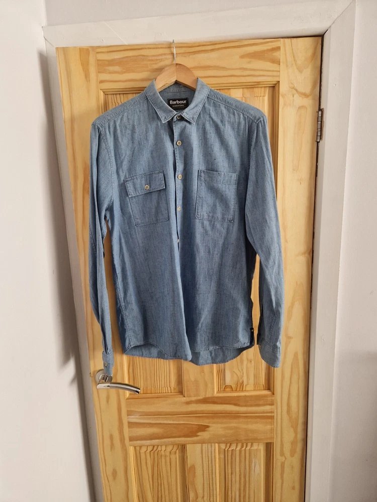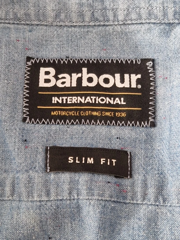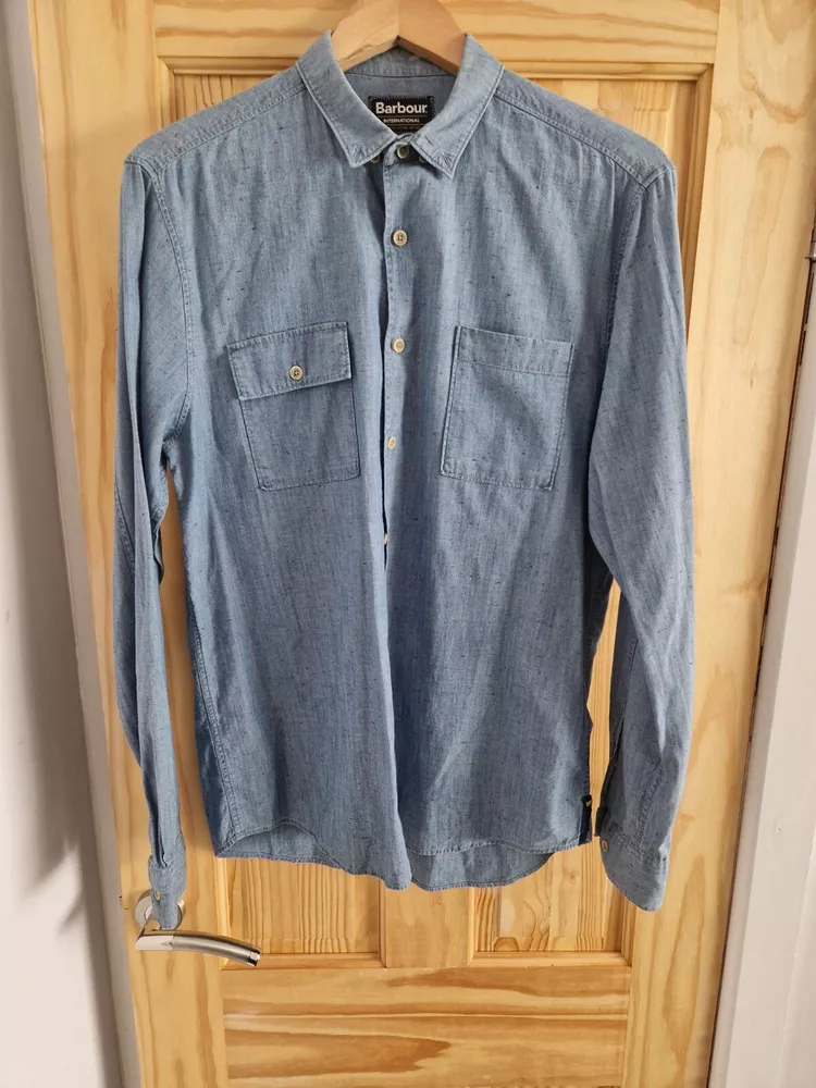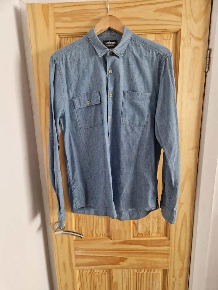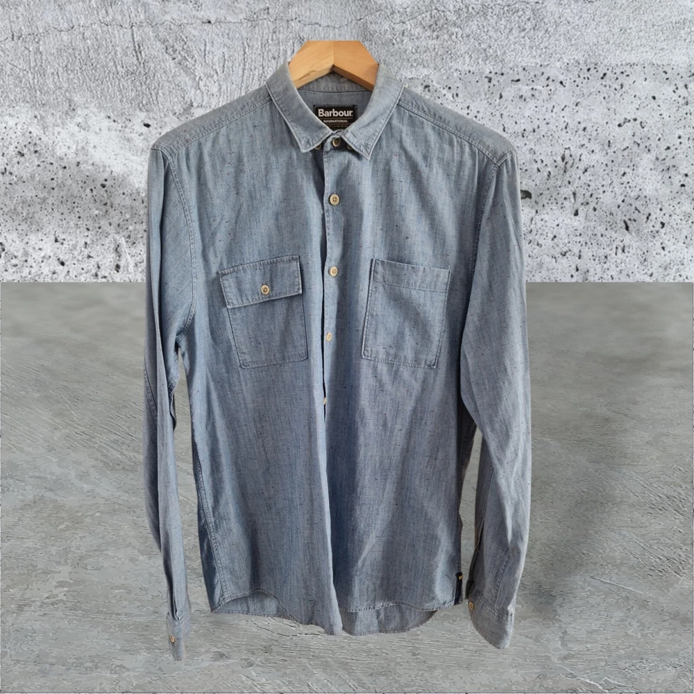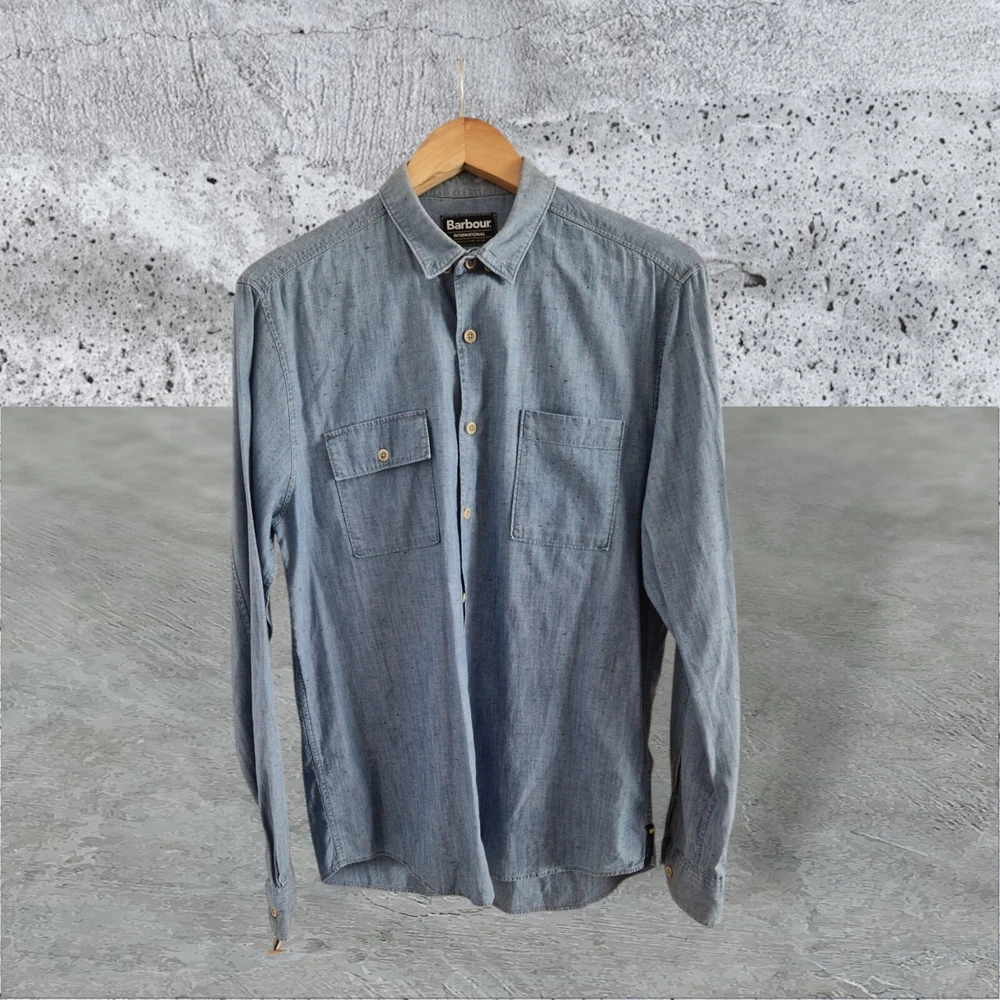 Pit to pit - 20 inches Length - 26 inches Crafted for the style-conscious individual, the Barbour International Denim Casual Shirt is a versatile addition to any wardrobe. The medium size ensures a slim fit, while the long sleeves and collared neckline offer a classic silhouette perfect for any casual occasion. Its solid medium blue hue is easy to pair with a variety of bottoms, making it a go-to choice for those who appreciate simplicity and quality. The shirt is made from a breathable cotton blend, which provides comfort across all seasons. Embroidered accents and button details add a touch of sophistication to this machine washable piece. Whether you're out for a casual meet-up or enjoying a laid-back day, this Barbour denim shirt will keep you looking effortlessly put together.