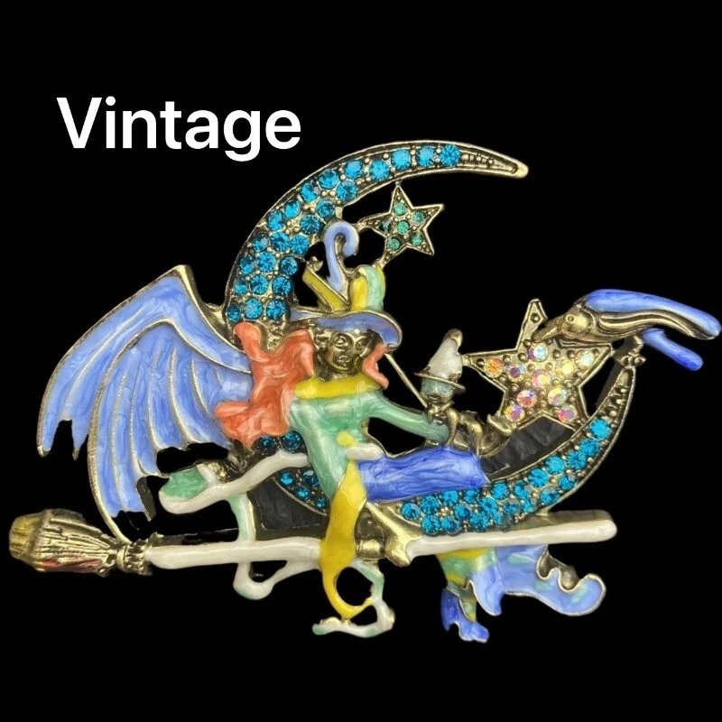 Baroque Vintage Enamel Blue Fairy on Moon Witch Women Brooch Pins Accessory