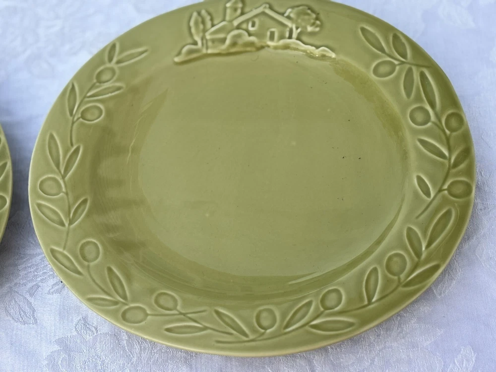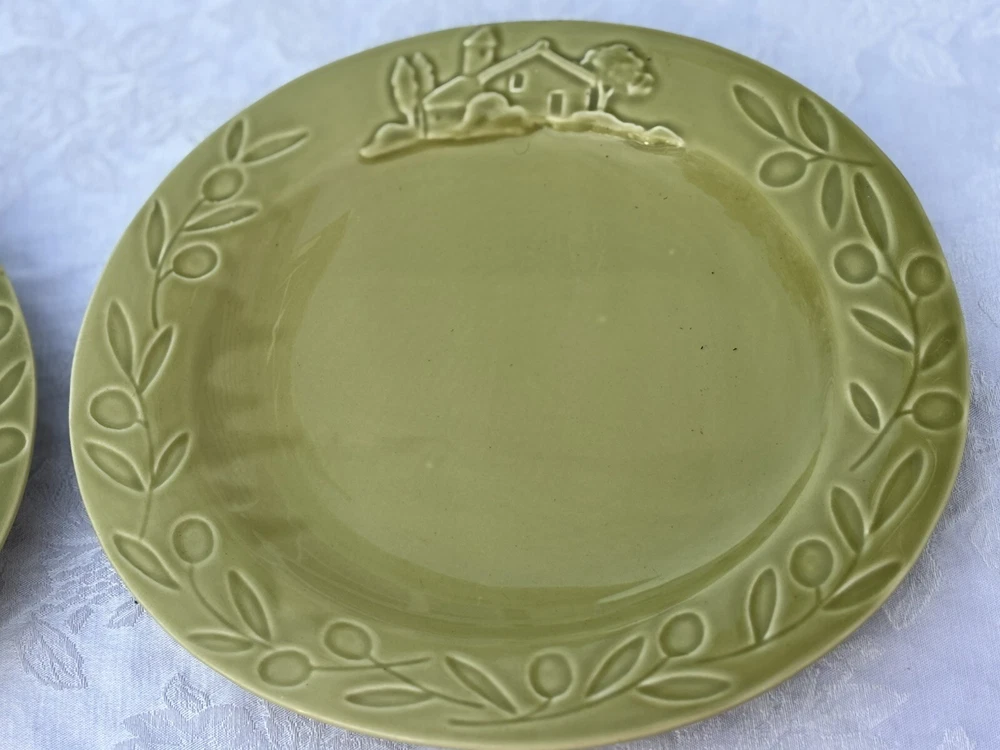 Add a touch of country charm to your dining table with these Barrarte Brand Salad Plates. The oval-shaped plates feature a decorative raised pattern and are made of glossy ceramic material. The plates are handmade and designed with a farmhouse olive branch ri pattern, making them perfect for all occasions. These two-piece plates were manufactured in Portugal in 2001 and are licensed reproductions. They are suitable for teens and adults and require hand wash only for care instructions. The plates are 8 inches in length and 1 1/2 inches in height, with an item weight of 2.8 lbs. They are perfect for serving salads and other dishes and are sure to add a touch of kitschy style to your dining experience. Returns accepted within 30 days; buyer pays return shipping
