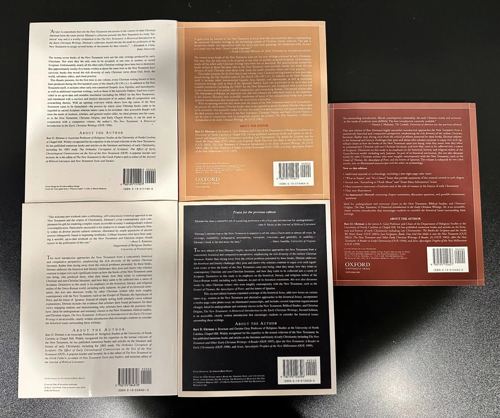 Bart D. Ehrman New Testament 5 Book Lot. Titles Include - The New Testament and other Early Christian Writings: A Reader, The New Testament and Other early Christian Writings: A Reader, 2nd Edition, The New Testament: A Historical Introduction to the Early Christian Writings, The New Testament: A Historical Introduction to the Early Christian Writings, 2nd Edition, The New Testament: A Historical Introduction to the Early Christian Writings, 3rd Edition. Ships free via USPS Media Mail.