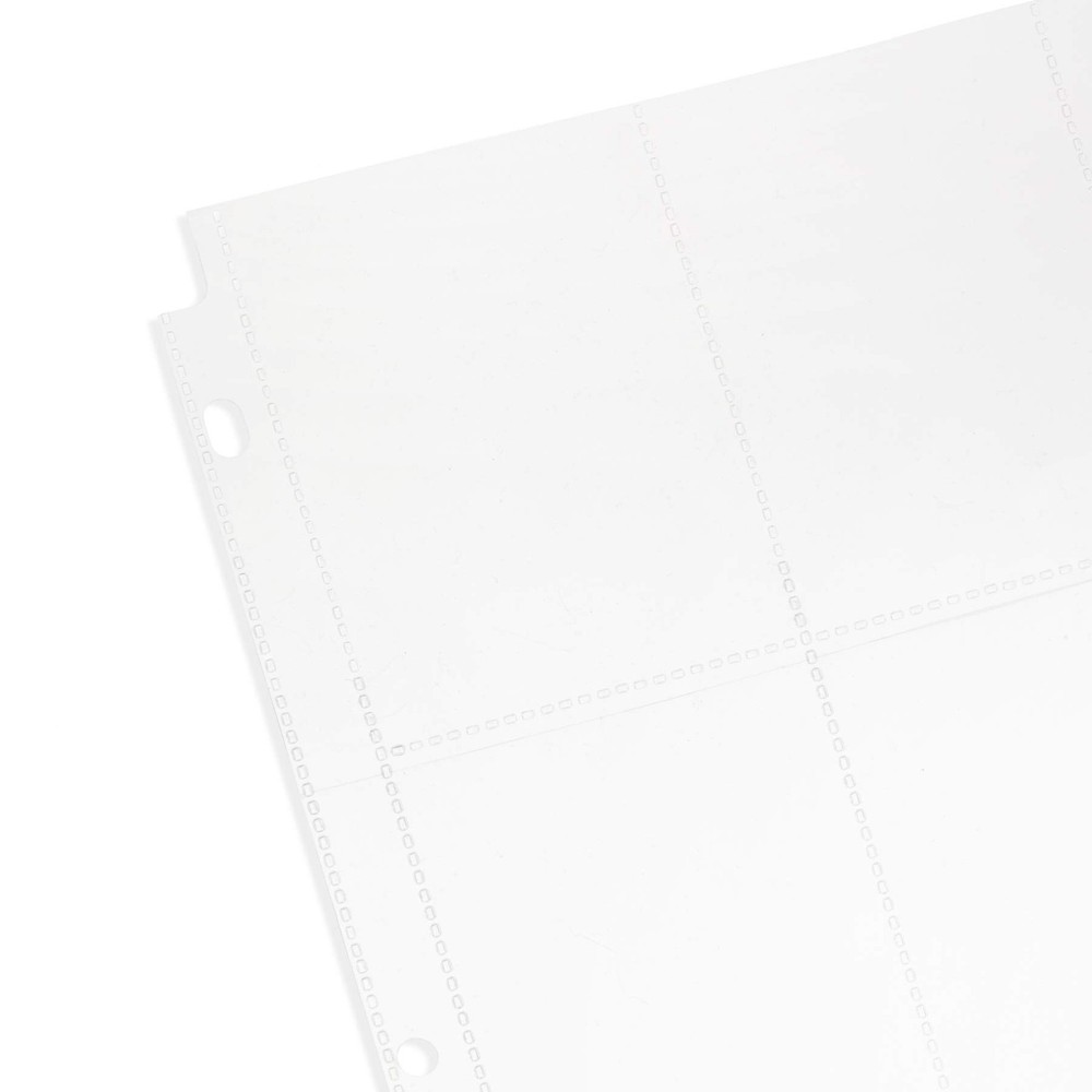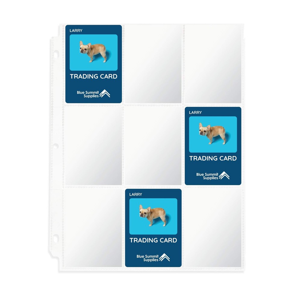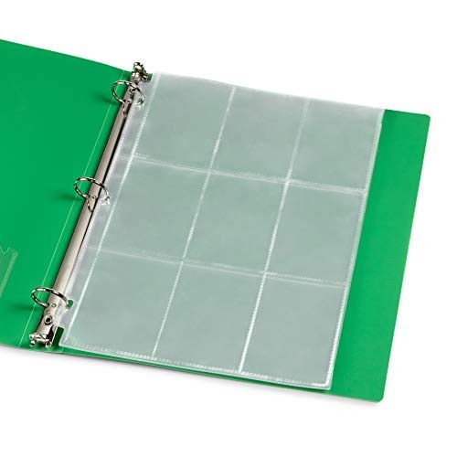 High Quality Card Sleeves Binder Sheets, Designed to Keep Trading Cards Safe Show and protect your trading cards with our trading card sheets, featuring: Durable, clear, plastic that allows you to see your cards, while keeping them safe from damage and wear. Three-hole punched on the left edge for easy and safe keeping in any ring binder Trading card sleeves feature 9 card slots, and with 100 sheets, will protect hundreds of your cards Durable, Plastic Trading Card Sheets for Protecting Baseball Cards, Pokemon Cards, and More This set of 100 card sleeves binder sheets will fit all standard trading cards. Ideal for use by collectors and traders, who want to keep their cards in pristine condition Works great for storing large quantities of trading cards in binders, while still being able to show them off and protect them Protect your baseball cards, Pokemon cards, business cards, and more with this 100 pack of trading card sleeves. These trading card sheets will prevent all sorts of collector cards from being damaged by fingerprints, being bent, and fit perfectly into a binder. Each of these card sleeve pages is made of durable plastic for extra security when you want to preserve and share your collectable cards Each of these card sheets for 3 ring binder hold up to 9 cards singled sided, or 18 cards double sided, and with 100 card sleeve pages, will protect hundreds of cards from your collection. These binder card sleeves are designed with three holes along the left edge, allowing them to easily and securely fit into any binder for safe keeping.