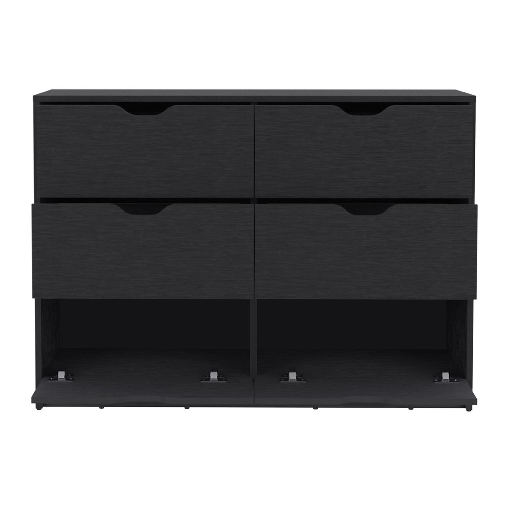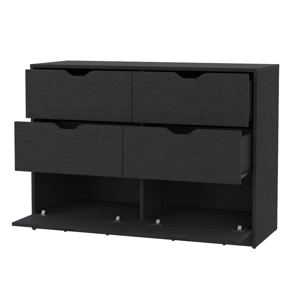 This dresser is a game-changer for storage—spacious drawers keep clothes tidy, while the smart pull-down cabinets are perfect for shoes. The smooth pull-out mechanism makes organizing a breeze, and the sleek black finish fits any room. Sturdy and stylish, it’s great for keeping everything in reach while adding a modern touch. Love how functional and elegant it is!